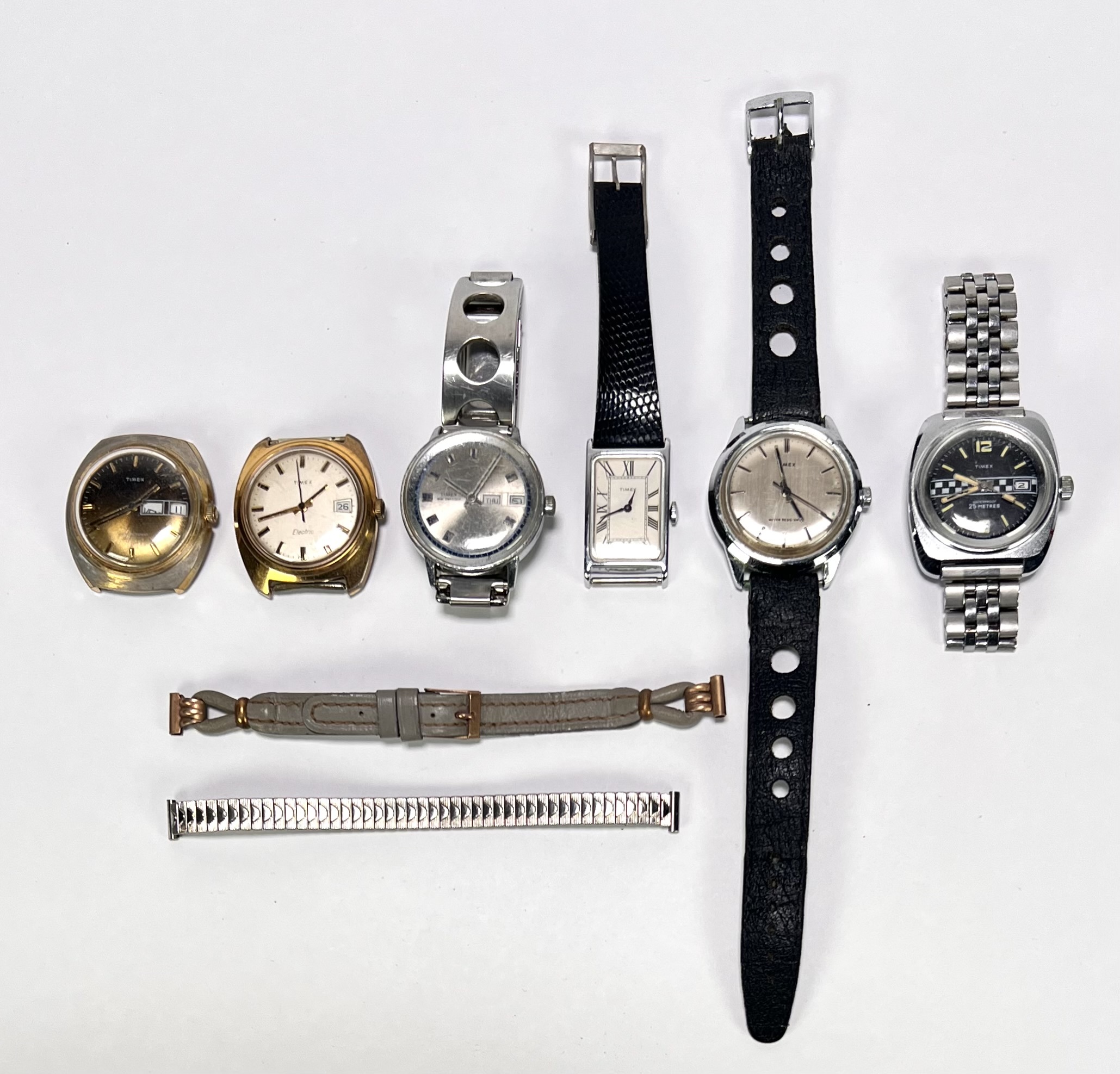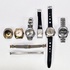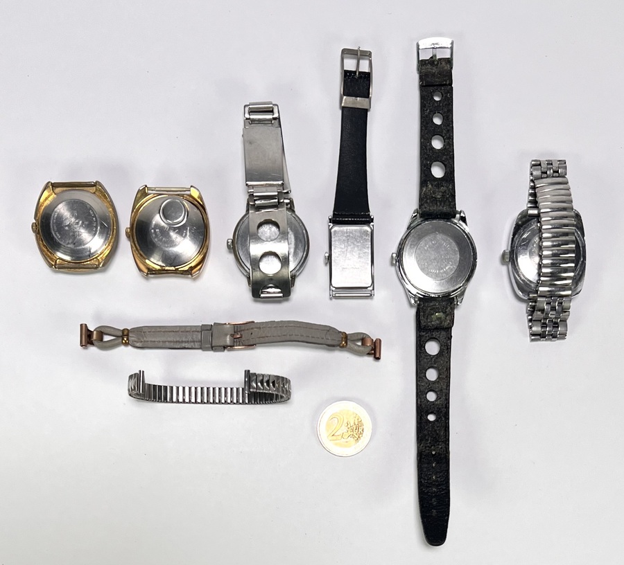 Convoluut horloges van goudkleurig en verchroomd metaal, bestaande uit vintage herenhorloges en horlogebanden. De ontwerpen variëren van klassieke rechthoekige kasten tot robuuste ontwerpen. De collectie dateert van omstreeks 1970–1980. De horloges zelf beoordelen? Je bent welkom op onze kijkdagen op 10, 11 en 12 april! |
