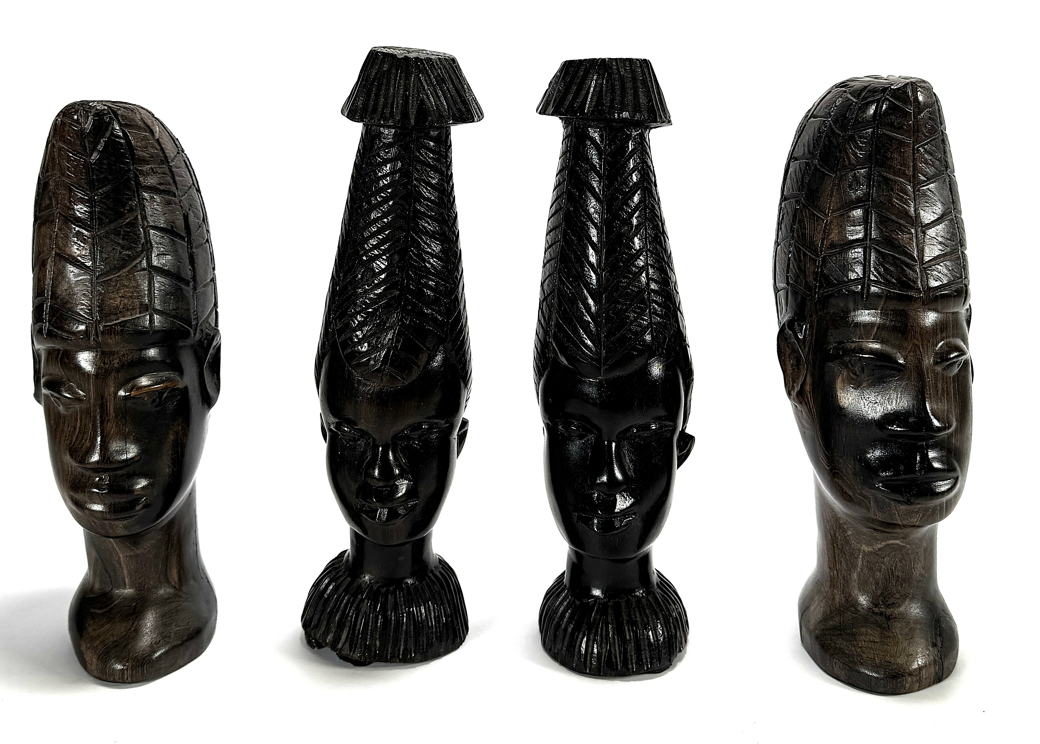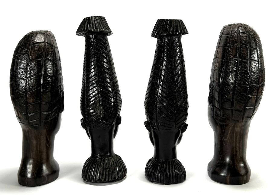 Makonde beelden uit Tanzania, tweede helft 20e eeuw, uitgevoerd in donker hout. De vier beelden tonen hoofden met karakteristieke, verticaal verlengde coiffures en lineaire graveringen. Wil je direct deelnemen? Plaats vanaf 3 april alvast een schriftelijk bod via onze website! |