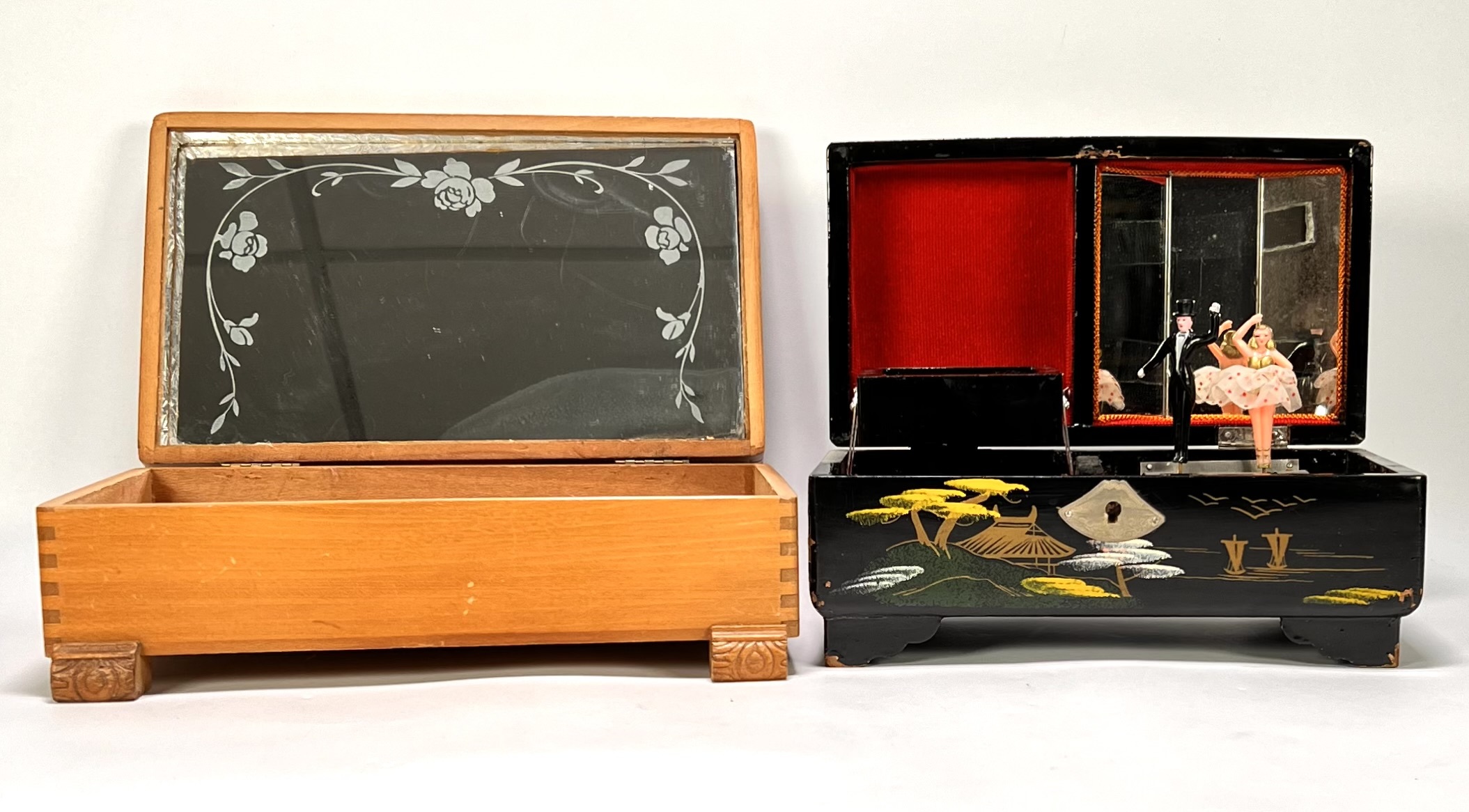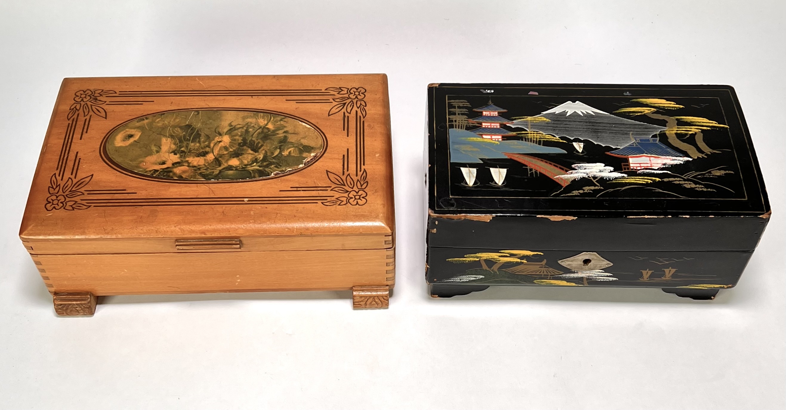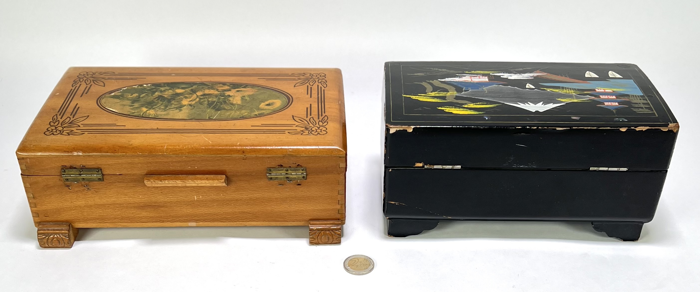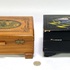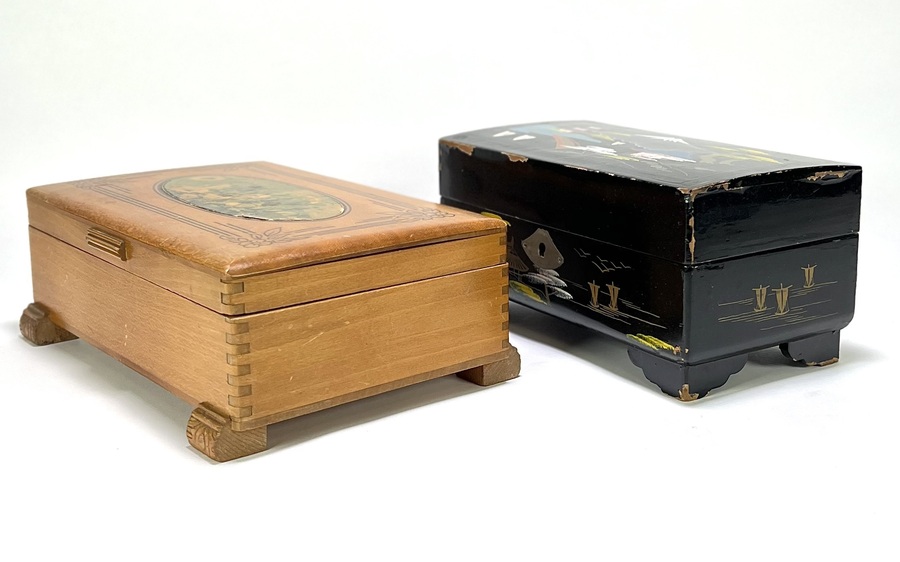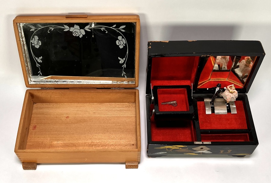Een muziekdoos met Japanse decoratie en een licht houten juwelenkistje. De zwarte lakdoos toont een berglandschap en bevat een mechaniek met twee dansende figuren op rood velours. Het juwelenkistje is uitgevoerd met een binnenspiegel met gegraveerd roosmotief. Datering tweede helft 20e eeuw.