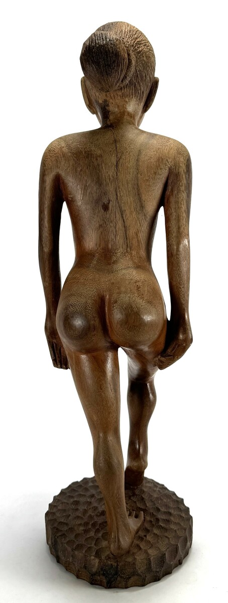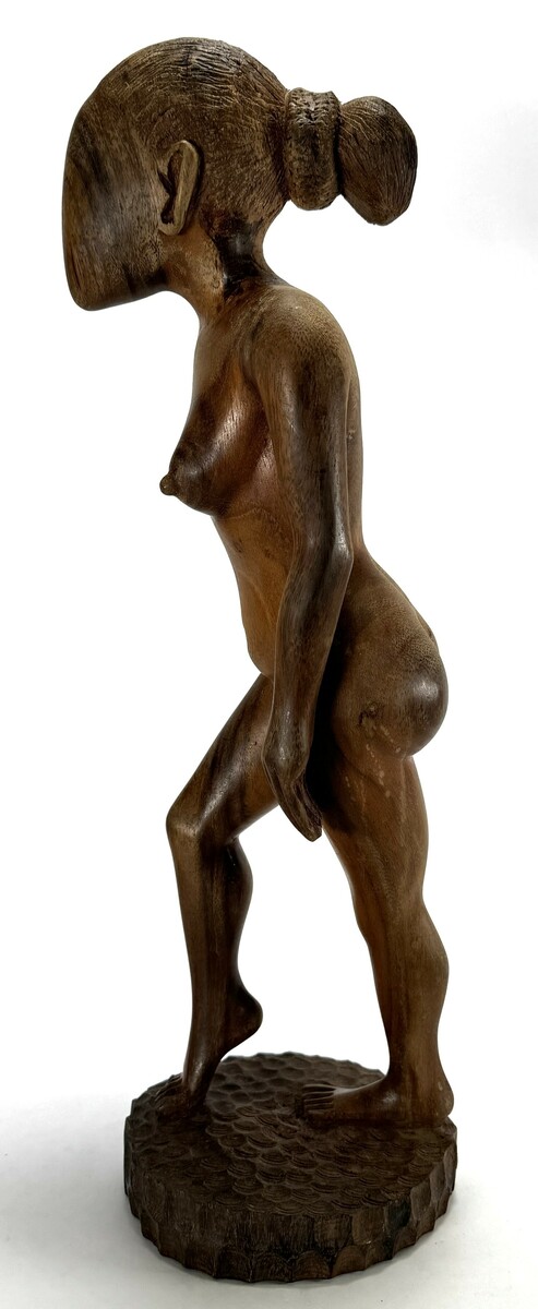 Oost-Afrikaans beeld uit de late 20e eeuw, vervaardigd uit donker gepolijst hardhout. De gestileerde naakte vrouwelijke figuur wordt weergegeven in een dynamische houding op een geciseleerde ronde basis. Klaar om te bieden? Registreer je nu en doe mee aan de veiling! |