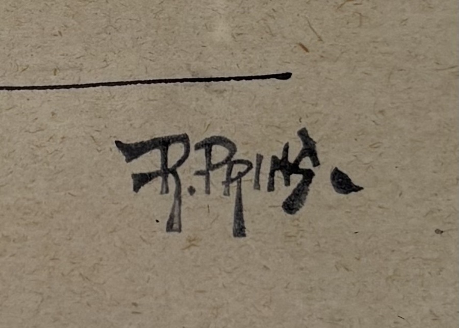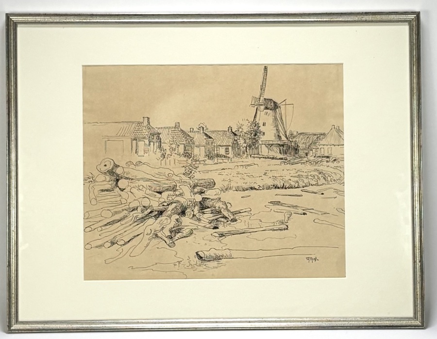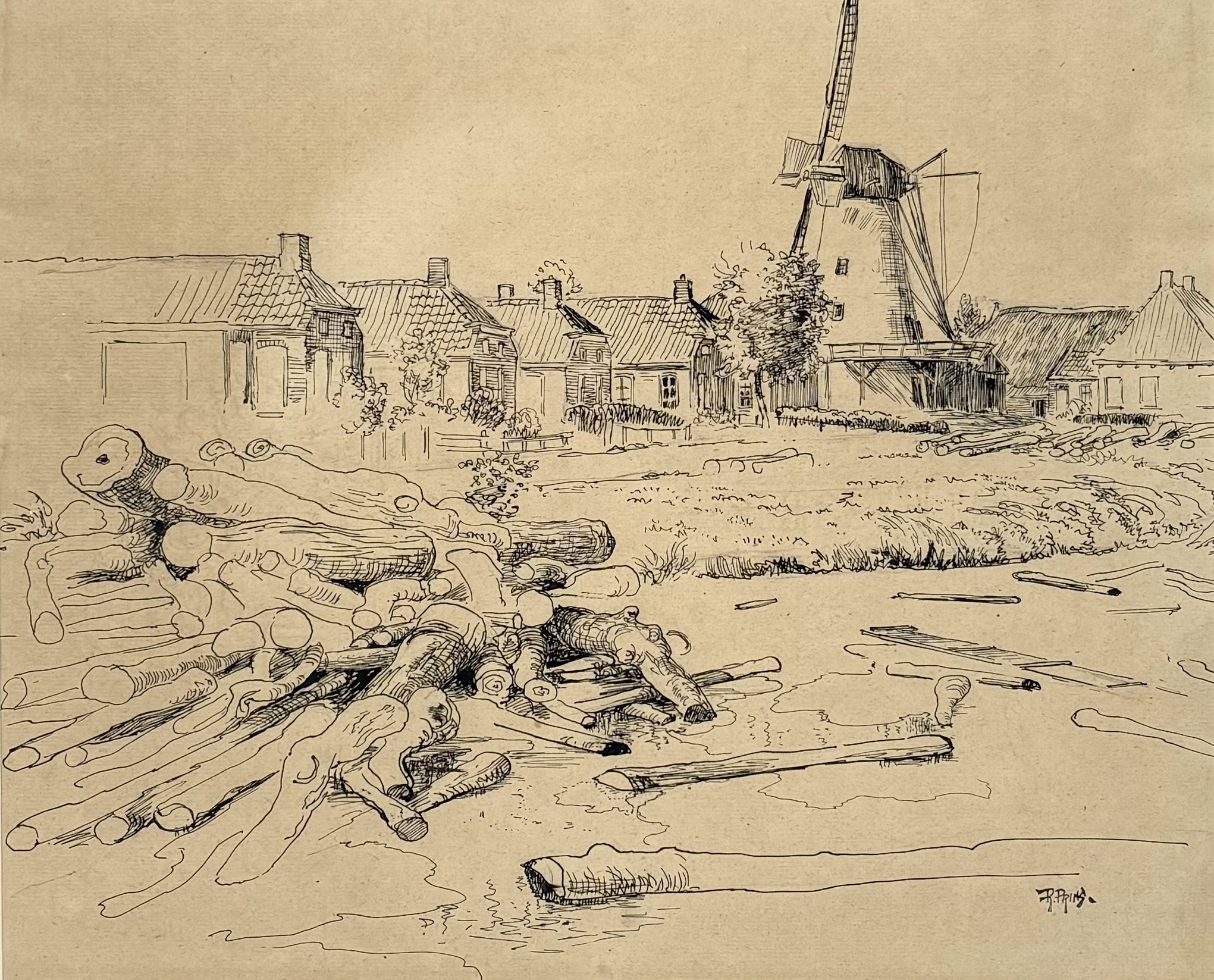 Tekening door Riekle Prins (1905–1954), pentekening op papier, toont een dorpsgezicht met een stellingmolen en gestapeld hout. Gesigneerd rechtsonder, datering circa 1940 en een Noord-Nederlandse herkomst. Geïnteresseerd? Bezoek onze kijkdagen op 10, 11 en 12 april van 11:00 tot 17:00 uur! |