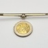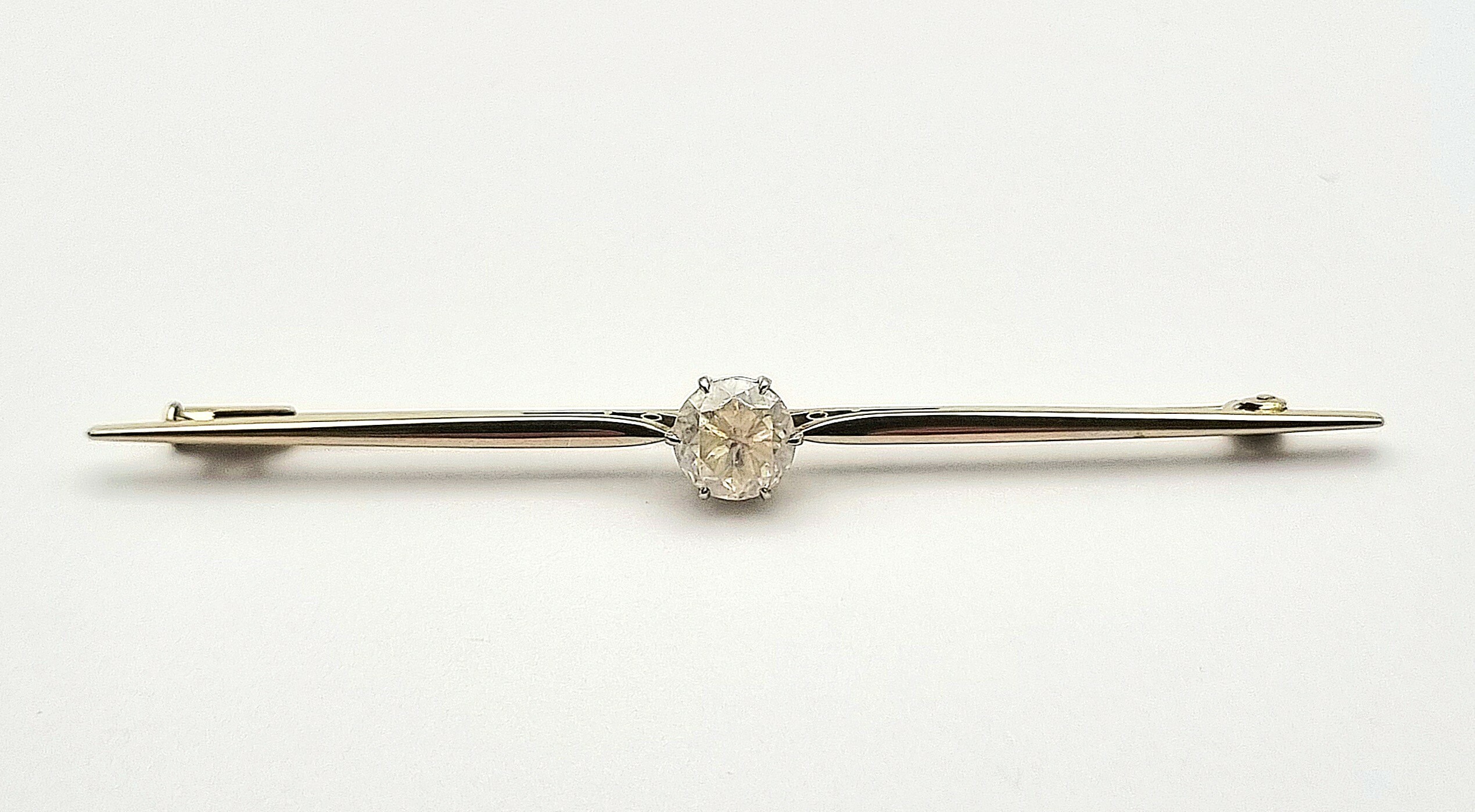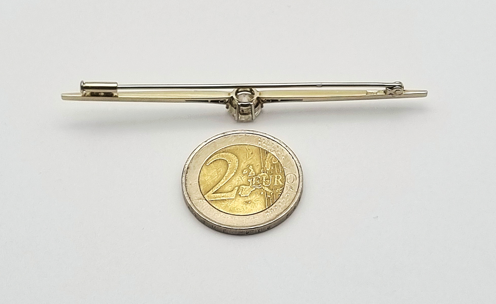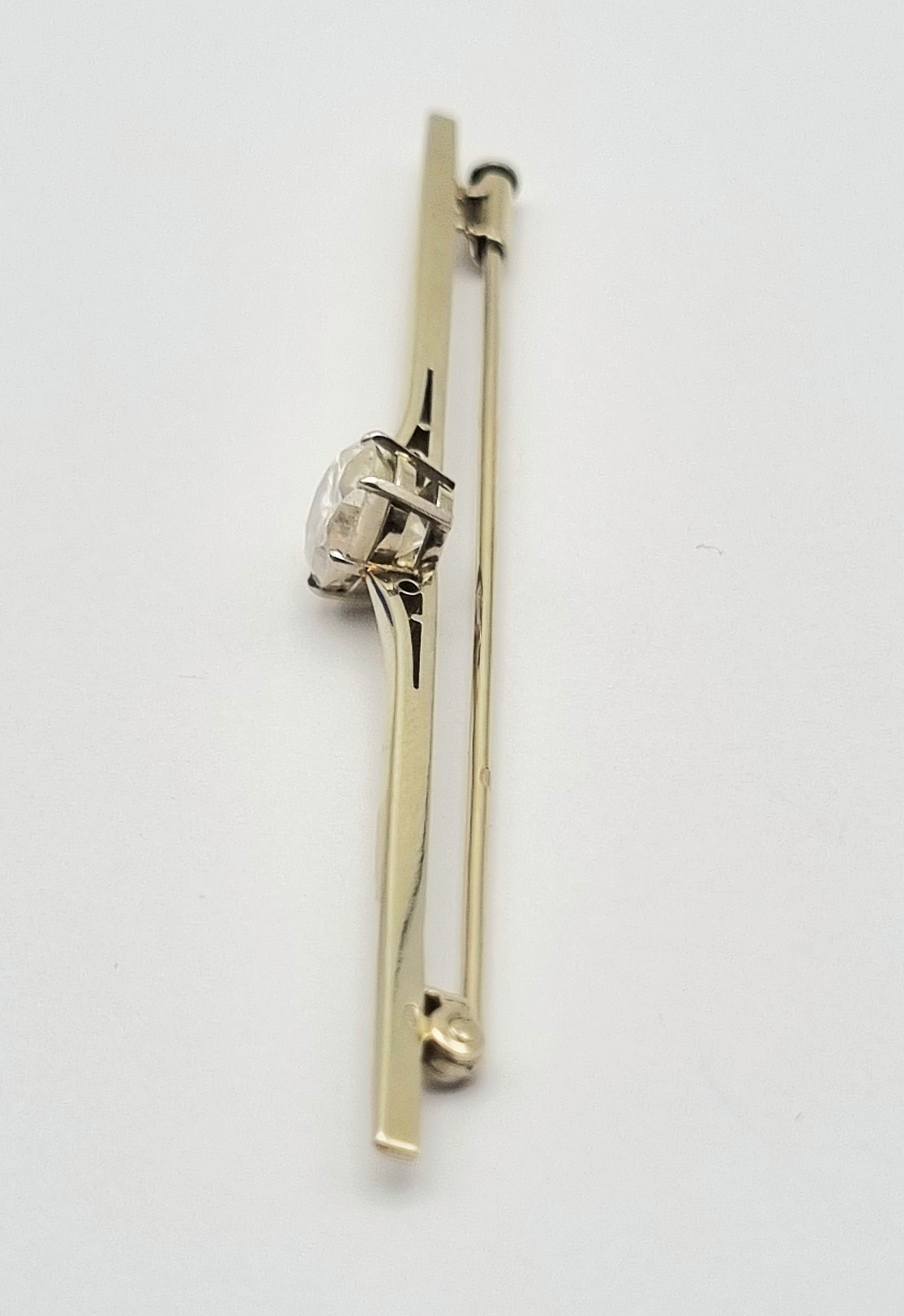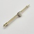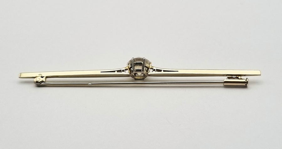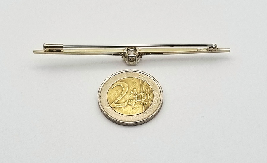 Broche in Art Decostijl, vervaardigd uit 14 karaat witgoud met een centraal geplaatst rond geslepen kristal in open chatonzetting. De slanke staafvorm wordt geaccentueerd door kleine opengewerkte driehoek motieven naast de steen. Gemerkt met Nederlands eikenblad, 585 en meesterteken WVZ. De broche dateert uit de tweede helft van de 20e eeuw. Eerst de broche zien voordat je biedt? Bezoek onze kijkdagen op 10, 11 en 12 april! |