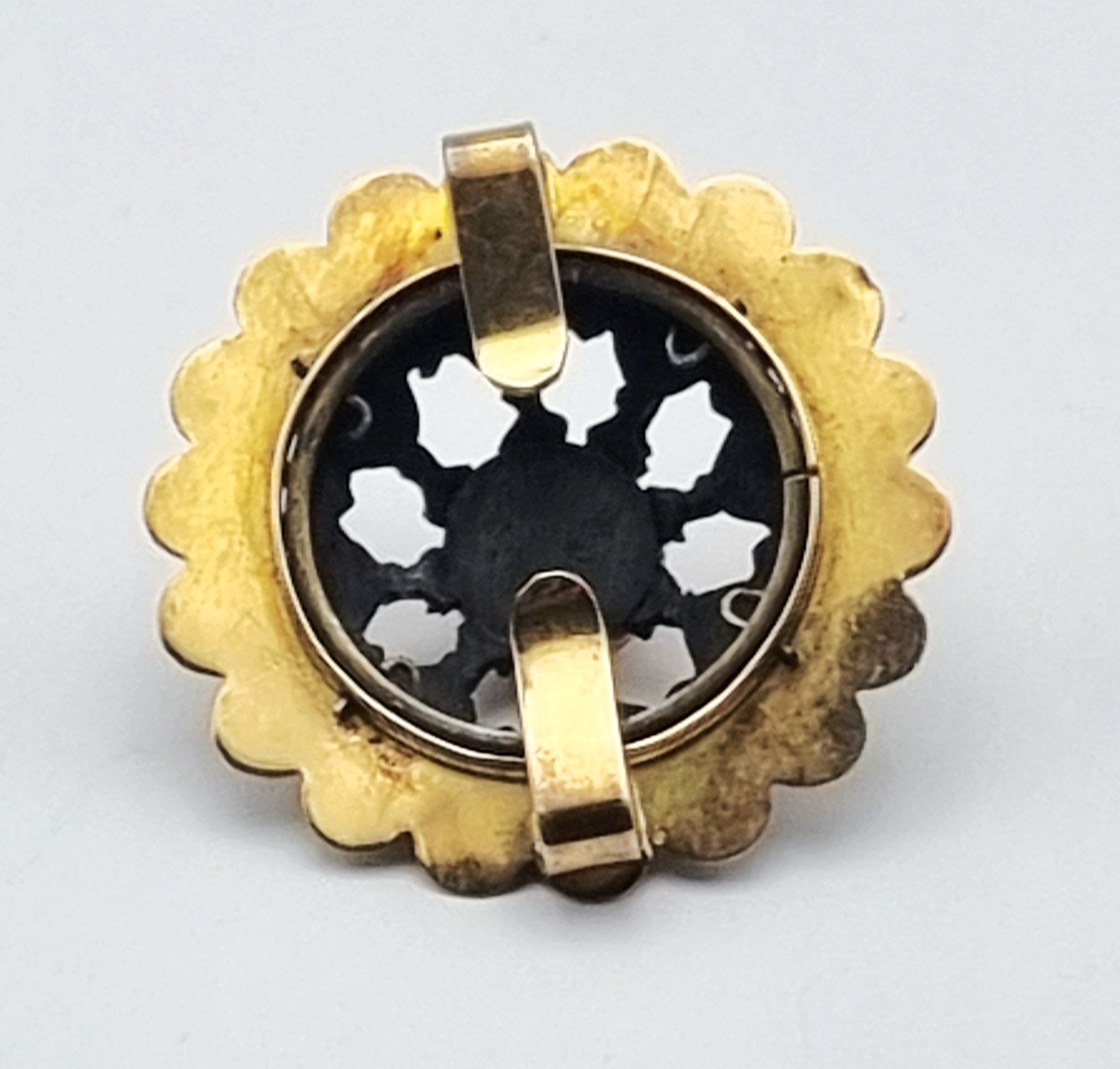 Gouden 14-karaats sieraad om te bevestigen op een armband. Uitgevoerd met bloedkoraal in een centraal geplaatste cabochon in een verhoogde zetting. De ajour bewerkte binnenzijde van geelgoud is getoetst als 8-karaats gehalte, terwijl de buitenrand een officieel 585 goudmerk draagt. Datering eerste helft 20e eeuw. Kom langs tijdens de kijkdagen (10 t/m 12 april) en ontdek deze broche zelf! |