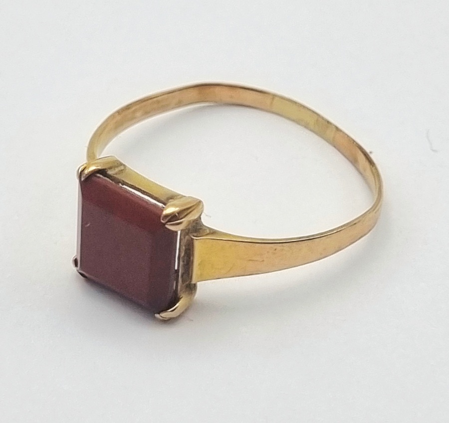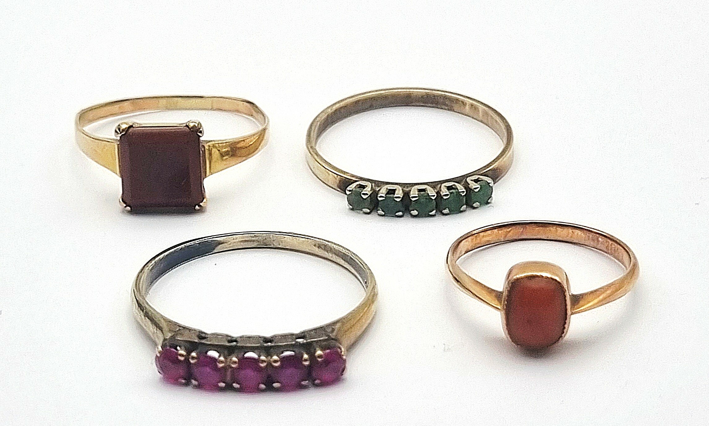 Vier gouden ringen, waarvan twee gemerkt 585 14 karaat, één getoetst als 14 karaat goud en één gemerkt 333 8 karaat. Uitgevoerd met groene en paarse stenen, jaspis en bloedkoraal. Datering tweede helft 20e eeuw. Kom langs tijdens de kijkdagen (10 t/m 12 april) en ontdek de ringen zelf! |