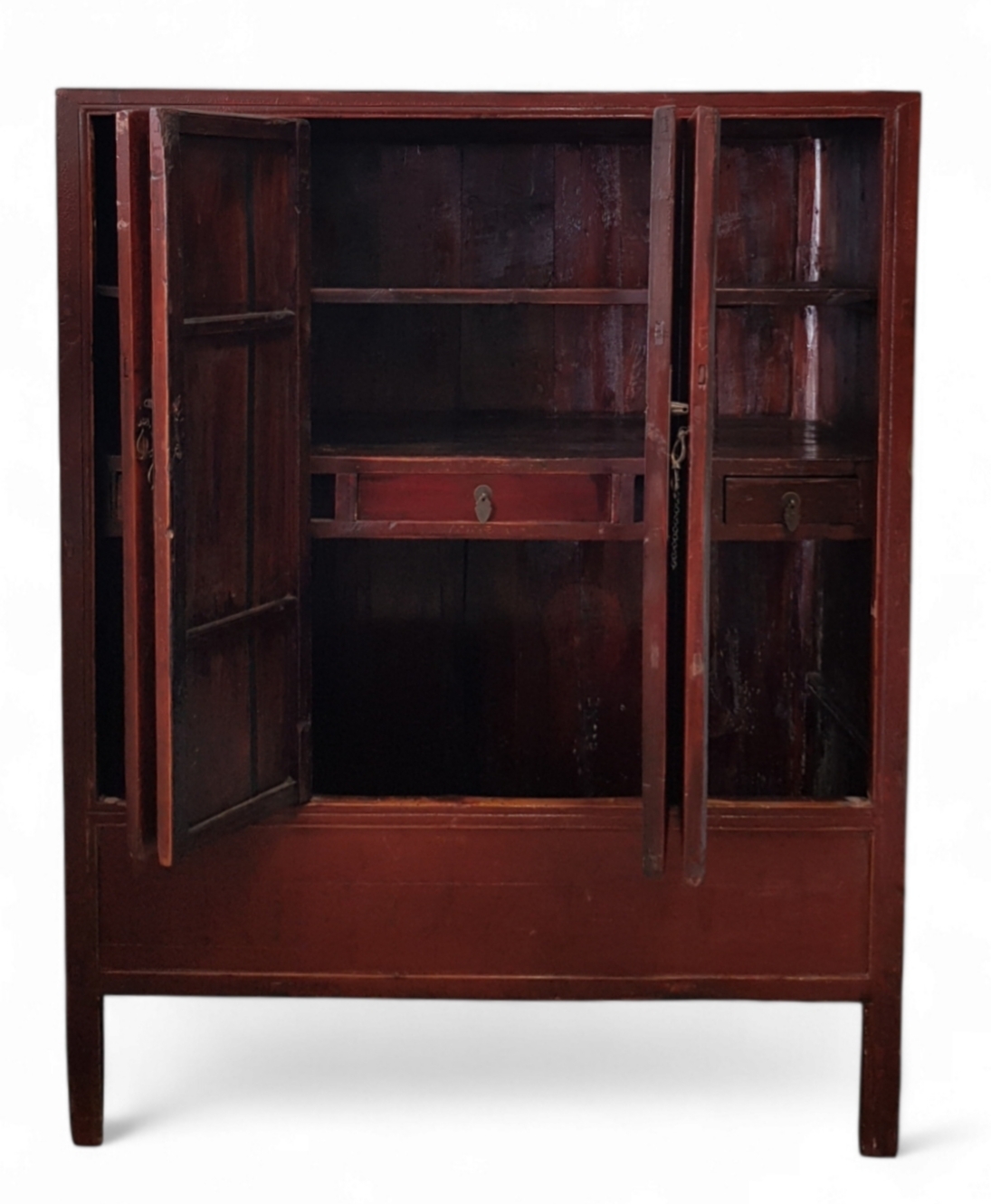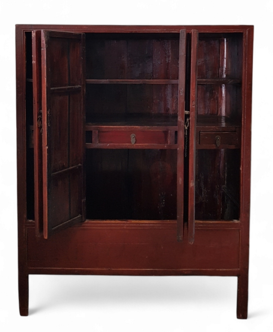 Kast uit de Qing-periode, vervaardigd uit hout met rood lakwerk en voorzien van handbeschilderde decors. De vier deuren tonen ovale medaillons met figuratieve voorstellingen van figuren in een interieur. Kenmerkend is het gecraqueleerde oppervlak en de rechthoekige cartouches met kalligrafie. Voorzien van messing beslag en ringgrepen. De kast dateert van omstreeks 1900 en heeft een herkomst in China. Geïnteresseerd? Bezoek onze kijkdagen op 10, 11 en 12 april van 11:00 tot 17:00 uur! |
