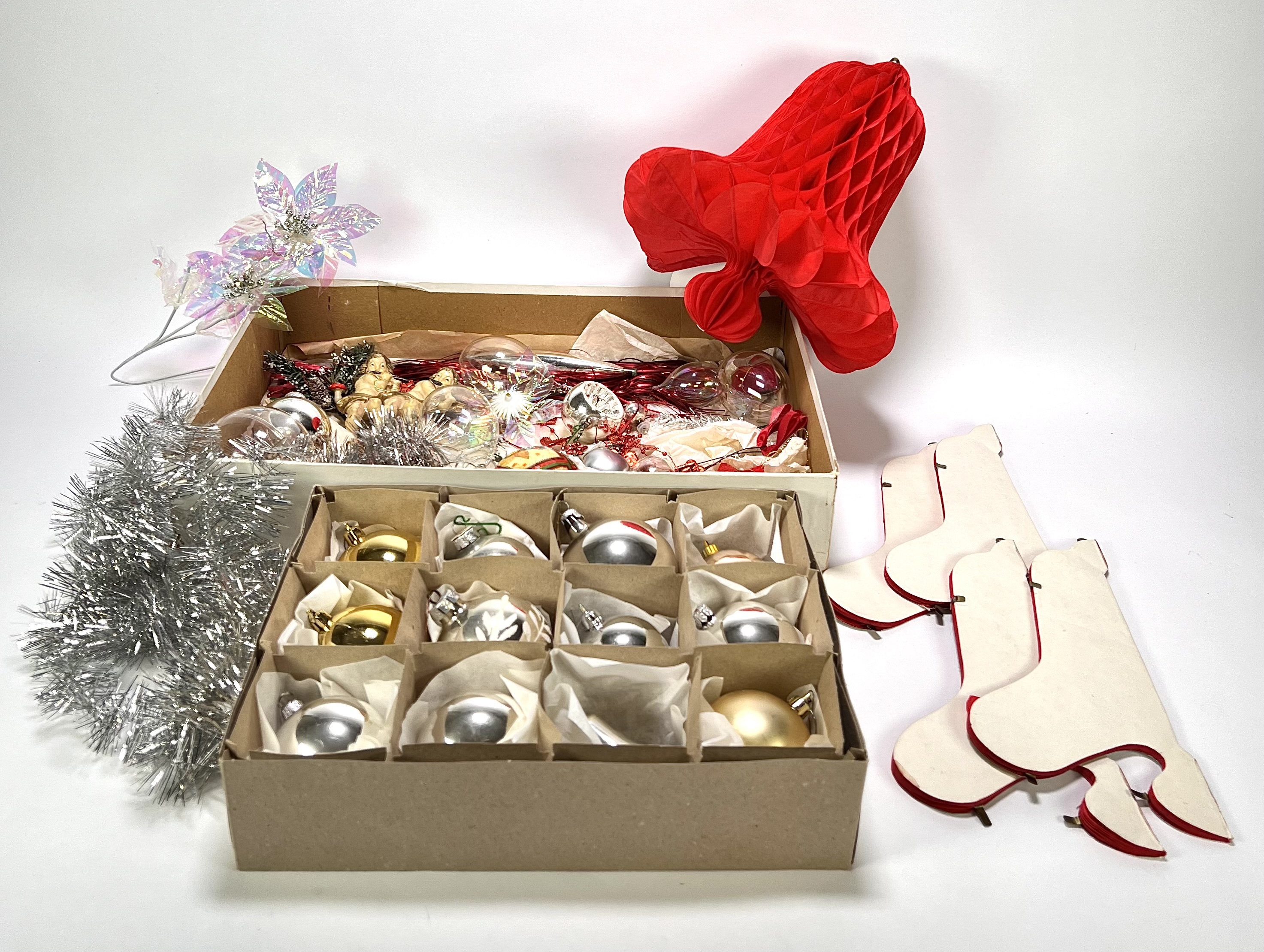 Verzameling kerstversiering van glas, papier en textiel, West-Europa, circa 1980