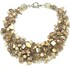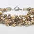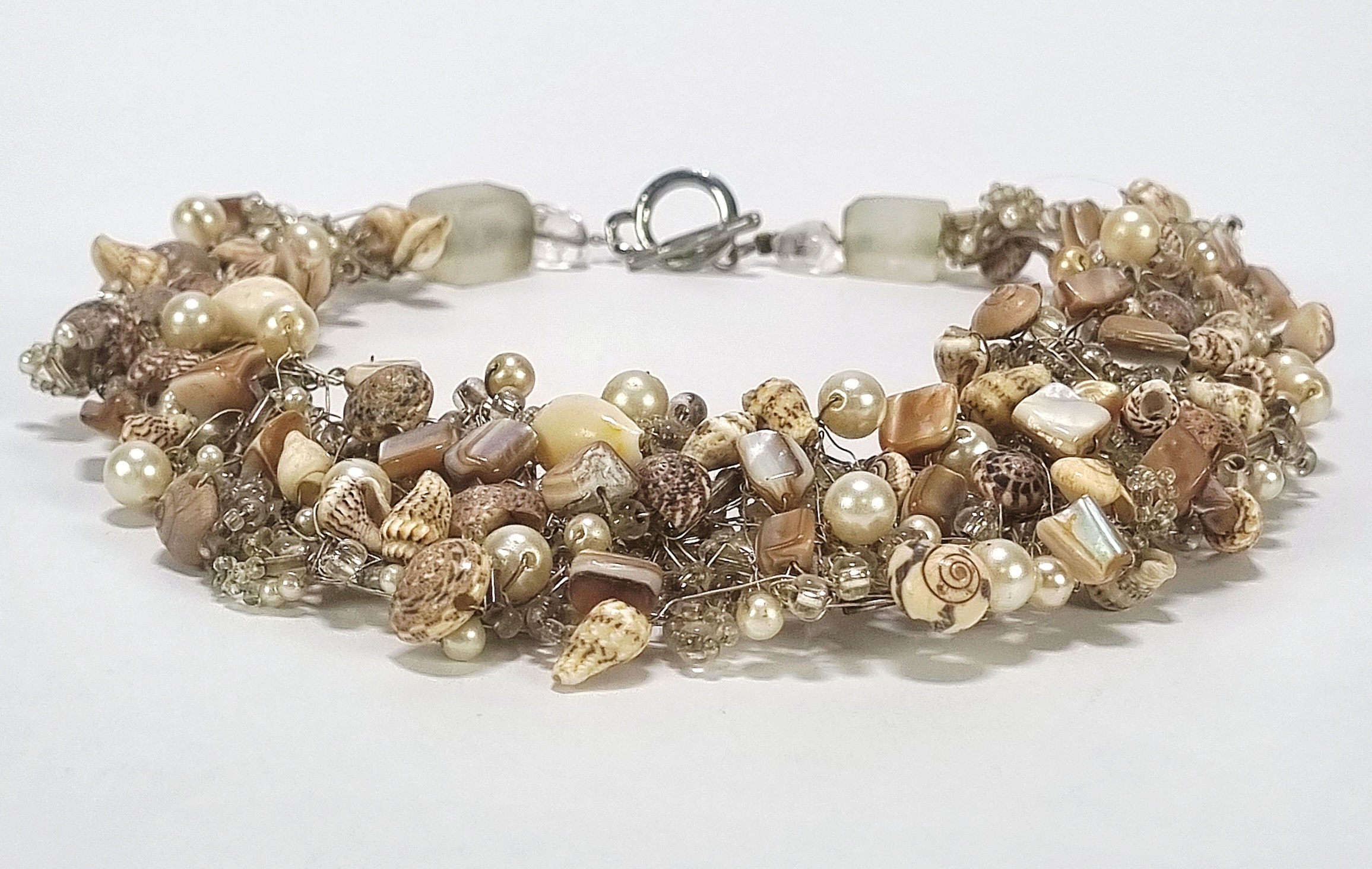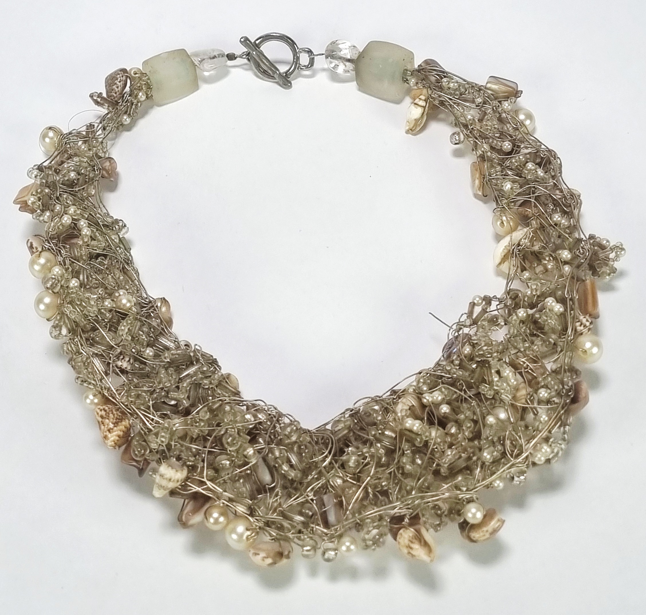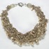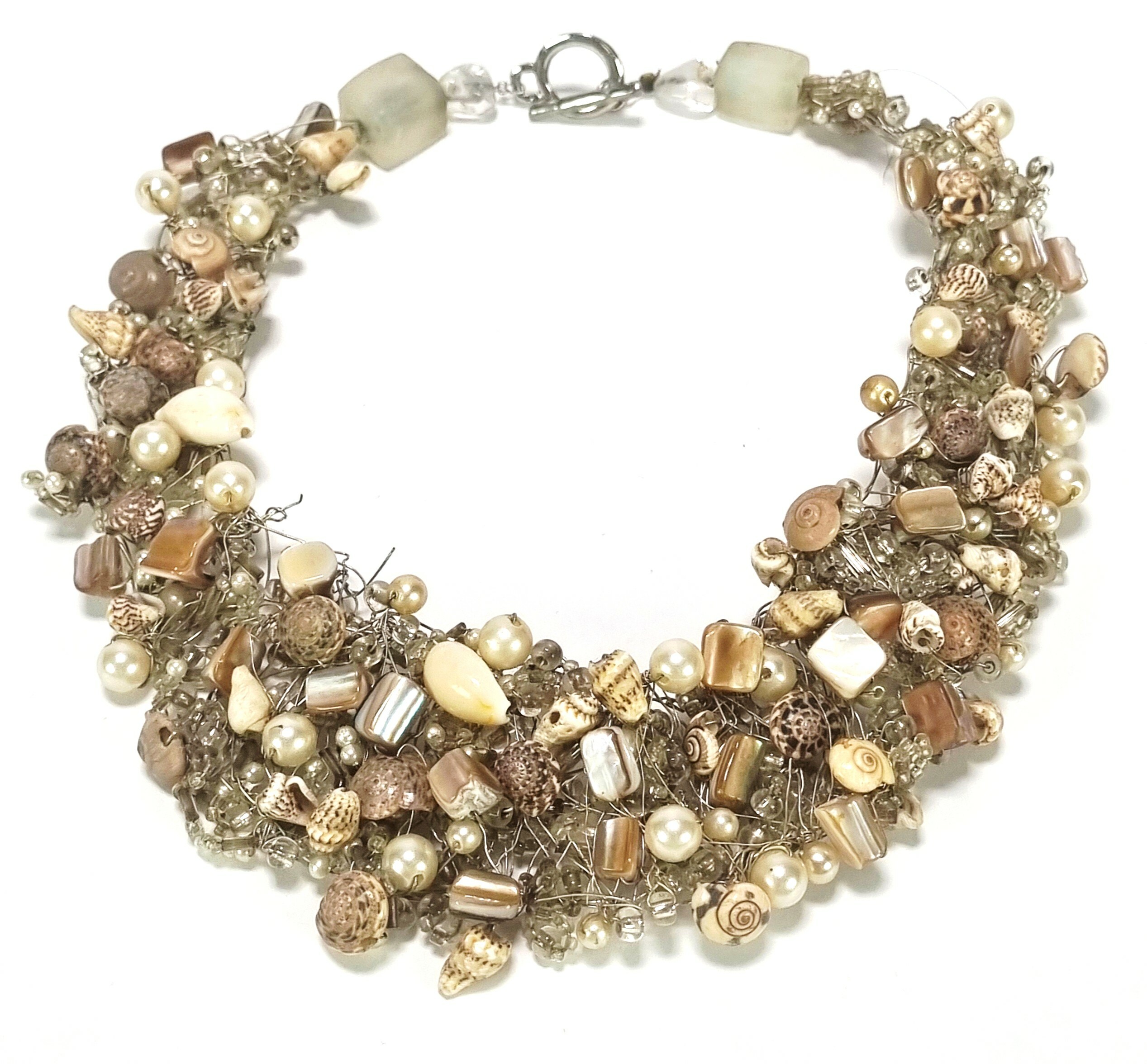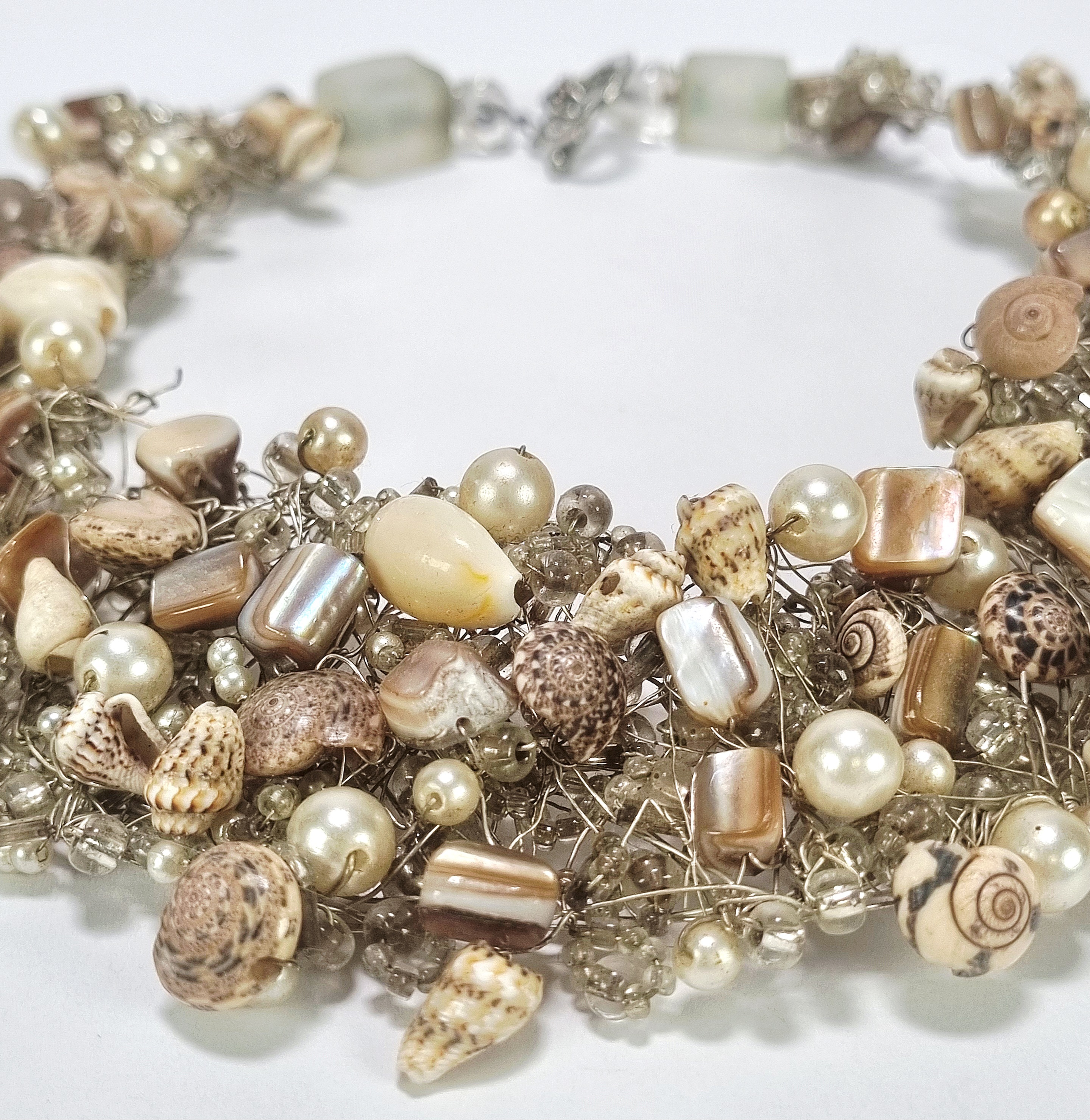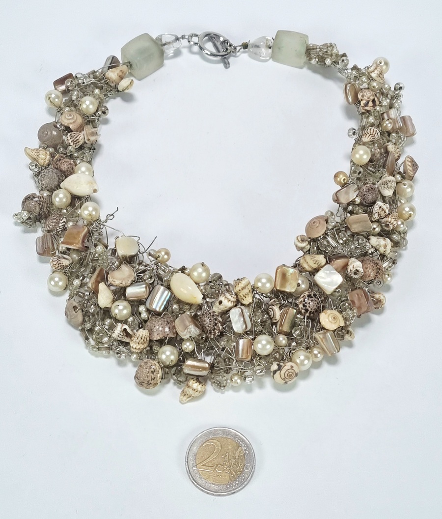 Halsketting van metaal uitgevoerd met een rijk decor van diverse schelpen, gefacetteerde glaskralen en crèmekleurige plastic parels. De halsketting kenmerkt zich door het complexe vlechtwerk van fijne metaaldraden waarin de verschillende elementen zijn verwerkt. Datering eind 20e eeuw. Voeg deze halsketting toe aan je verzameling en doe een bod! |