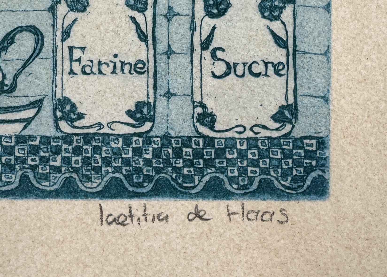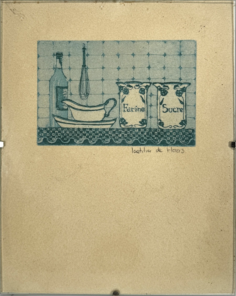 Ets door Laetitia de Haas (1971), uitgevoerd als kleurenets op papier, toont een keukenstilleven in eigentijdse realistische stijl. Afgebeeld zijn flessen, een garde en voorraadpotten tegen een betegelde achtergrond. De ets is rechtsonder gesigneerd, Nederlandse grafiek uit de tweede helft van de 20e eeuw. Wil je direct deelnemen? Plaats vanaf 3 april alvast een schriftelijk bod via onze website! |