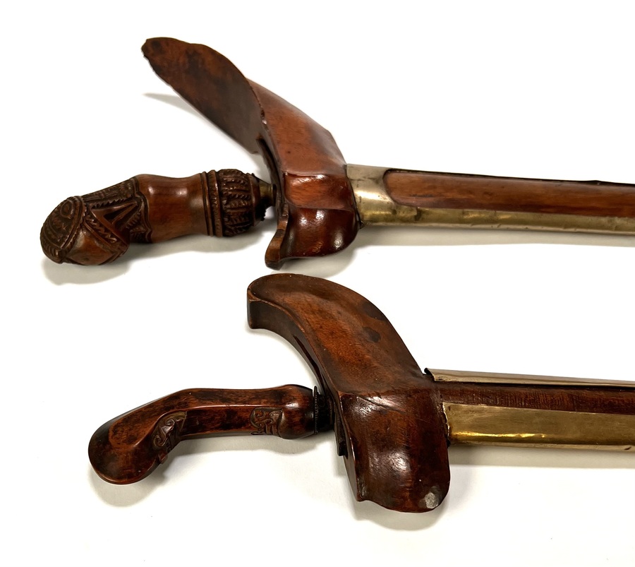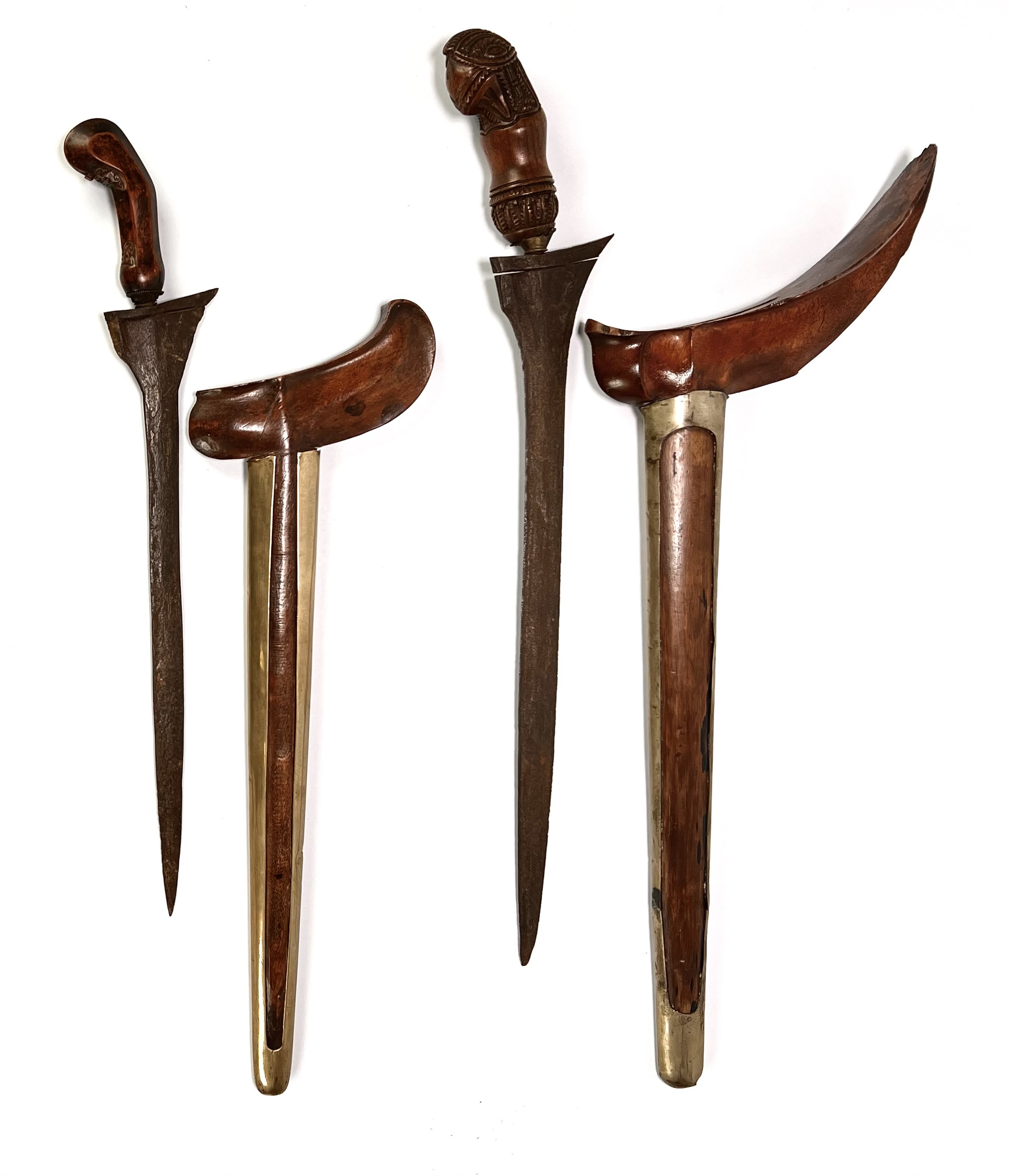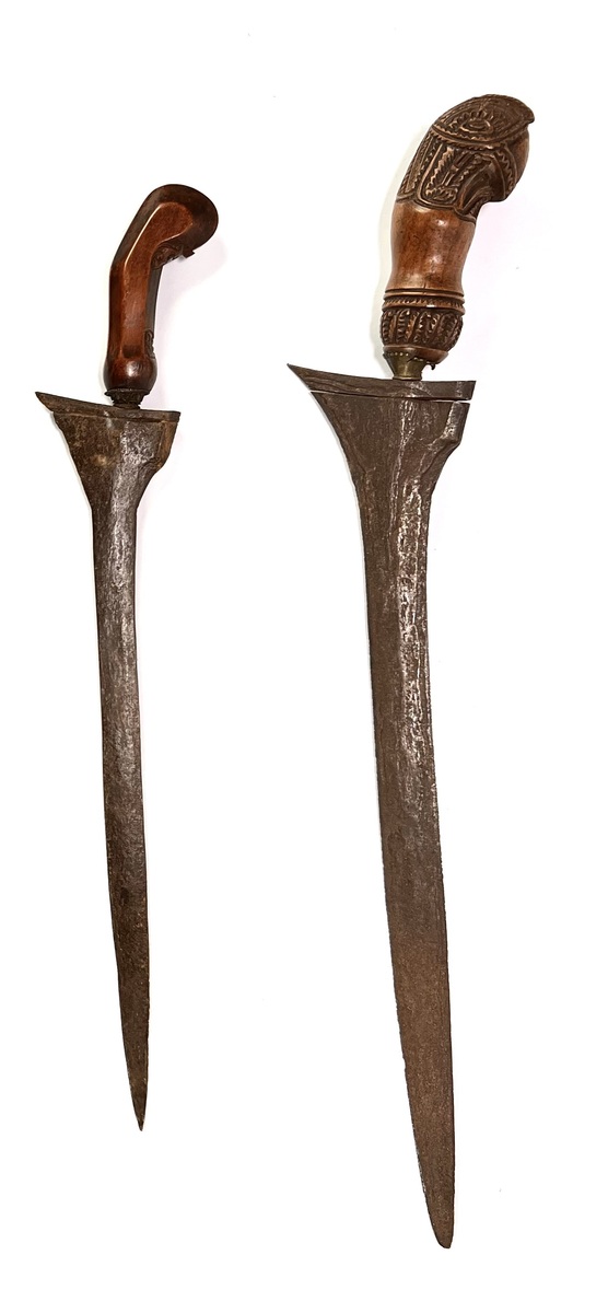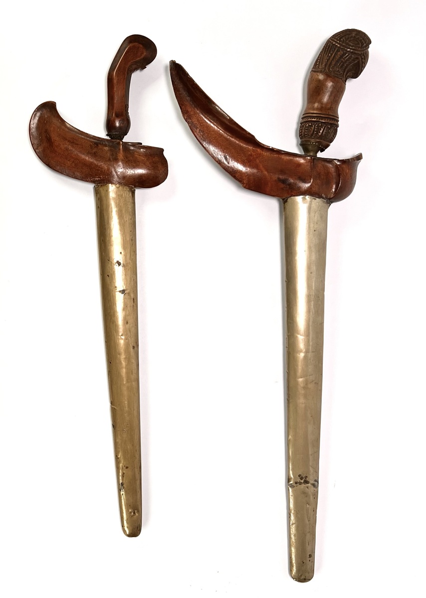 Javaanse krissen, 19e-eeuws, een kris in Surakarta-stijl toont een lurus-kling met pamor wos wutah en nunggak semi-greep. De tweede kris toont een gedetailleerde donoriko-greep en ladrang-schede, Madura. Beide krissen zijn voorzien van messing pendok-overtrekken. Geïnteresseerd? Bezoek onze kijkdagen op 10, 11 en 12 april van 11:00 tot 17:00 uur! |