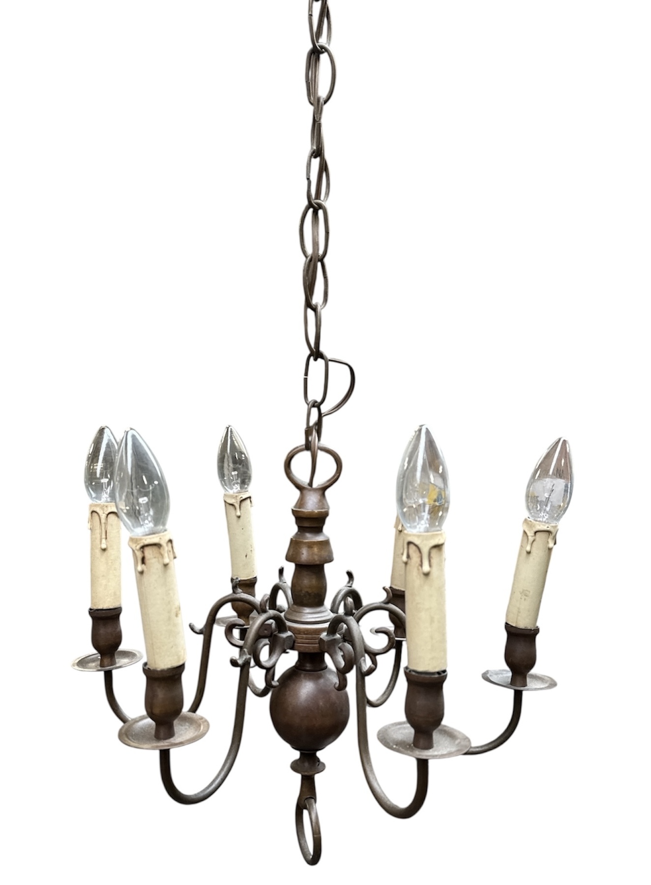 Bolkroon in barokstijl, vervaardigd uit gegoten messing met een balustervormige stam en een geprononceerde bol aan de onderzijde. De zes S-vormige armen zijn voorzien van kaarsenhouders en druipschalen, uitgevoerd met witte kunststof hulzen. De ophanging geschiedt middels een messing schakelketting. De bolkroon dateert uit de 20e eeuw en heeft een Nederlandse herkomst. Registreer nu en bied eenvoudig online mee op deze bolkroon! |
