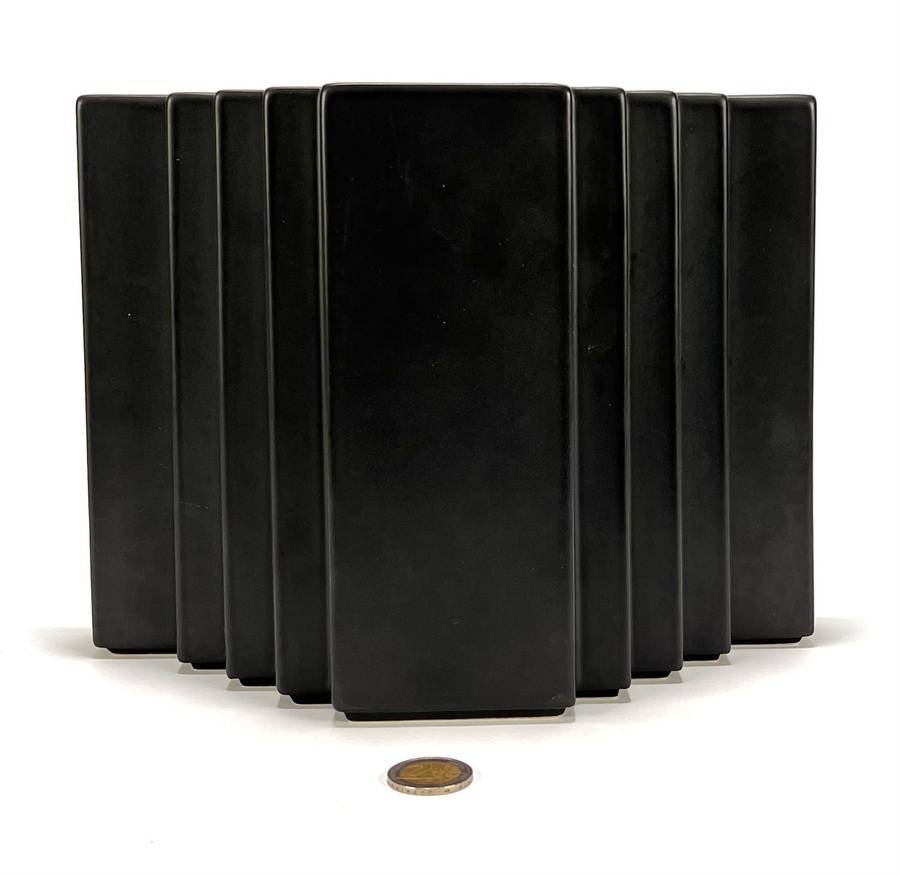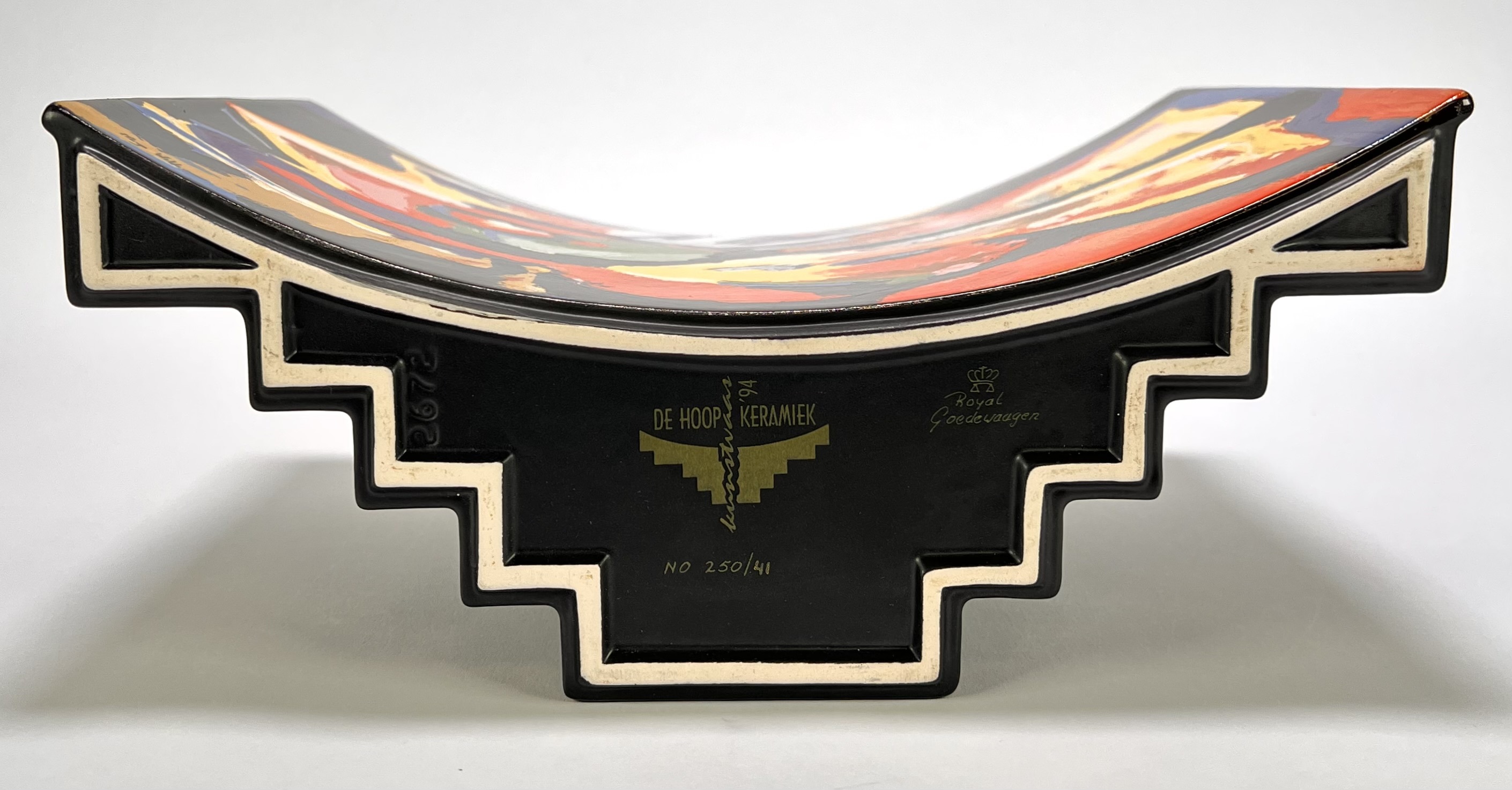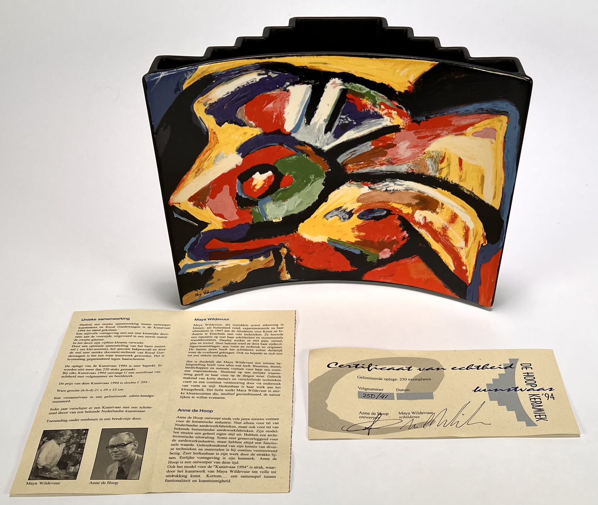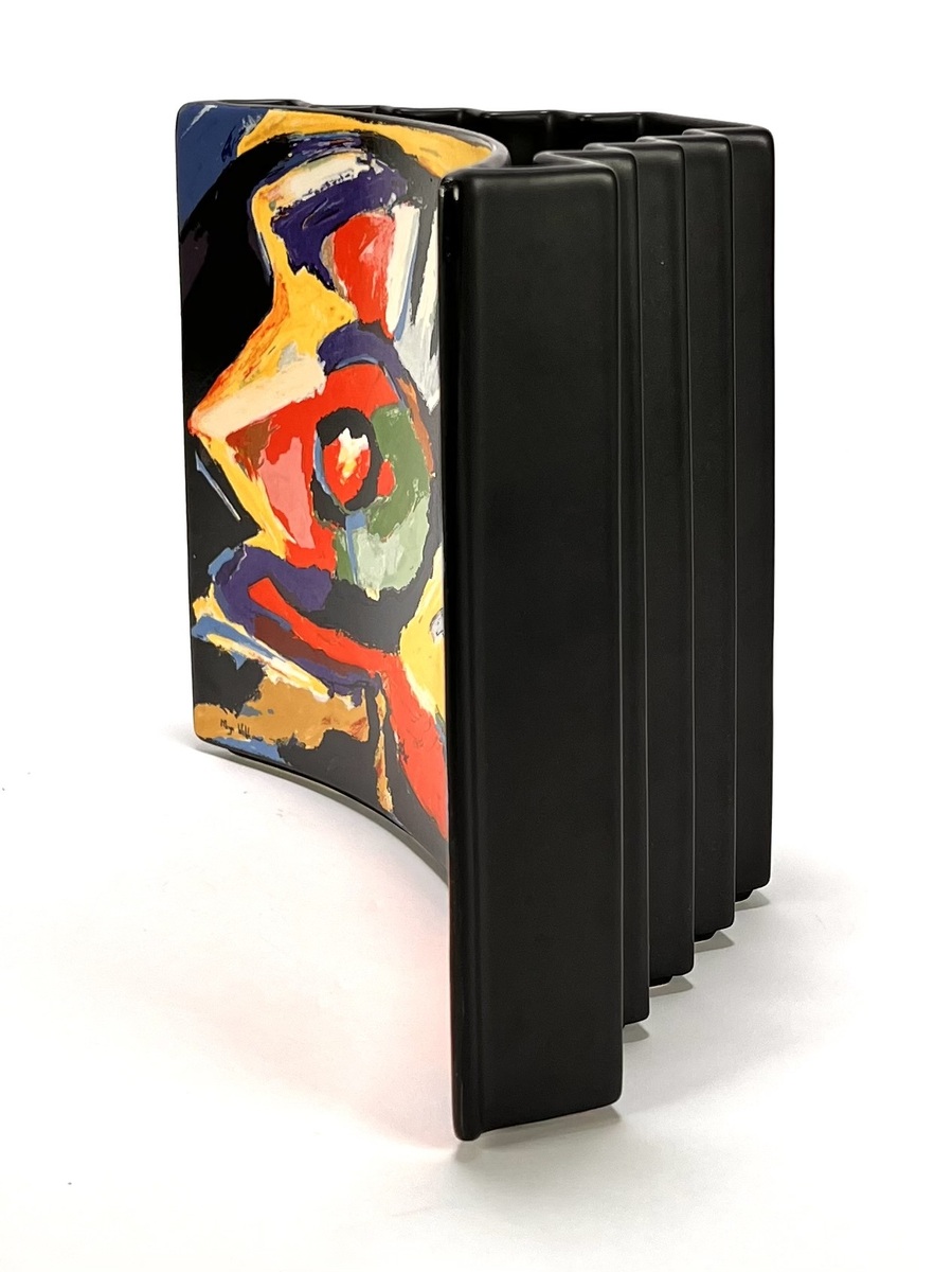 Vaas van Royal Goedewaagen naar ontwerp van Anne de Hoop en Maya Wildevuur (1944–2022), uit de postmoderne periode, vervaardigd uit aardewerk met handbeschilderd abstract expressionistisch decor op matzwarte glazuur. De vormgeving combineert een gebogen voorzijde met een getrapt corpus. Gemerkt aan de onderzijde met fabrieksstempel, jaartal 1994 en oplagennummer 41/250. De vaas heeft een Nederlandse herkomst en inclusief origineel certificaat. Klaar om te bieden? Registreer je nu en doe mee aan de veiling! |