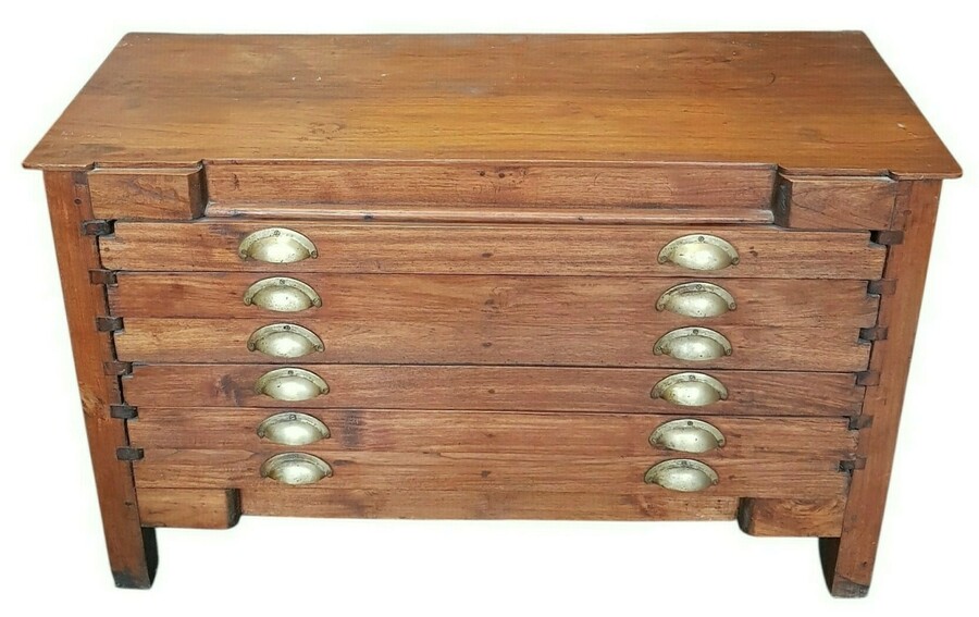 Kastje in koloniale stijl, vervaardigd uit Indonesisch teakhout met messing beslag. Het kastje is geconstrueerd met zwaluwstaartverbindingen en beschikt over zes laden, elk voorzien van halfronde komgrepen. Het kastje dateert uit de periode 1920–1940 en heeft een herkomst in Nederlands-Indië. Klaar om te bieden? Registreer je nu en doe mee aan de veiling! |