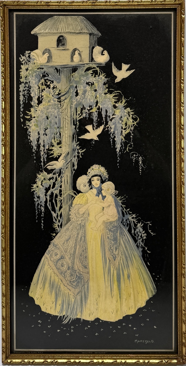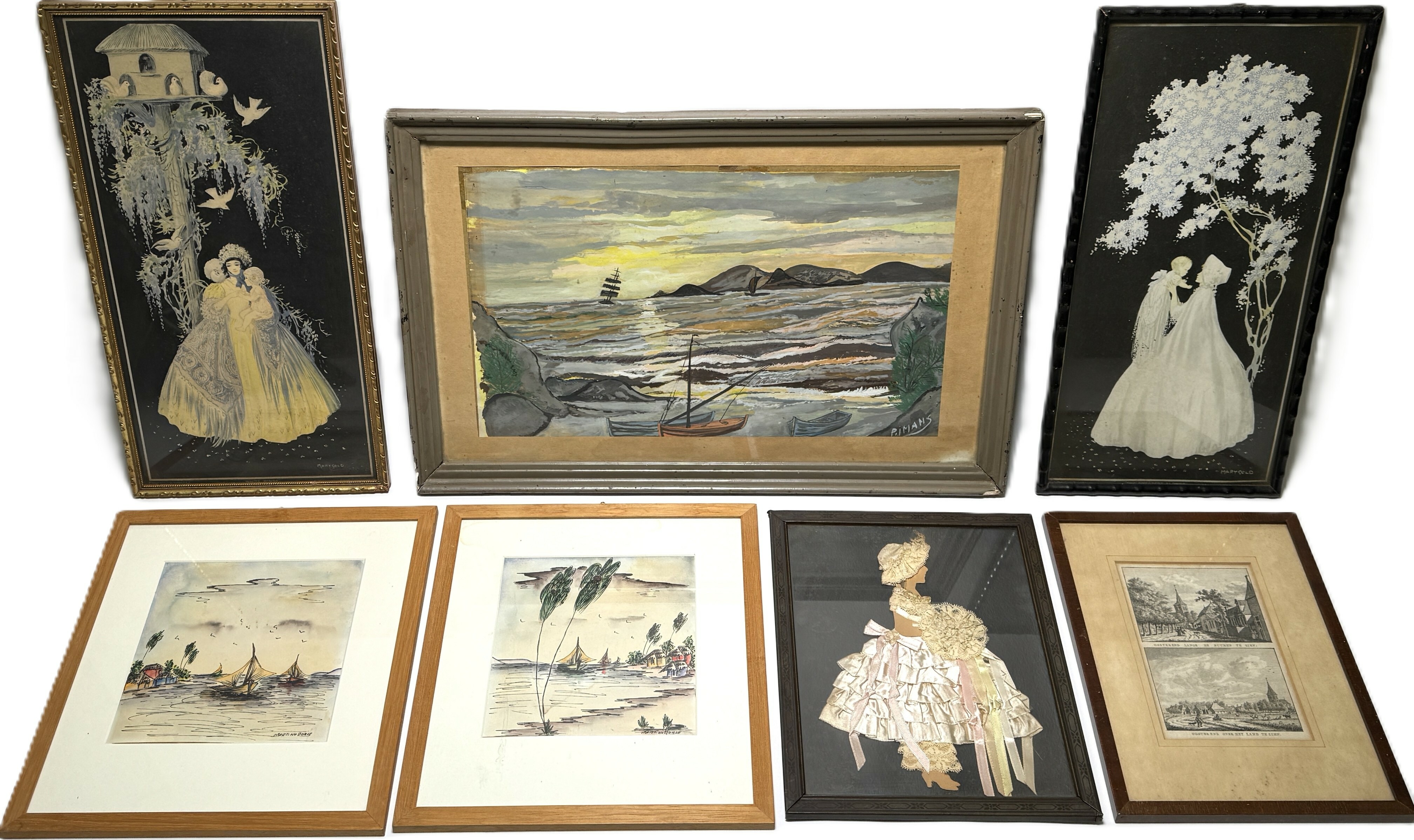 Convoluut lijstwerk samengesteld uit aquarellen, gravures en decoraties in lijst; maritieme voorstellingen, twee panelen met goudkleurige en crèmekleurige figuren, twee stadsgezichten en een collage met een modefiguur. Datering midden 20e eeuw en een Europese herkomst. Klaar om te bieden? Registreer je nu en doe mee aan de veiling! |