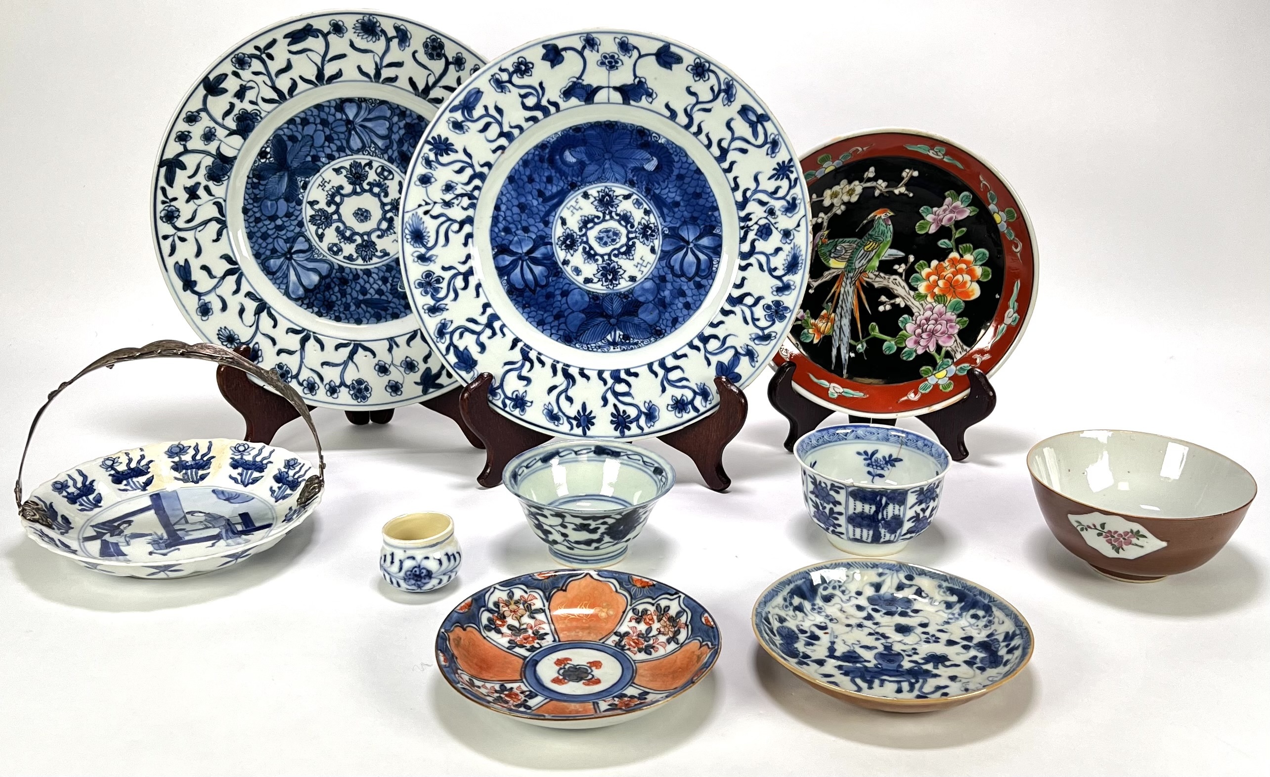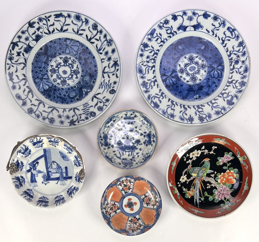 Servies van Chinees exportporselein en Japans Imari, vervaardigd uit handbeschilderd porselein met onderglazuur blauwe en overglazuur polychrome decors. De verzameling omvat borden met florale motieven en een schaaltje met zilveren hengsel voorzien van figuratieve scènes. Verschillende voorwerpen tonen karakteristieke zegelmerken aan de onderzijde. Datering 18e en 19e eeuw en een herkomst in Oost-Azië. Eerst het servies zien voordat je biedt? Bezoek onze kijkdagen op 10, 11 en 12 april van 11:00 tot 17:00 uur! |