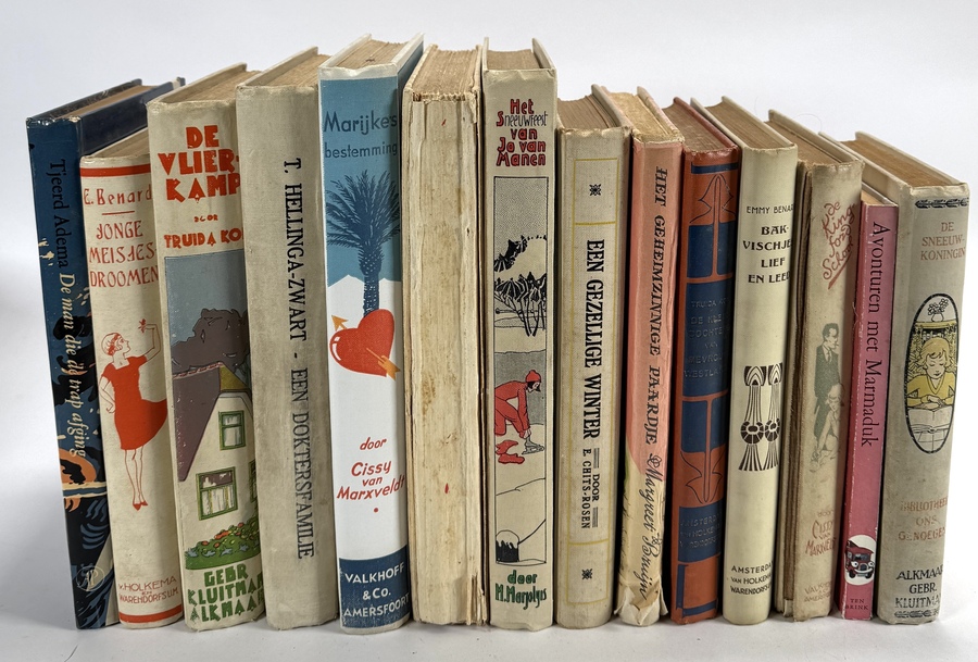 Lot boeken van diverse Nederlandse auteurs vervaardigd uit bedrukt papier, karton en linnen banden met kleurendruk en lijnillustraties. Het lot omvat veertien jeugdboeken waaronder titels van Cissy van Marxveldt, Emmy Benard en M. Marjolijns. Datering eerste helft 20e eeuw. Klaar om te bieden? Registreer je nu en doe mee aan de veiling! |