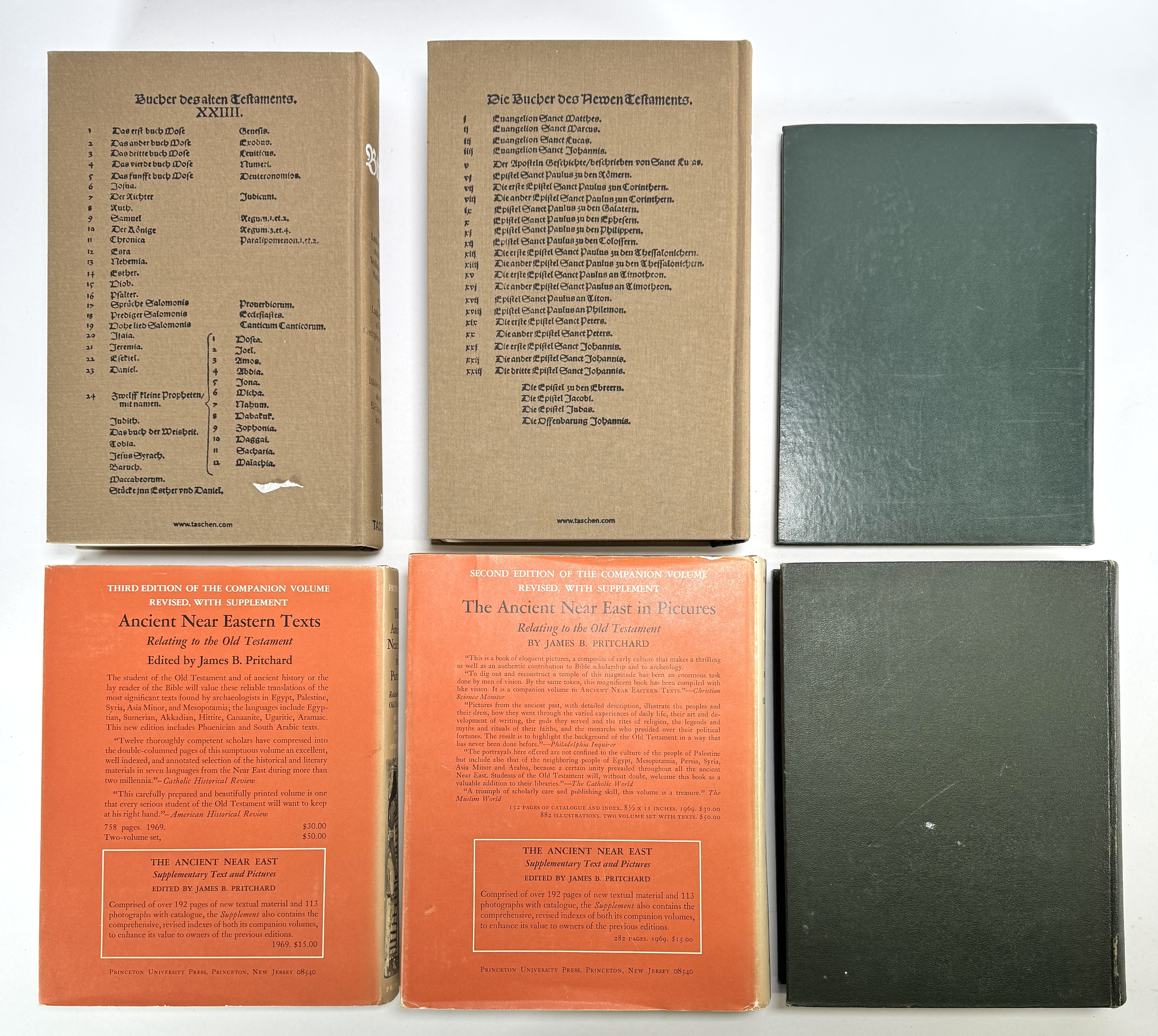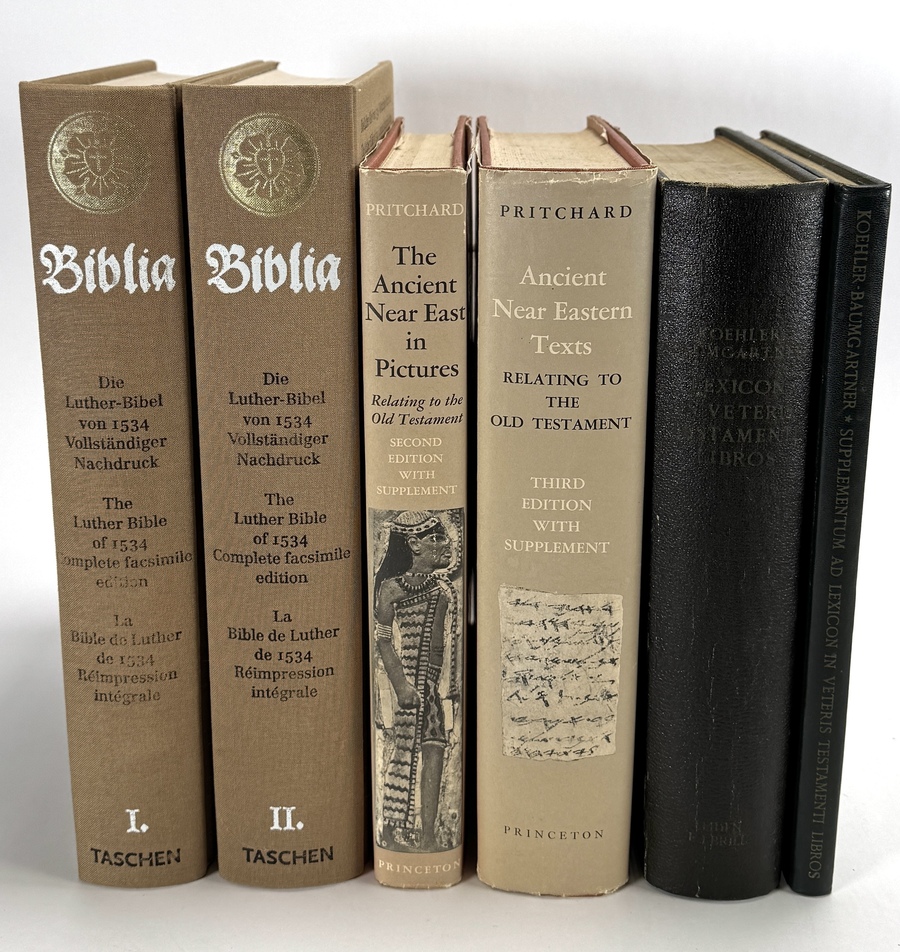 Lot boeken van Koehler, Baumgartner, James B. Pritchard en Taschen, vervaardigd uit linnen en kartonnen uitgeversbanden met stofomslagen en facsimiledruk. Het zesdelige lot omvat oudtestamentische lexica, standaardwerken over het Oude Nabije Oosten en een tweedelige facsimile van de Lutherbijbel van 1534. De uitgaven dateren uit 1953, 1958, 1969 en begin 21e eeuw en hebben een Nederlands, Amerikaans en Duits uitgeversverleden. Wil je direct deelnemen? Plaats vanaf 3 april alvast een schriftelijk bod via onze website! |
