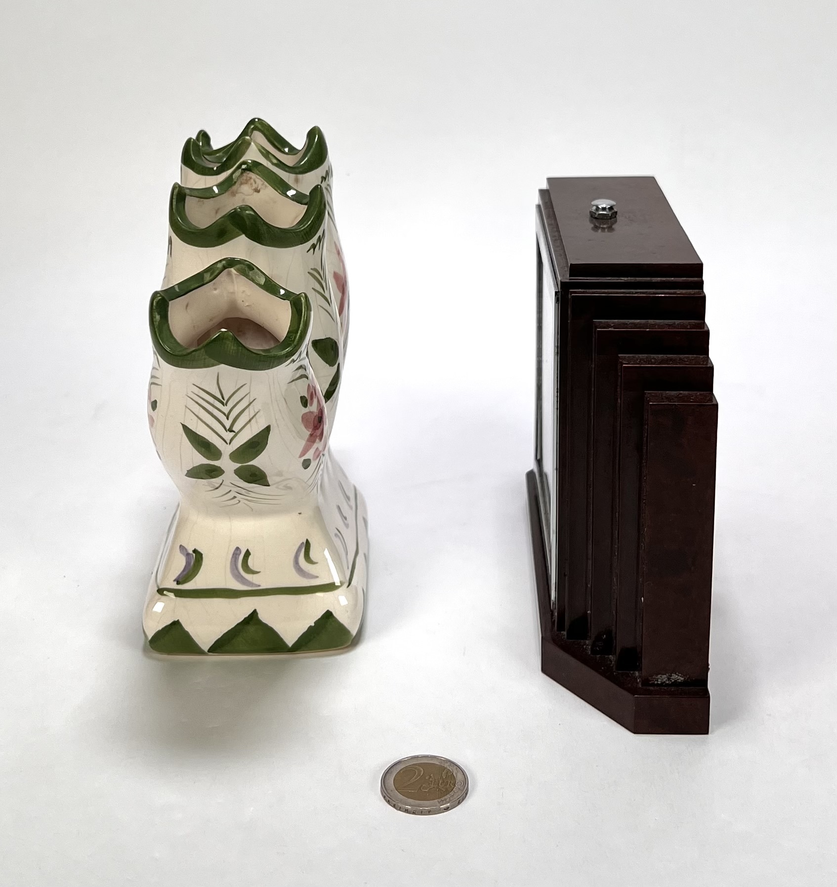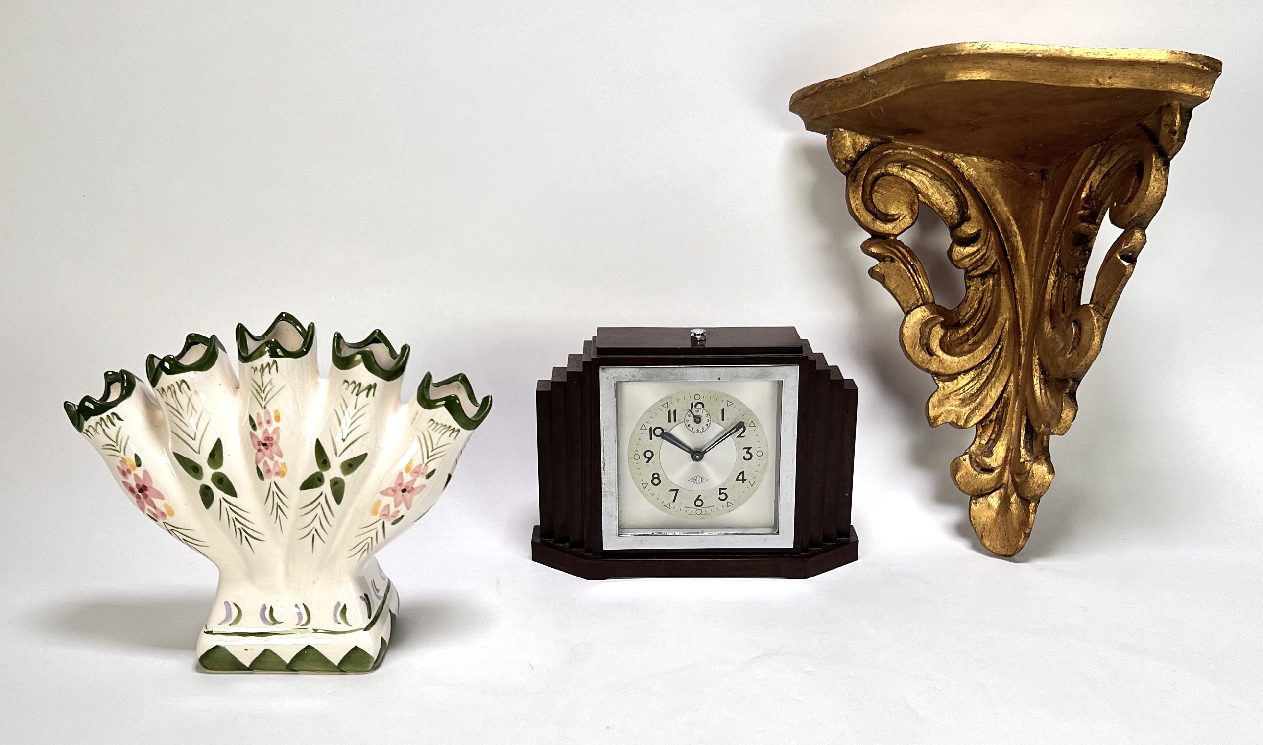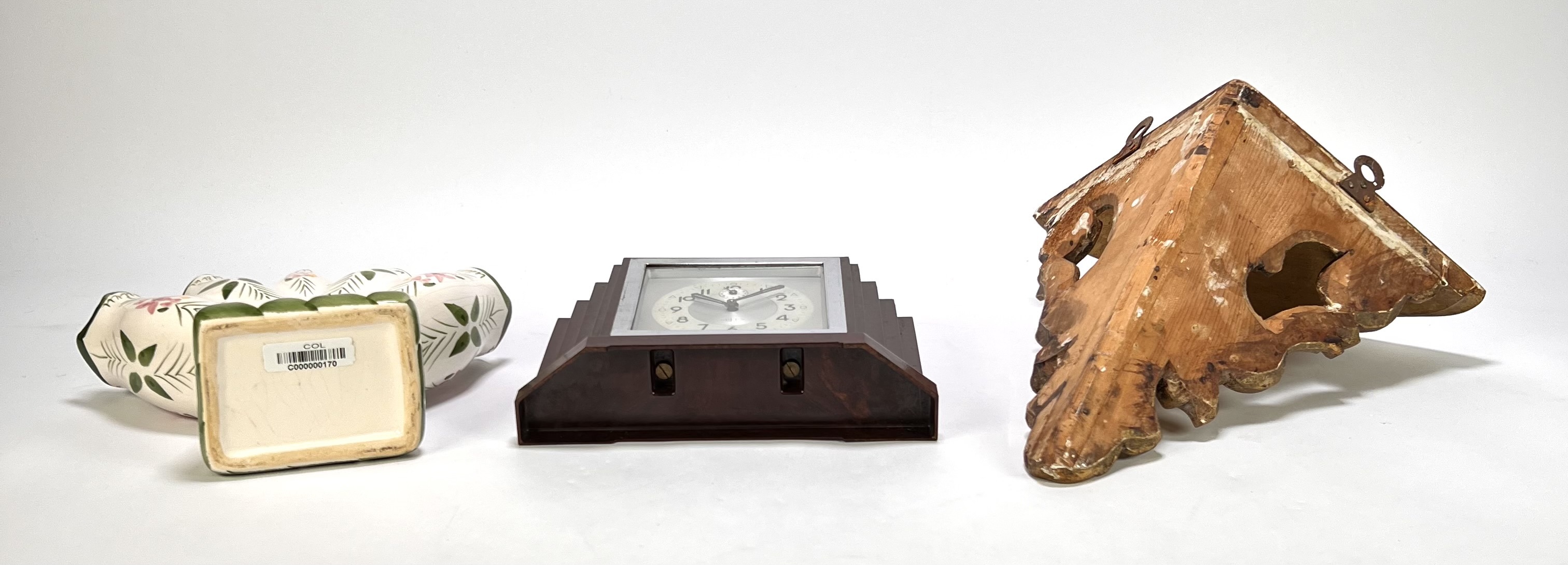 Lot curiosa vervaardigd uit bakeliet, hout en keramiek. De pendule uit de Art Deco periode toont een getrapt kastontwerp, de rococo stijl wandconsole heeft ornamentiek met acanthusbladeren en de tulpenvaas heeft een handbeschilderd decor. De verzameling dateert uit de 20e eeuw en heeft een Europese herkomst. Klaar om te bieden? Registreer je nu en doe mee aan de veiling! |