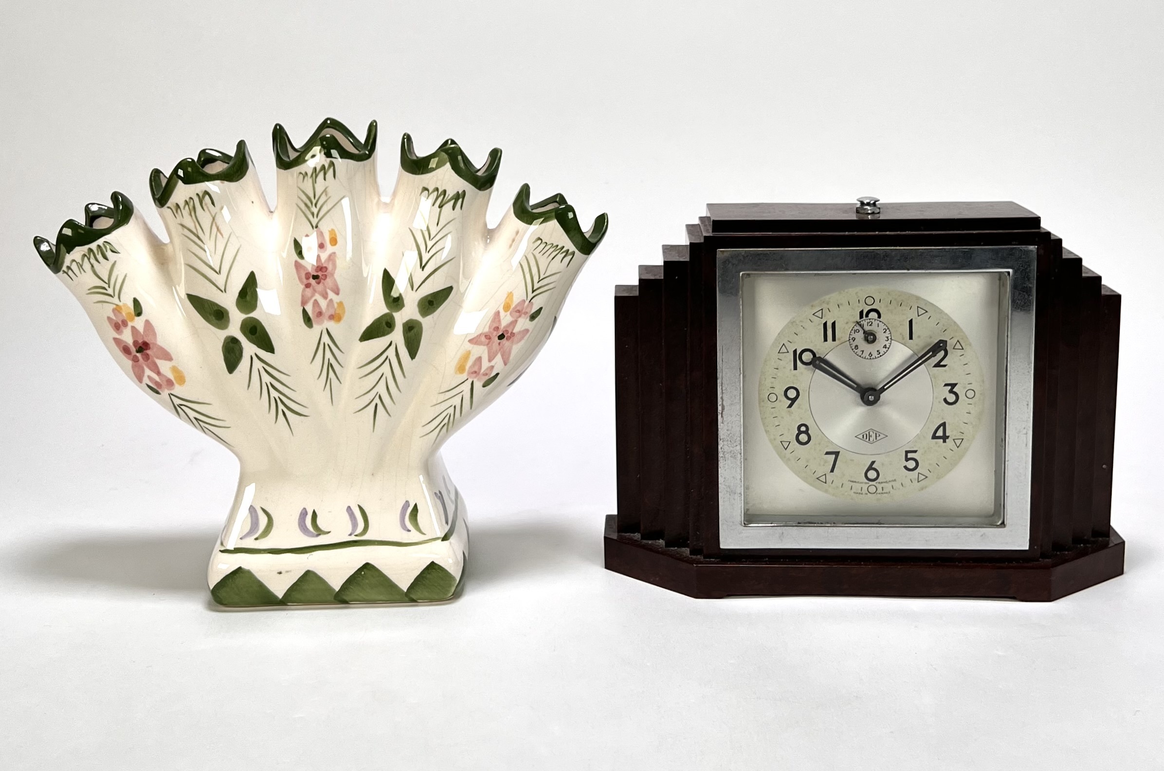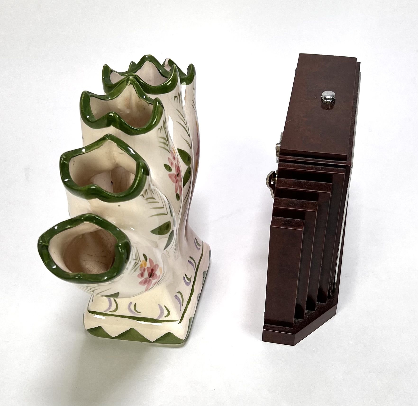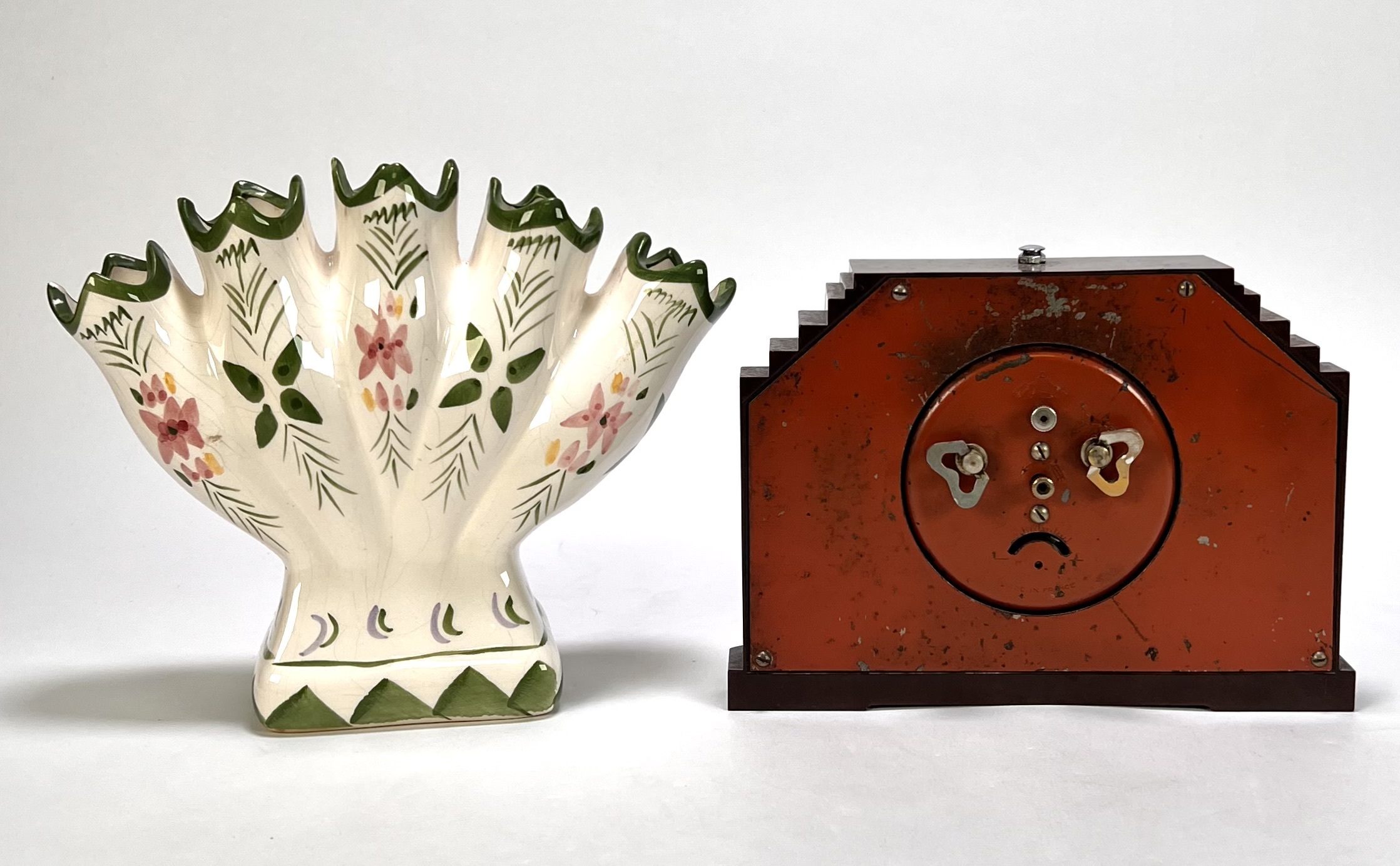 Lot curiosa vervaardigd uit bakeliet, hout en keramiek. De pendule uit de Art Deco periode toont een getrapt kastontwerp, de rococo stijl wandconsole heeft ornamentiek met acanthusbladeren en de tulpenvaas heeft een handbeschilderd decor. De verzameling dateert uit de 20e eeuw en heeft een Europese herkomst. Klaar om te bieden? Registreer je nu en doe mee aan de veiling! |