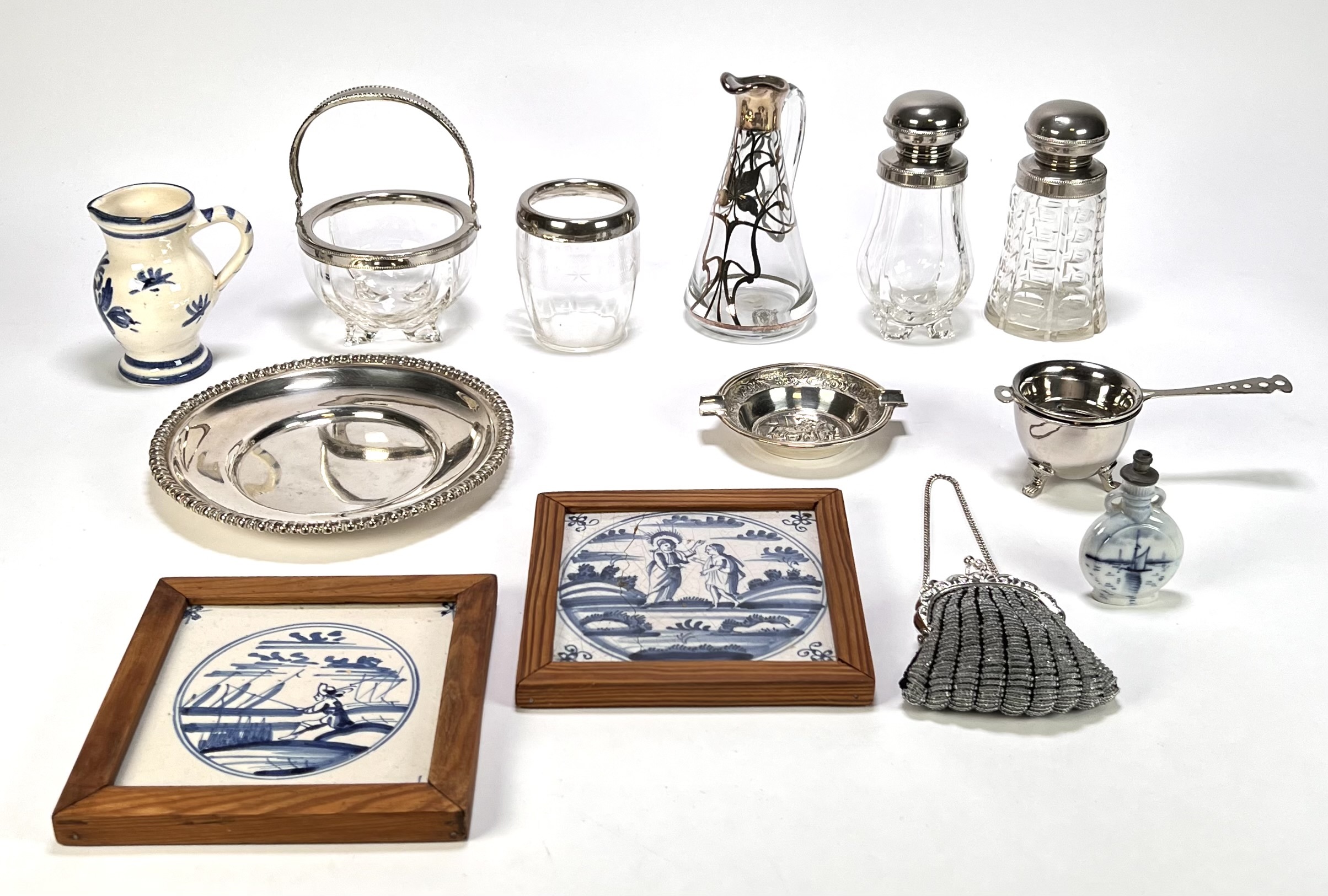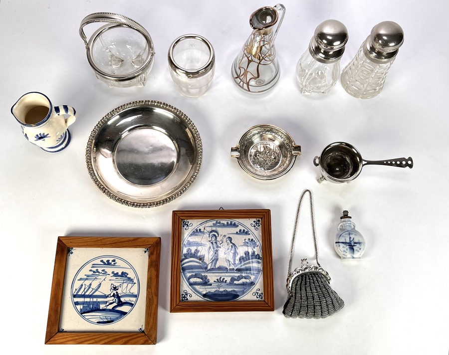 Curiosa vervaardigd uit verzilverde items, glas en keramiek met verschillende technieken. De verzameling omvat onder andere een karaf met verzilverd Art Nouveau montuur, Delfts blauwe wandtegeltjes in houten lijsten en een verzilverd tasbeugeltje. Datering eerst helft 20e eeuw en een West-Europese herkomst. Geïnteresseerd? Bezoek onze kijkdagen op 10, 11 en 12 april van 11:00 tot 17:00 uur! |