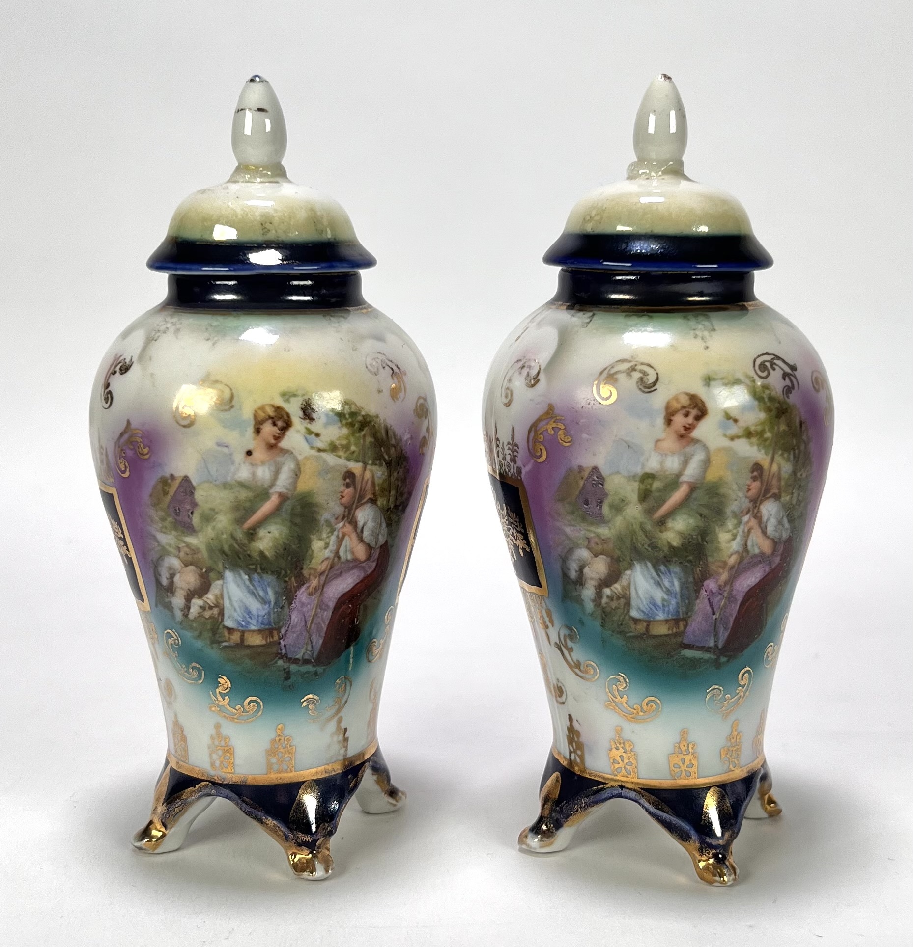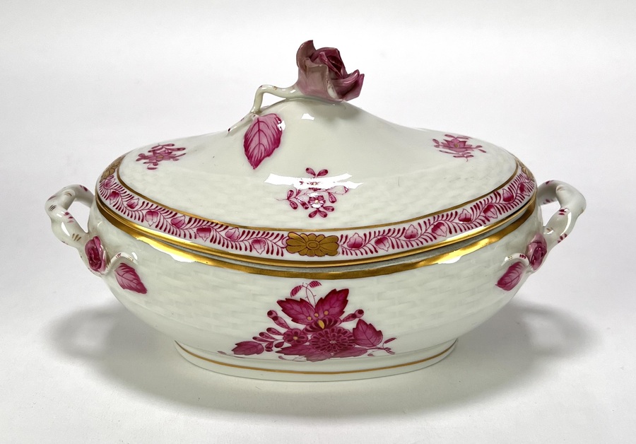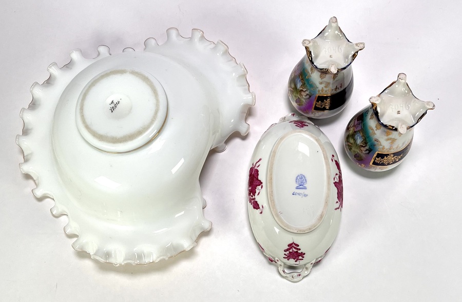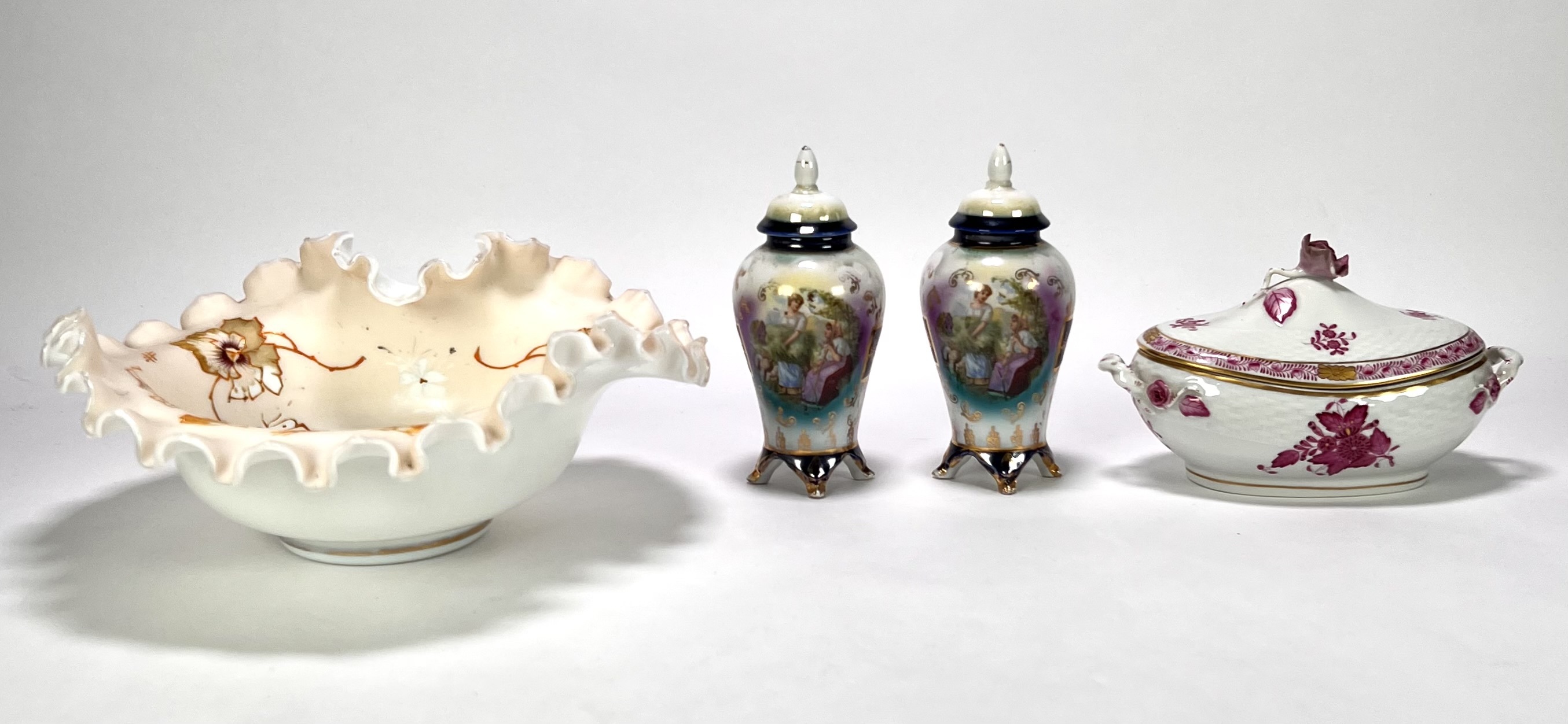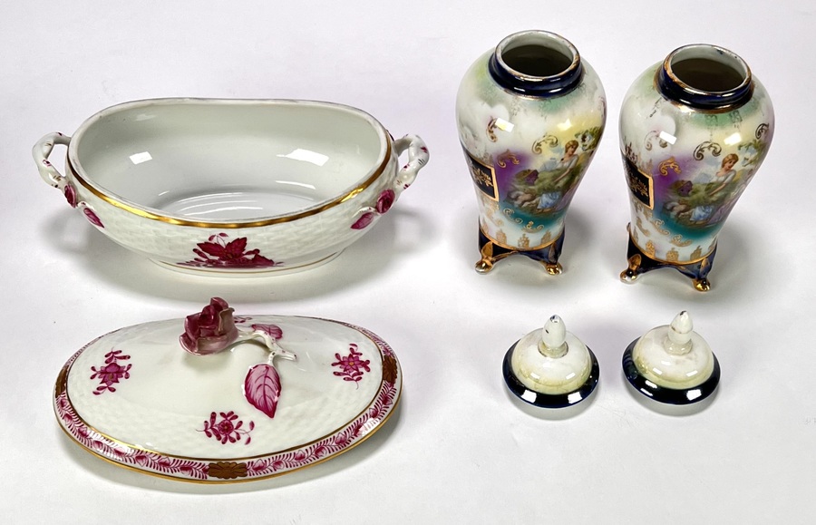 Lot vervaardigd uit opalineglas en handbeschilderd porselein; een schaal uit de Jugendstil periode met een floraal decor en gecrippleerde rand, een paar dekselvaasjes met romantische scènes op driepotige bases en een dekselpot van Herend met het paarse Apponyi-motief. Datering 20e eeuw, onderzijden gemerkt met fabrieksstempels en nummers. Plaats vanaf 3 april alvast een schriftelijk bod via onze website! |
