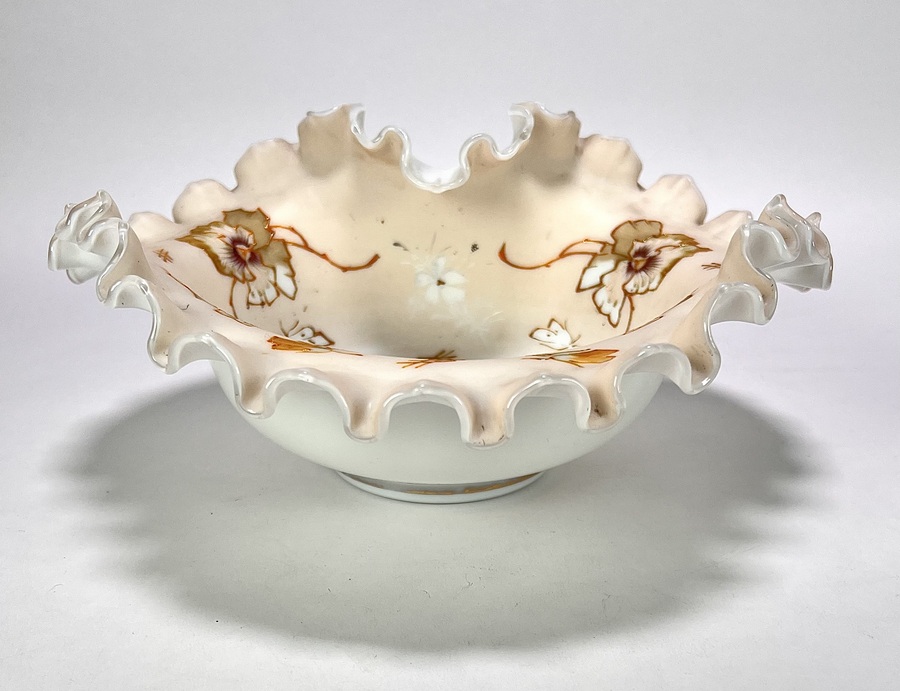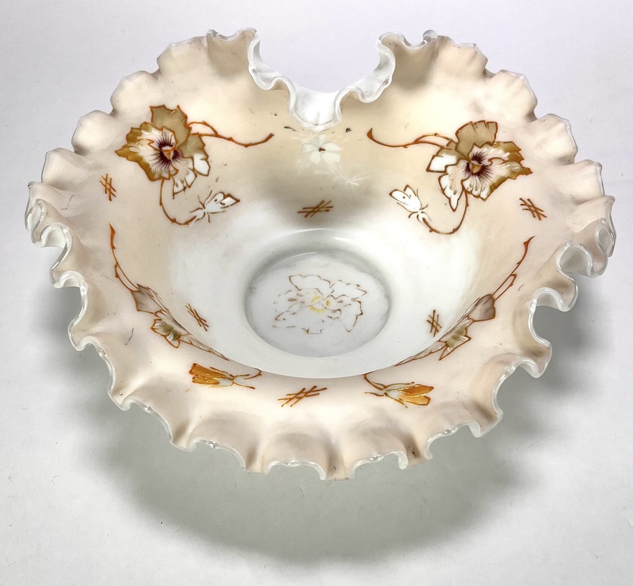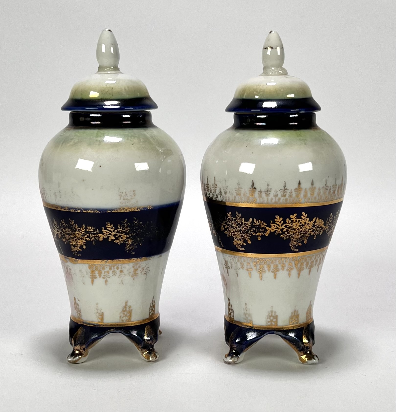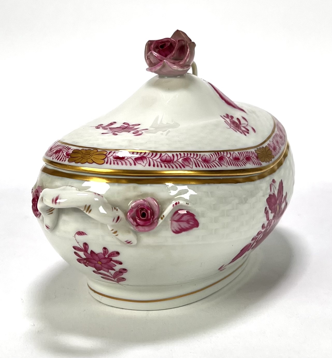 Lot vervaardigd uit opalineglas en handbeschilderd porselein; een schaal uit de Jugendstil periode met een floraal decor en gecrippleerde rand, een paar dekselvaasjes met romantische scènes op driepotige bases en een dekselpot van Herend met het paarse Apponyi-motief. Datering 20e eeuw, onderzijden gemerkt met fabrieksstempels en nummers. Plaats vanaf 3 april alvast een schriftelijk bod via onze website! |