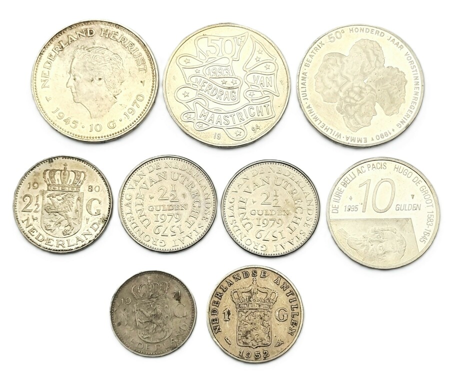 Munten van 's Rijks Munt uit de tweede helft van de 20e eeuw, vervaardigd uit zilver en onedel metaal middels slagwerk. De verzameling bevat diverse herdenkingsmunten, een zilveren gulden Nederlandse Antillen 1952, een zilveren 10 gulden Juliana 1970, een zilveren 10 gulden Hugo de Groot 1995, een zilveren 50 gulden verdrag van Maastricht 1993, een zilveren 50 gulden 100 jaar vorstinnenregering 1990, drie rijksdaalders en een gulden onedel.. Wil je direct deelnemen? Plaats vanaf 3 april alvast een schriftelijk bod via onze website! |