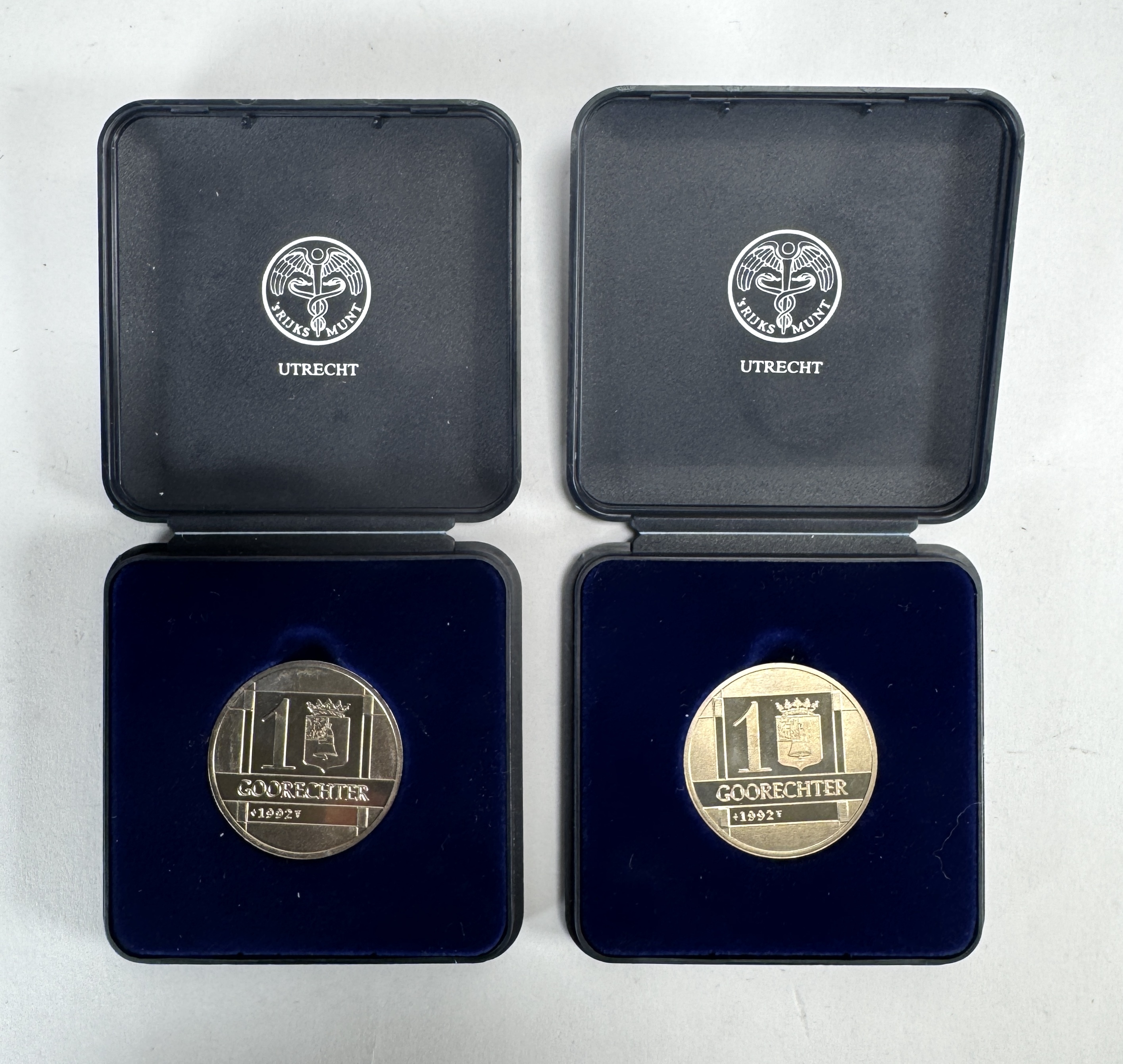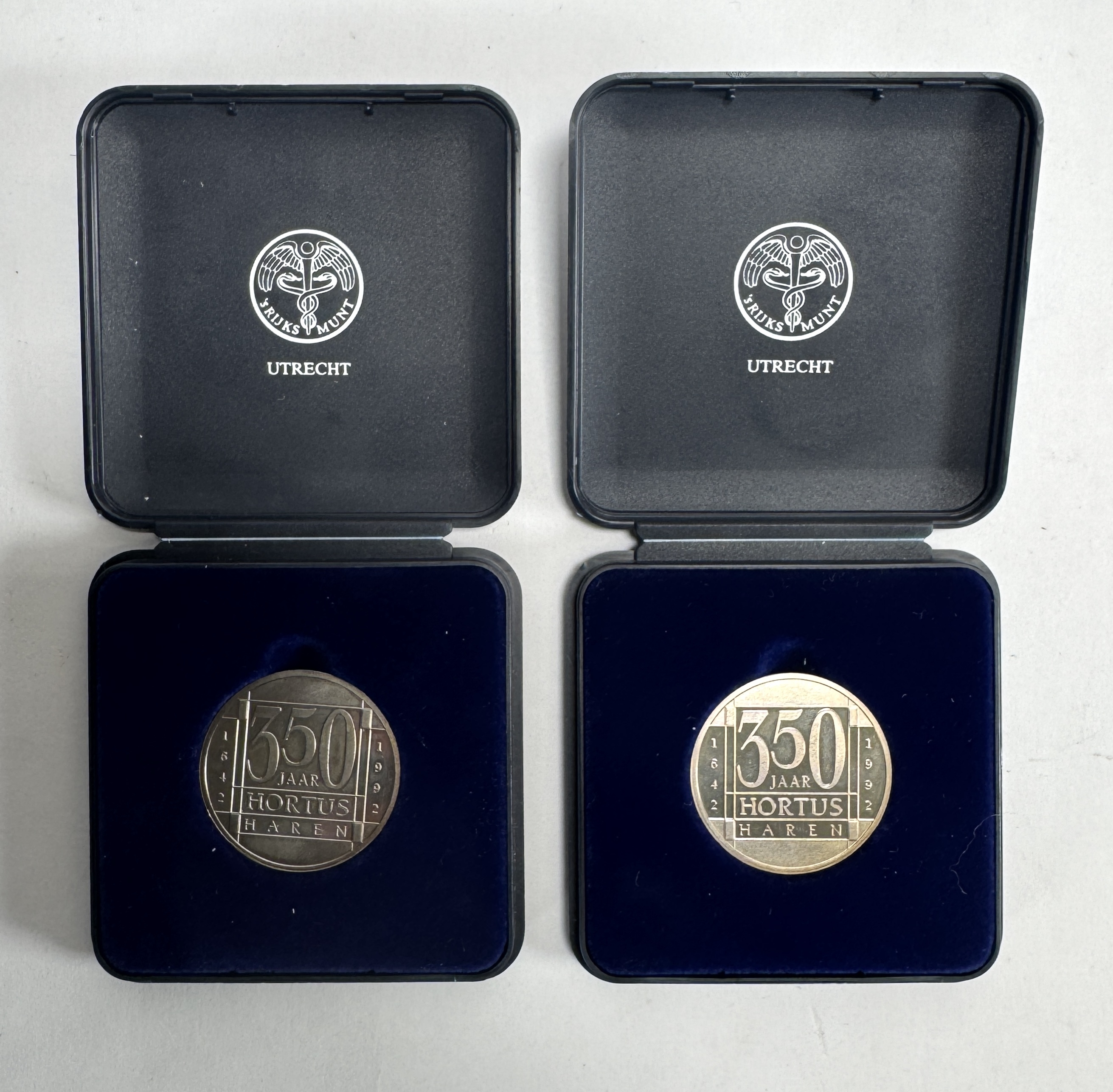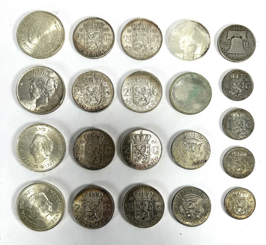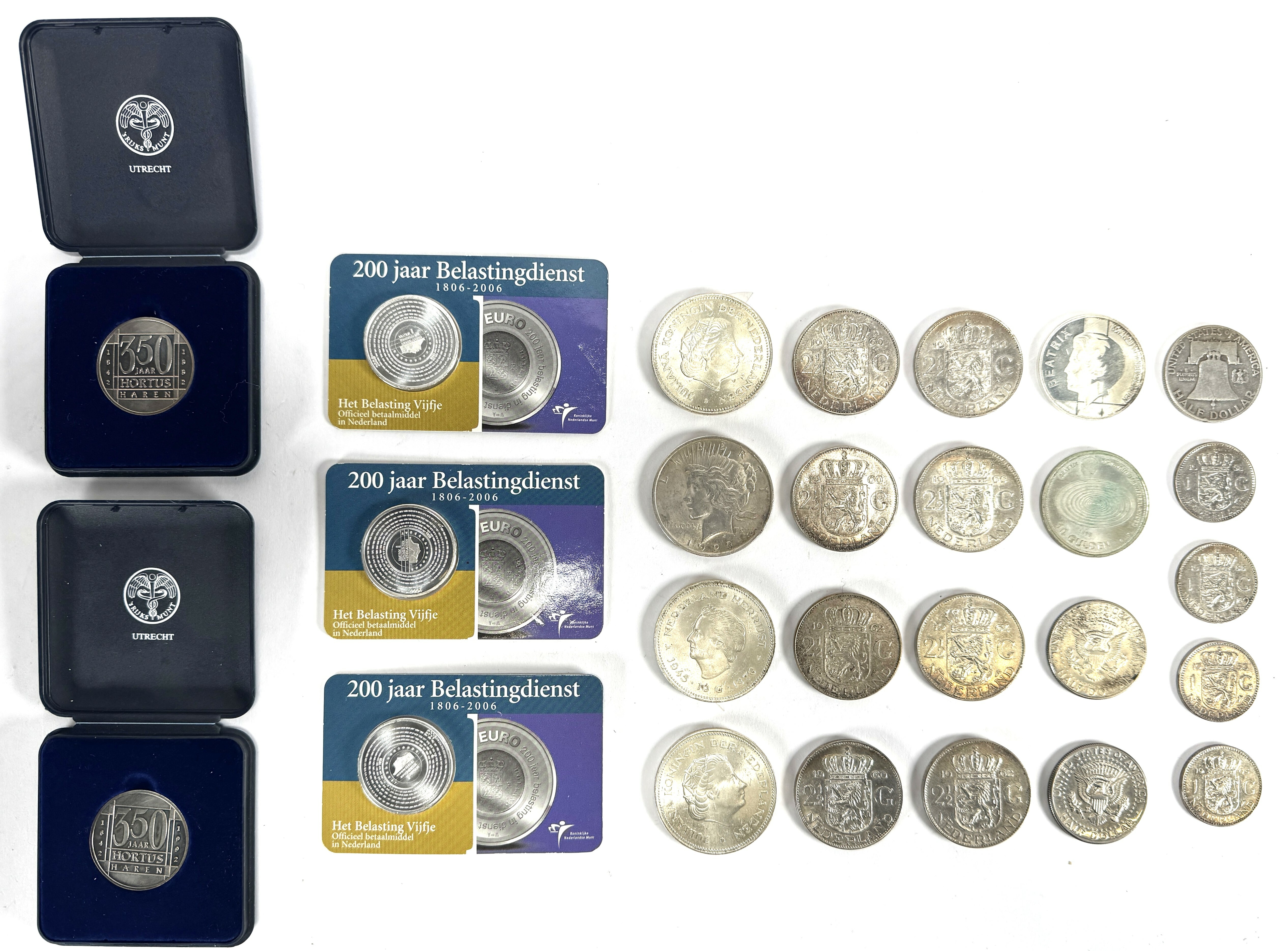 Zilveren en onedele munten van vijfentwintig stuks uit de twintigste en eenentwintigste eeuw, vervaardigd door de Koninklijke Nederlandse Munt en de United States Mint. De collectie omvat onder andere drie Belasting Vijfjes in coincard, diverse zilveren rijksdaalders, guldens, herdenkingspenningen waaronder Hortus Haren en een Peace Dollar uit 1923. Het gehalte varieert van 720/1000 tot 925/1000 zilver. Wil je direct deelnemen? Plaats vanaf 3 april alvast een schriftelijk bod via onze website! |