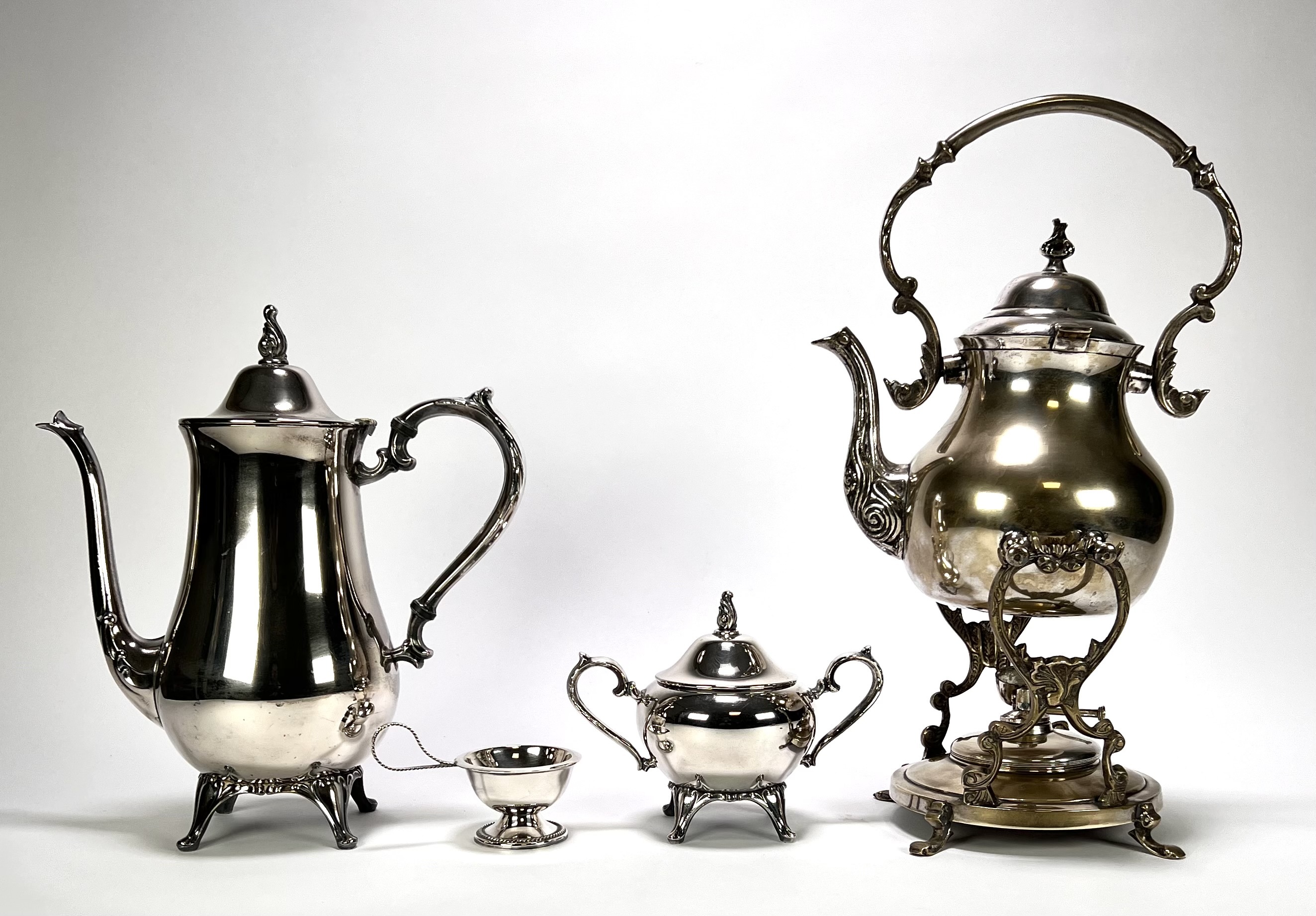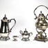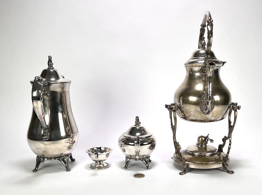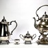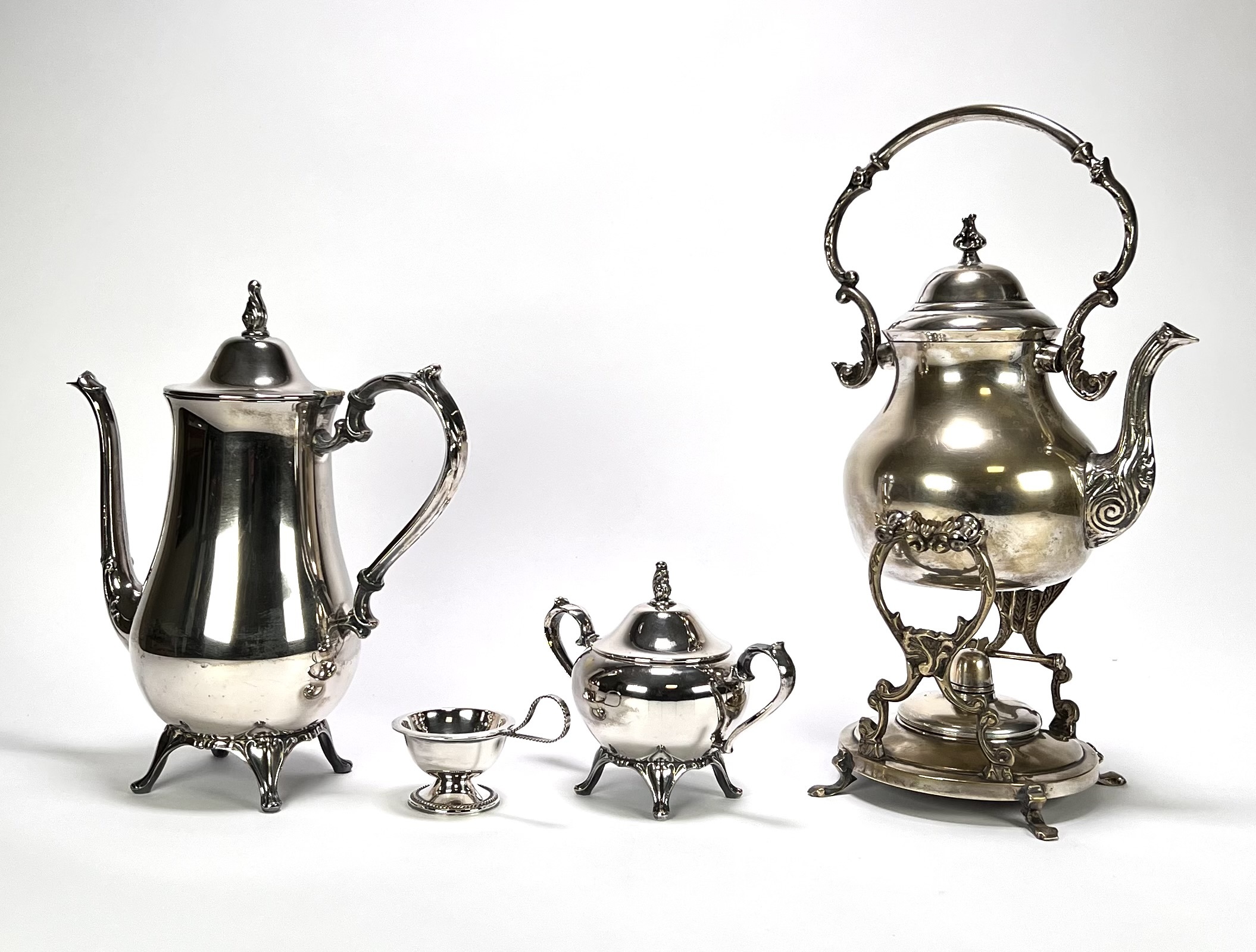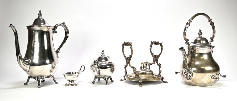 Verzilverd servies met koffie- en theepot op komfoor, West-Europa, circa 1900