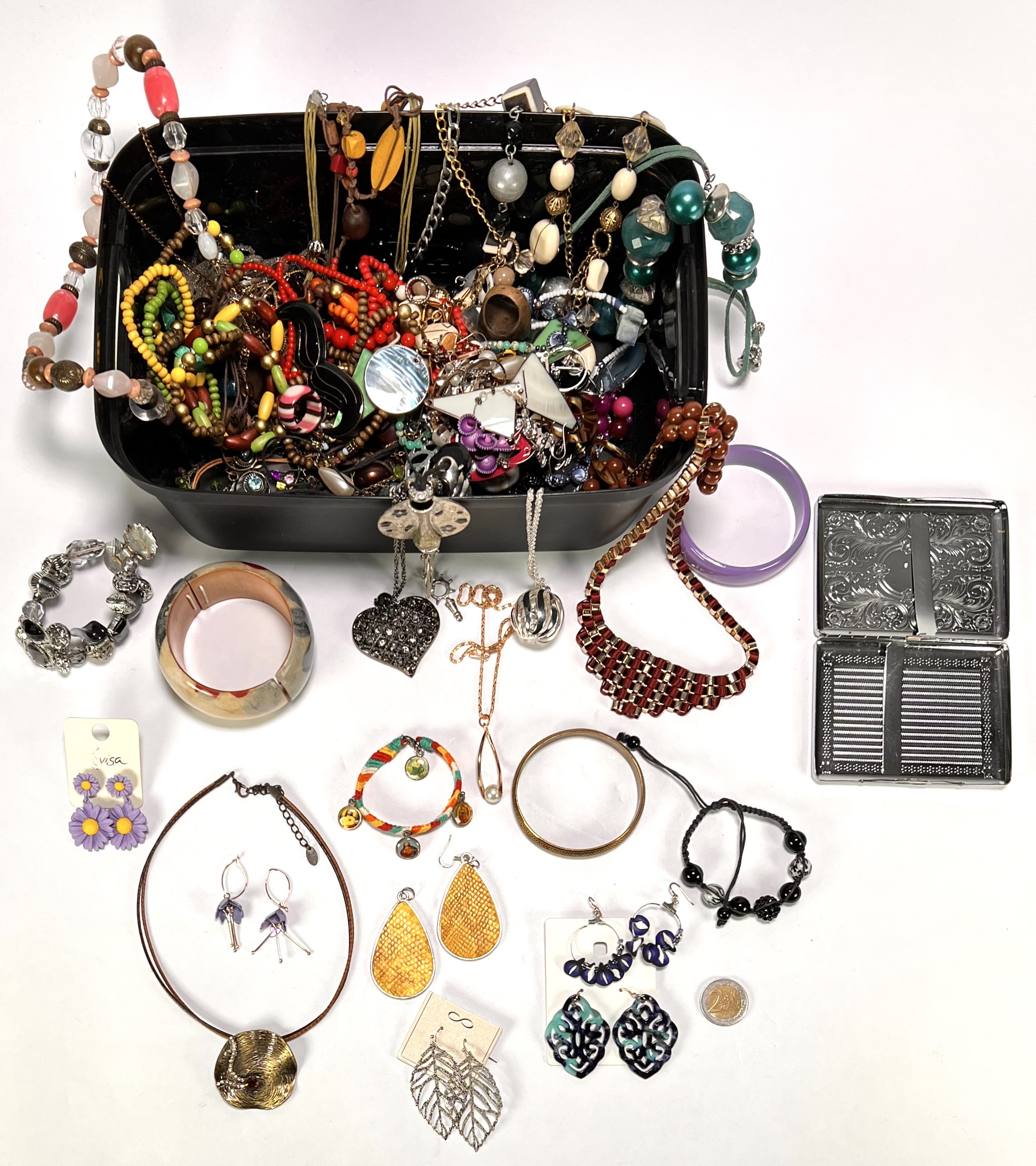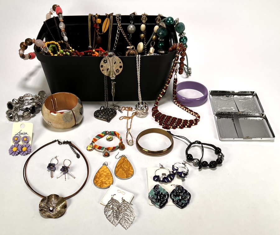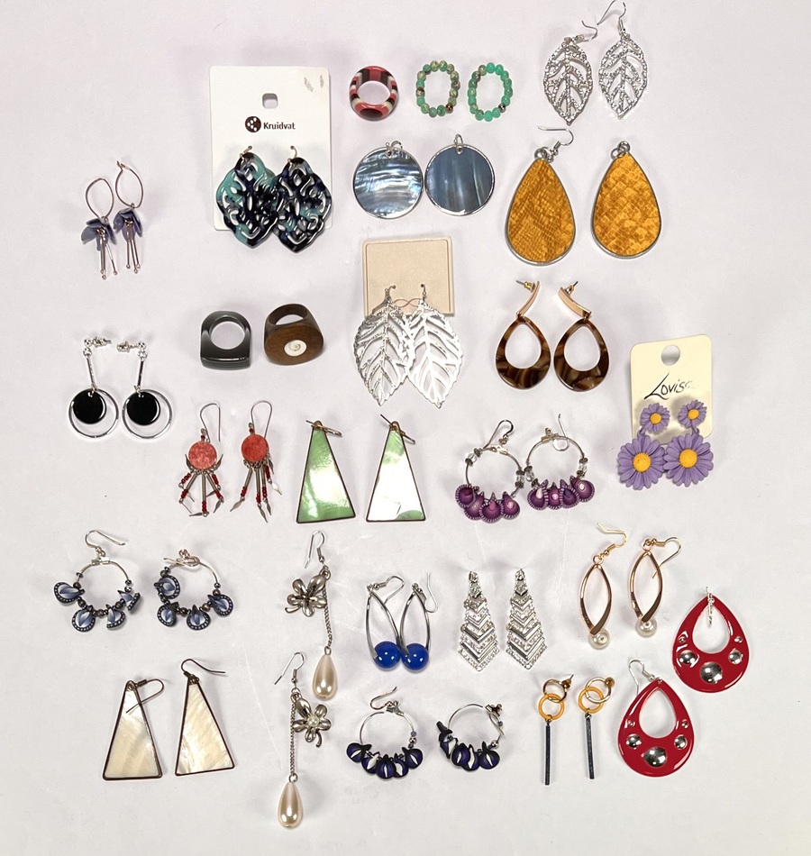 Lot onedele bijouterie bestaande uit oorbellen, colliers en armbanden in uiteenlopende stijlen. De uitgebreide set bevat diverse kleurrijke elementen van kunststof en glas, variërend van florale motieven tot geometrische vormen. Klaar om te bieden? Registreer je nu en doe mee aan de veiling! |