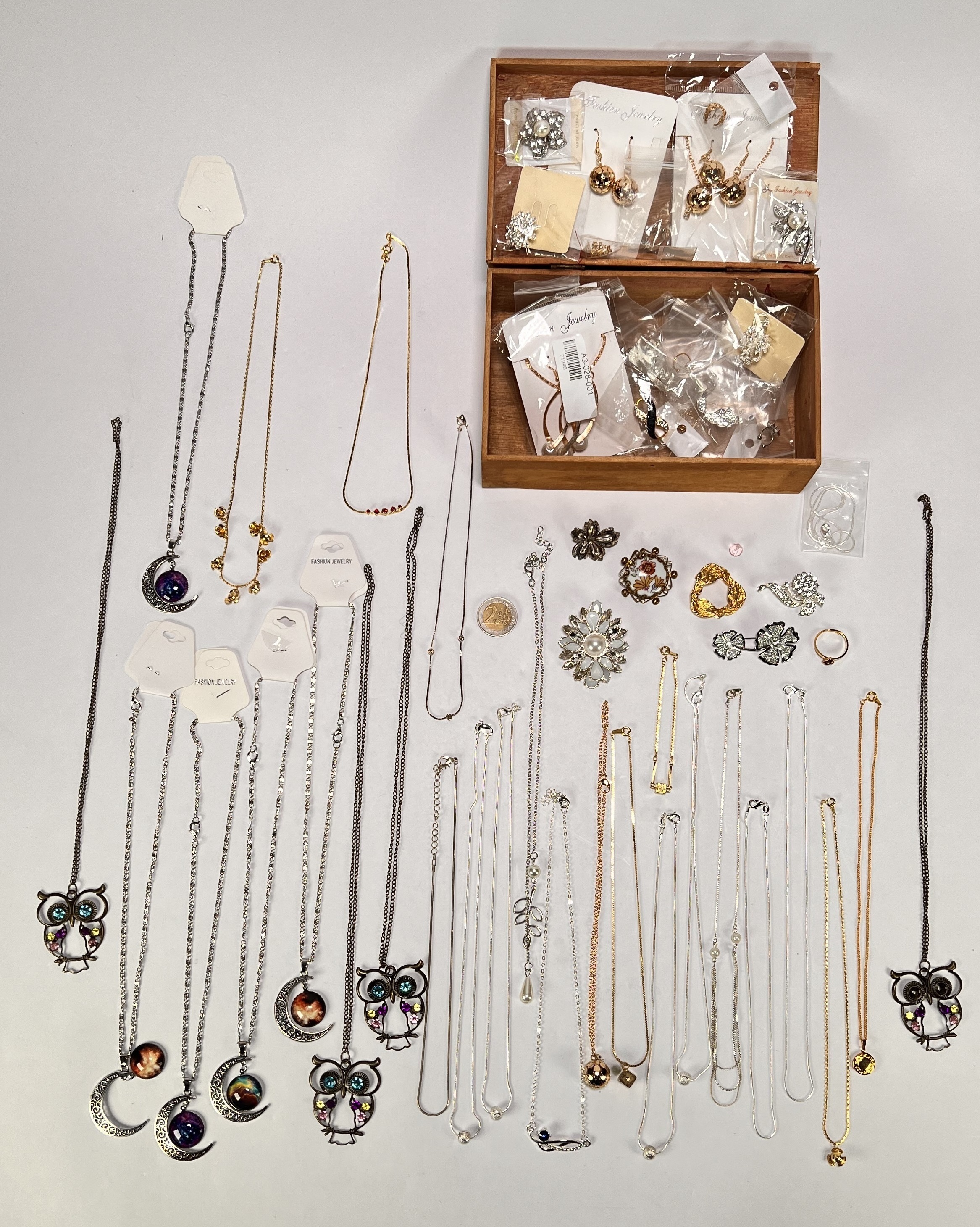 Convoluut sieraden bestaande uit diverse colliers, hangers en armbanden uitgevoerd in zowel goudkleurig als zilverkleurig metaal. De verzameling bevat verschillende stijlen, van modern gevlochten schakelwerk tot klassieke hangers met diverse gekleurde stenen. Datering eind 20e eeuw. Zeker zijn van deelname? Plaats vanaf 3 april een schriftelijk bod online! |