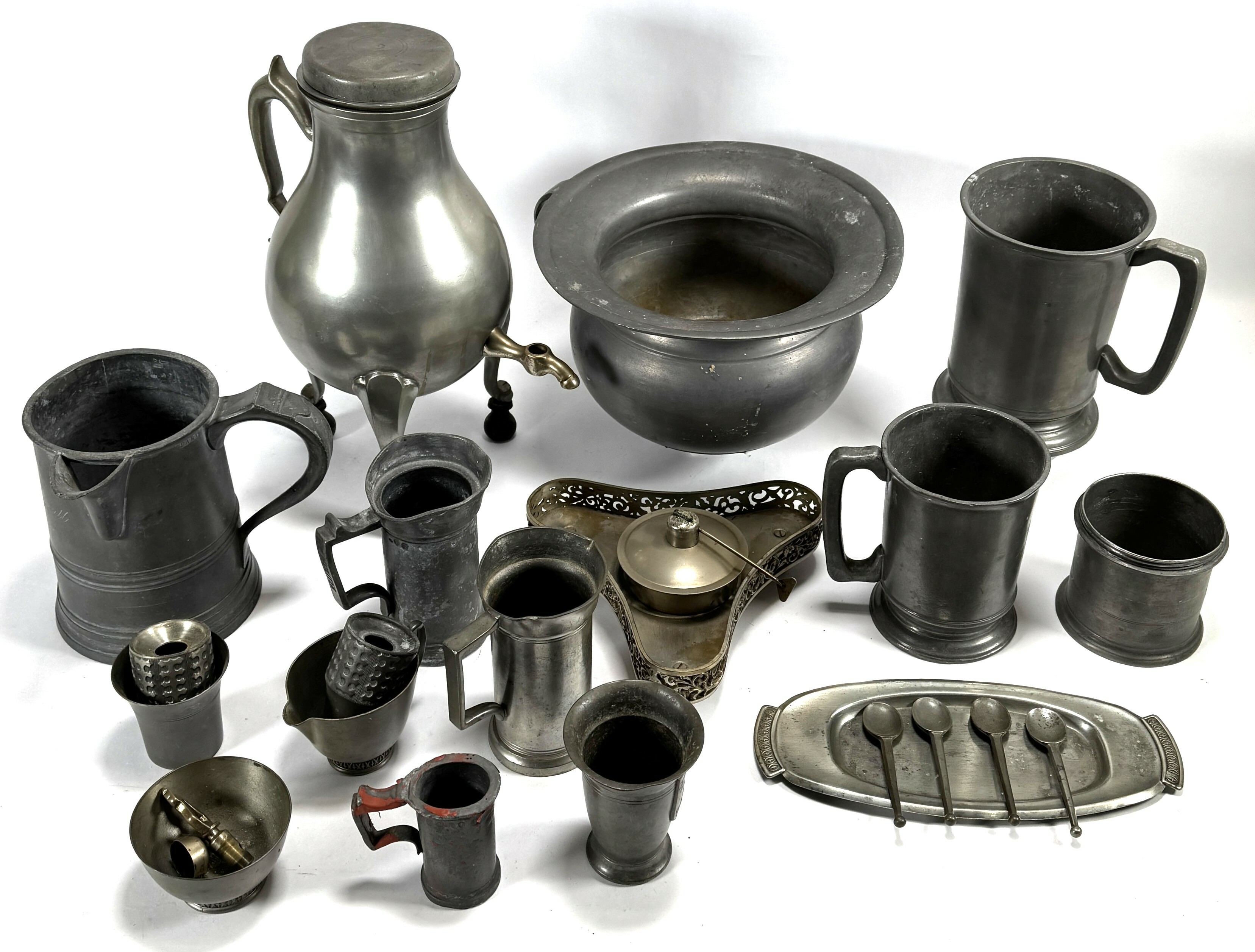 Lot tin met gegoten en gedraaide onderdelen, onder meer een Dröppelmina, meerdere kroezen en kannen, een brede kom en een ovale schaal met vier lepels. Datering 19e/20e eeuw en een Europese herkomst. Klaar om te bieden? Registreer je nu en doe mee aan de veiling! |