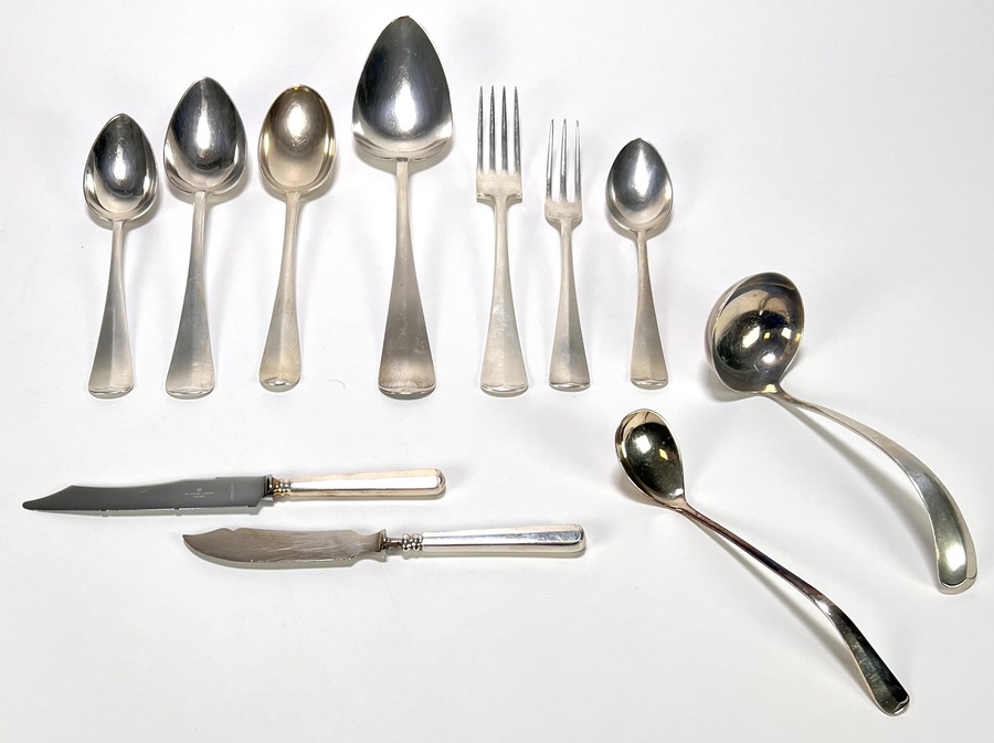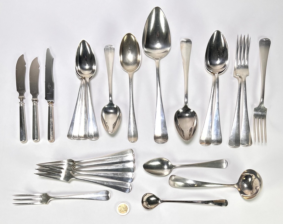 Bestek van Koninklijke Van Kempen & Begeer vervaardigd uit 83/1000 zilver. Bestaand uit drie grote vorken, zes kleine vorken, vier grote lepels, zes kleine lepels, vier opscheplepels en drie messen met zilveren heften. De onderdelen dragen Nederlands zilverkeur met meesterteken, lopende leeuw 2, minervakop B (Utrecht) en diverse jaarletters. Kom langs tijdens de kijkdagen (10 t/m 12 april) en ontdek het bestek zelf! |