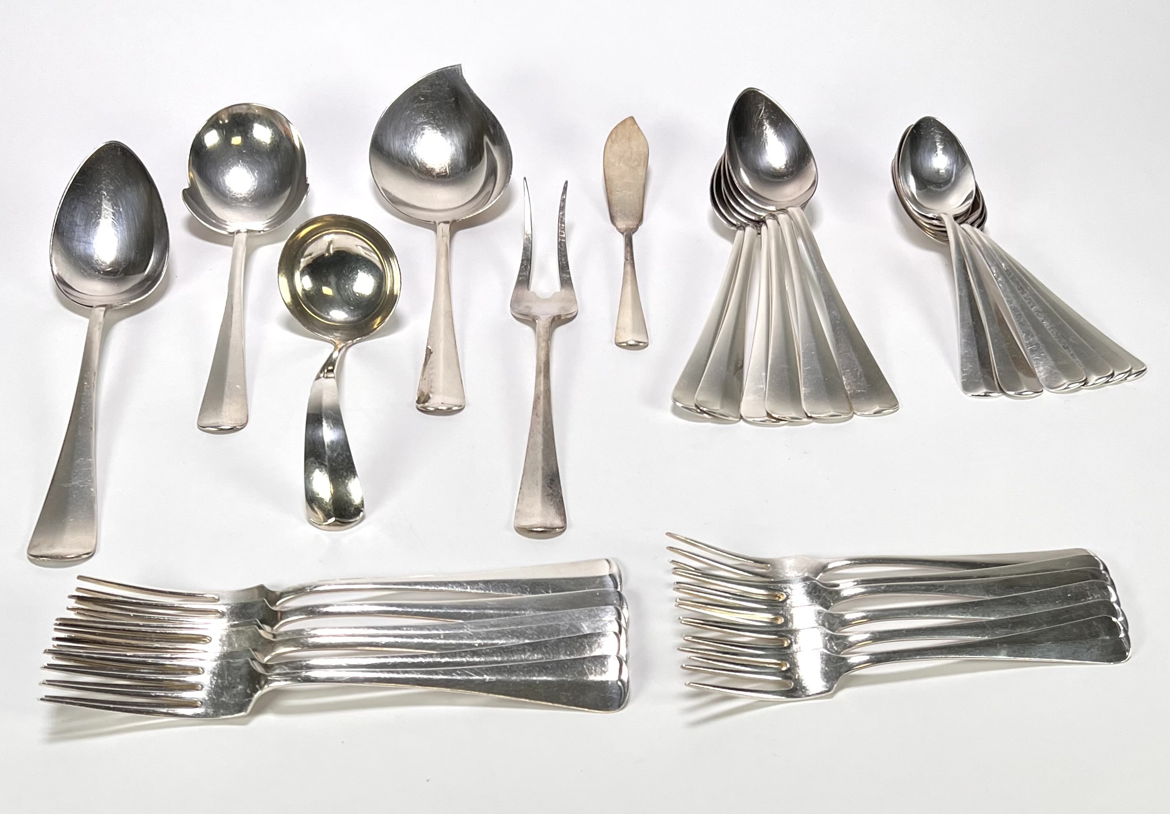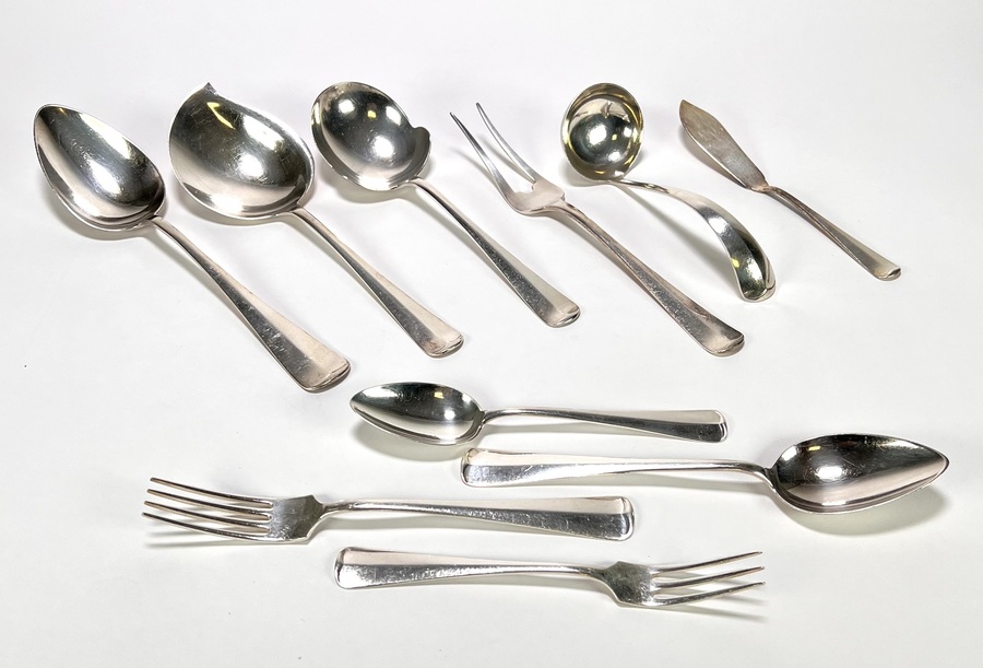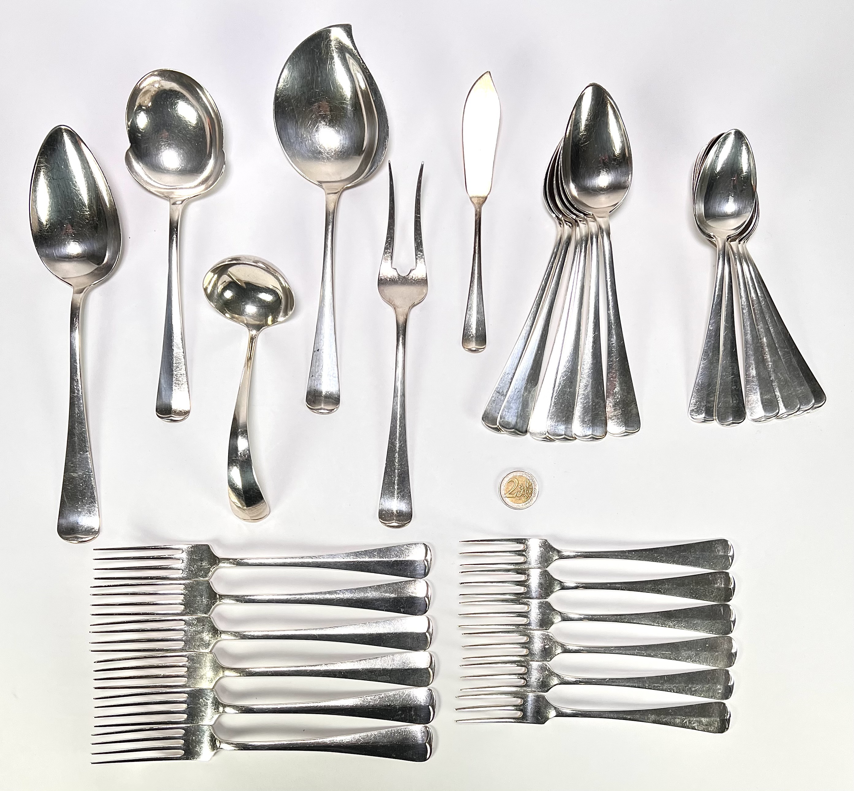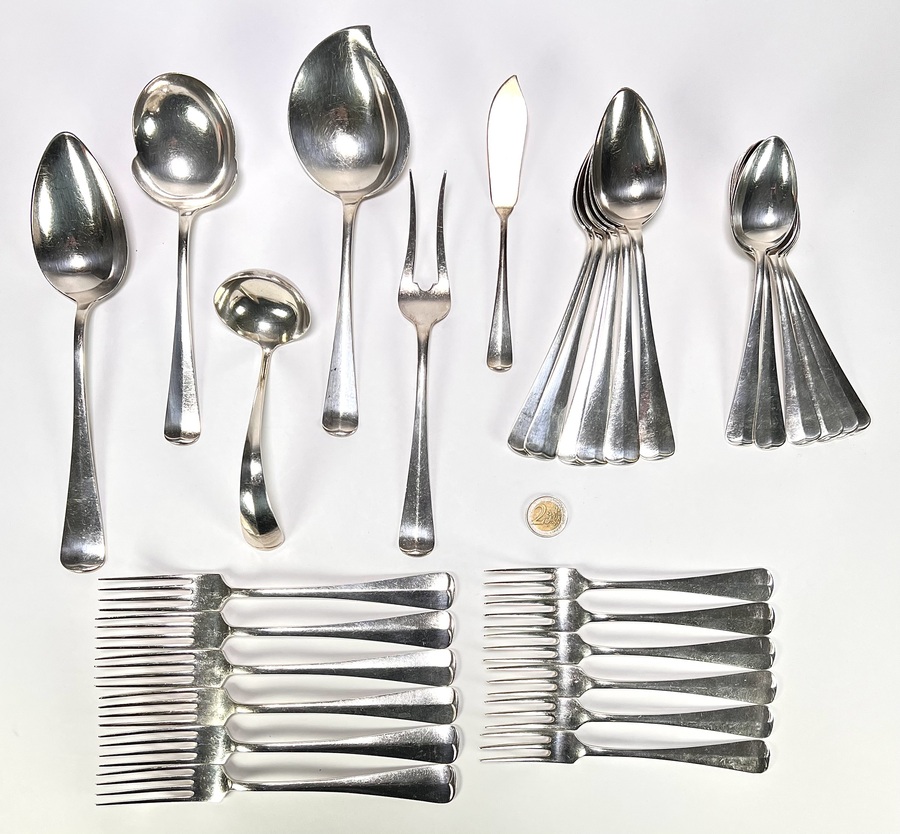 Bestek van Koninklijke Van Kempen & Begeer vervaardigd uit 835/1000 zilver. Bestaand uit zes grote lepels, zes kleine lepels, zes grote vorken, zes kleine vorken, vier opscheplepels, een vleesvork en een botermesje. De onderdelen dragen Nederlands zilverkeur met meesterteken Koninklijke Van Kempen en Begeer, lopende leeuw 2, minervakop B (Utrecht) en jaarletter. Zeker zijn van deelname? Plaats vanaf 3 april een schriftelijk bod online!bod! |