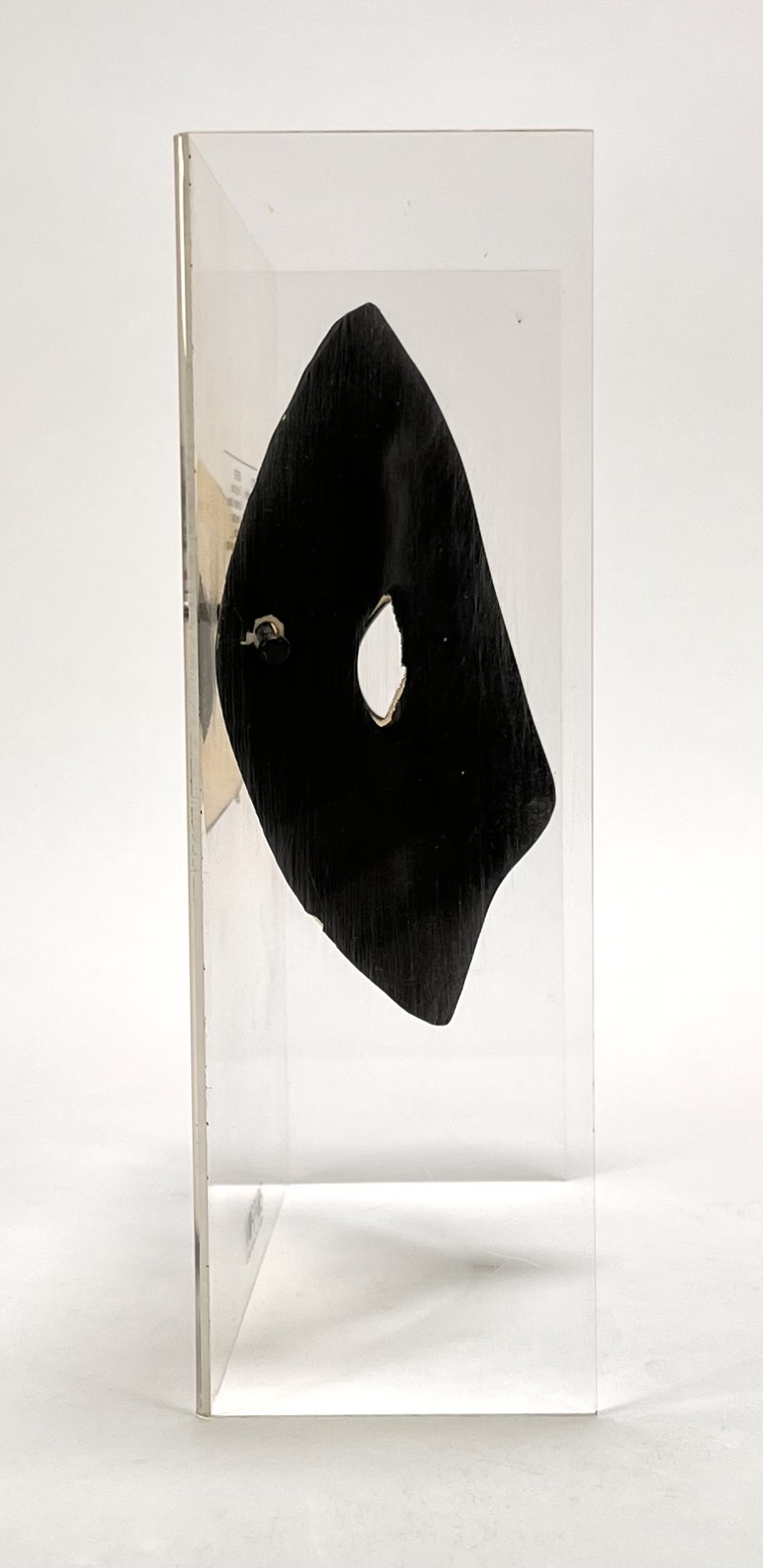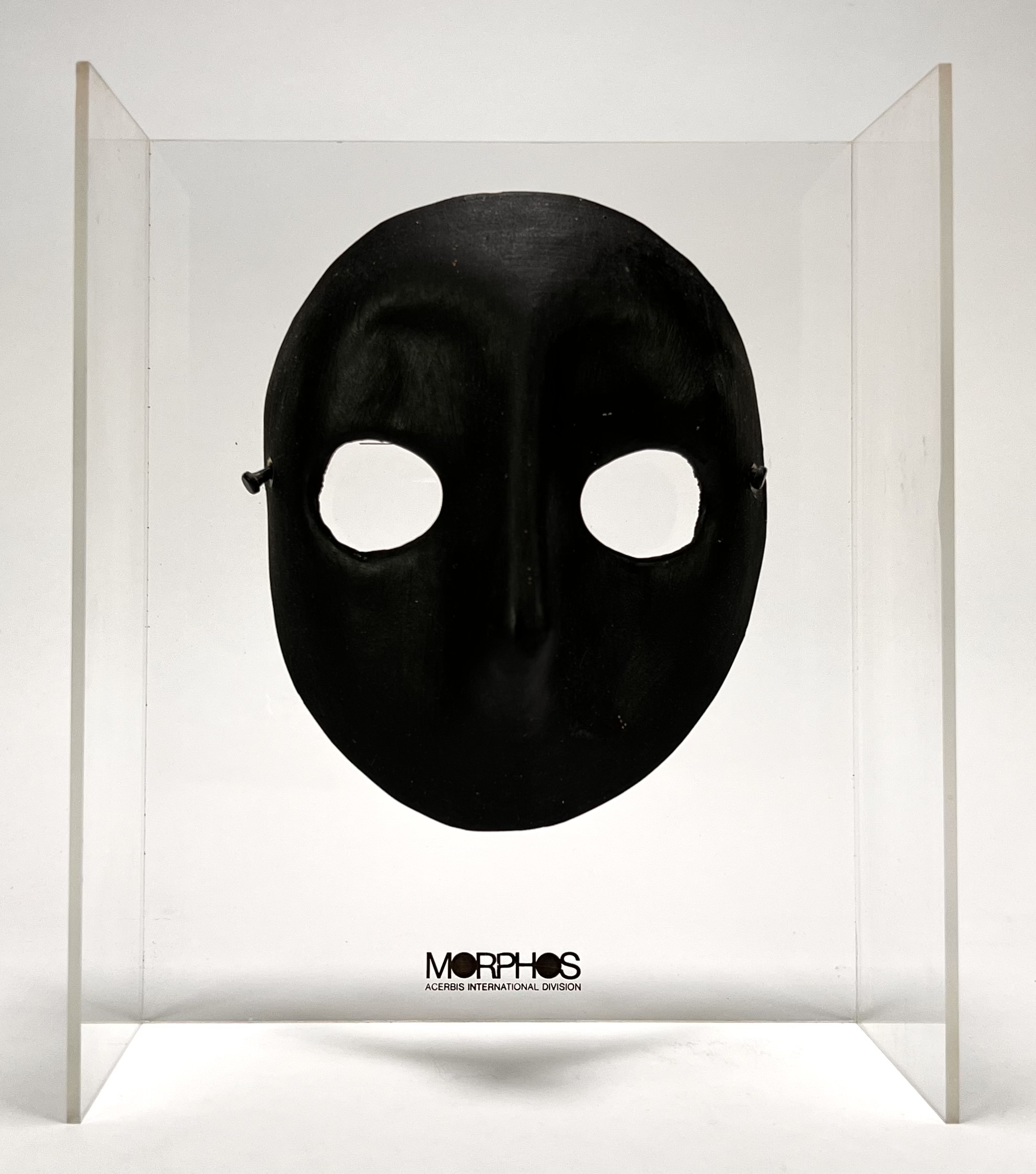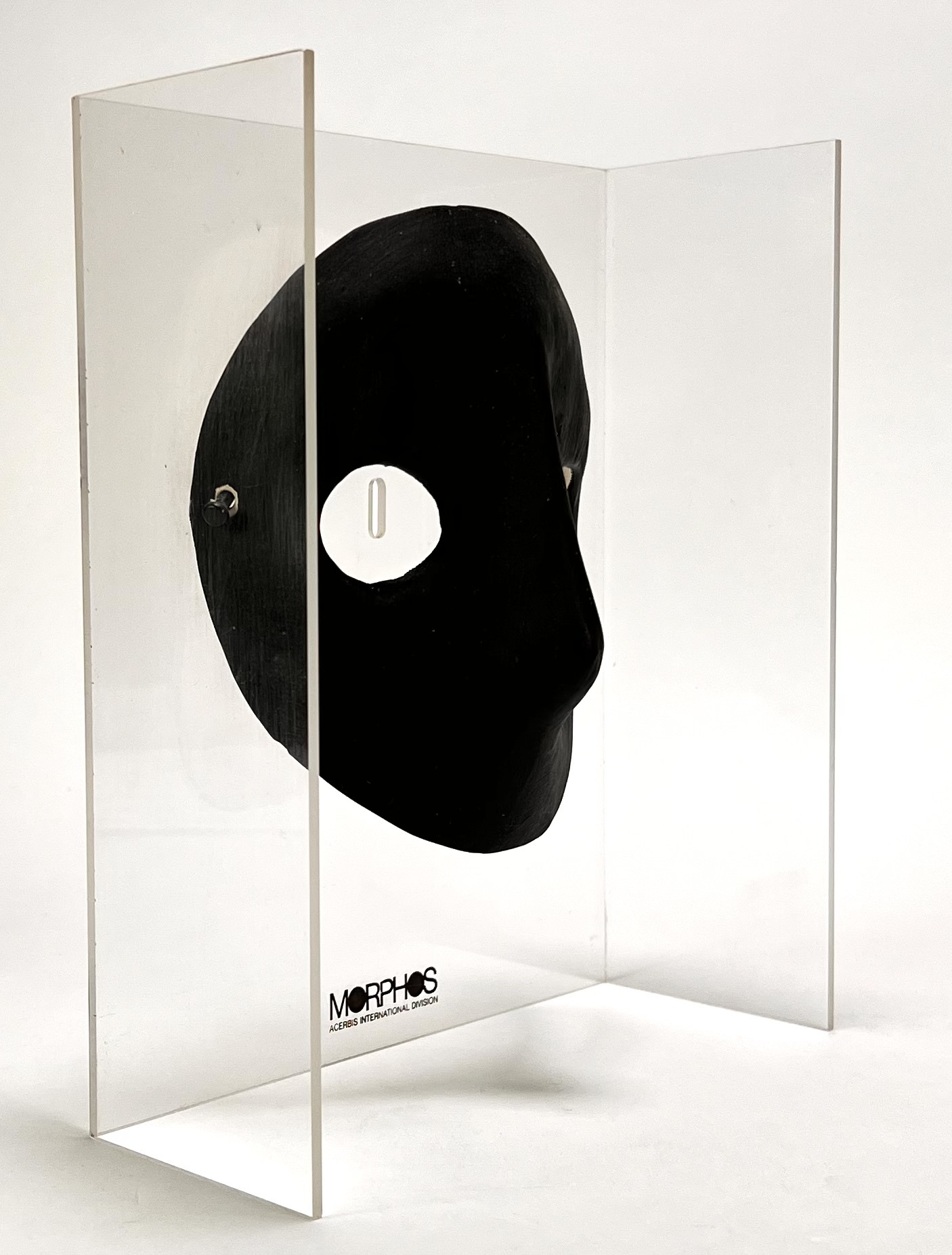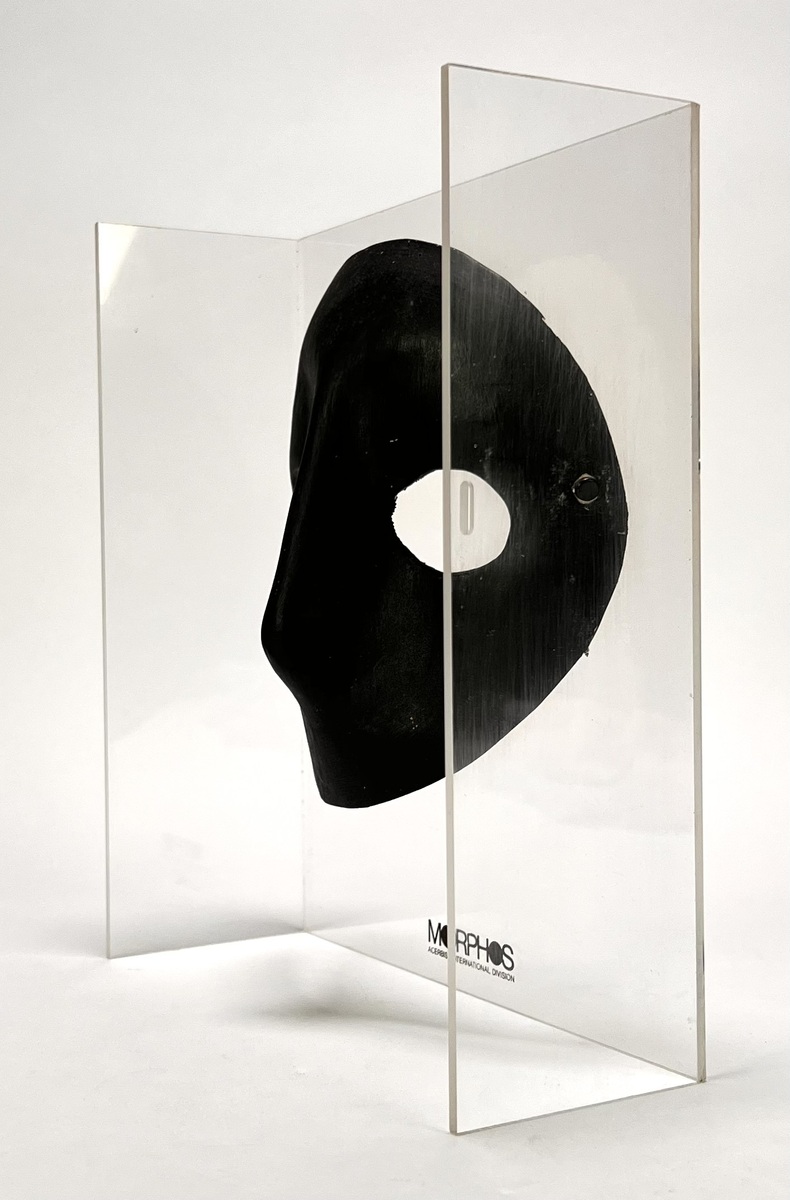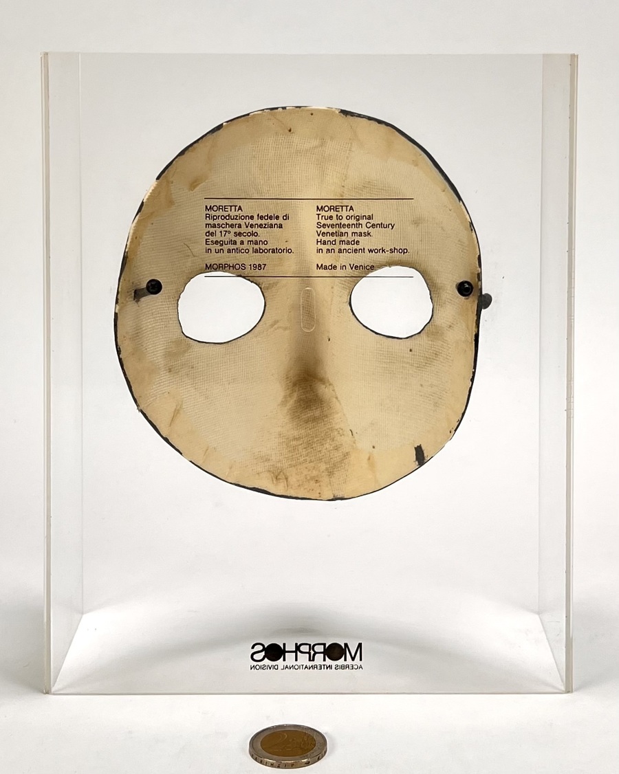 Masker vervaardigd uit zwart papier-maché in een houder van gebogen plexiglas, door Morphos Italië . Het Venetiaanse masker, type Moretta, is kenmerkend voor de Italiaanse designproductie uit de jaren tachtig. Gemerkt op de voorzijde, datering circa 1985 en een Italiaanse herkomst. Zeker zijn van deelname? Plaats vanaf 3 april een schriftelijk bod online! |