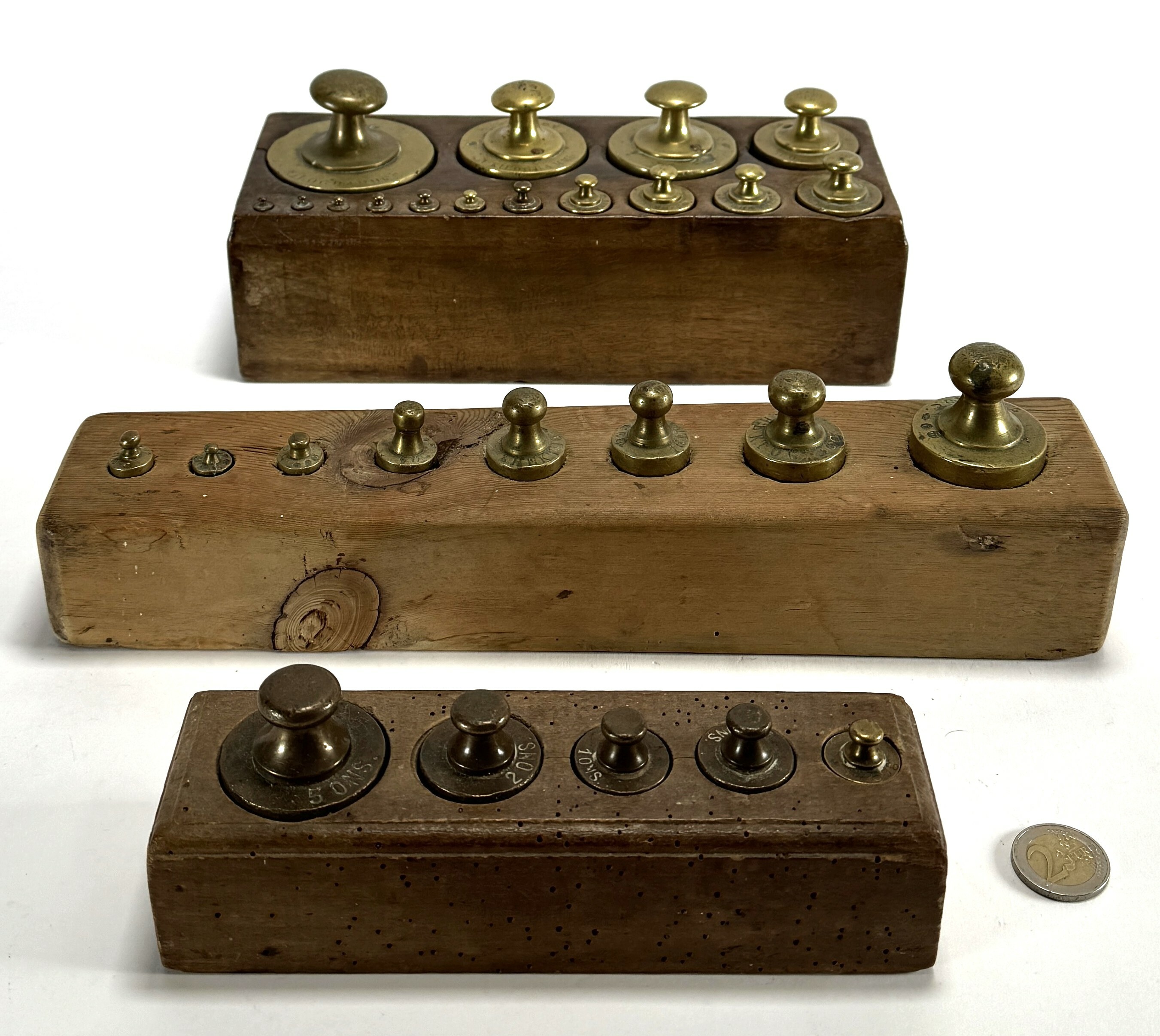 Messing gewichtensets van diverse makers uit de 19e en vroege 20e eeuw, vervaardigd uit gegoten messing gevat in eikenhouten en grenenhouten blokken. De drie sets omvatten knopgewichten in verschillende schalen. Herkomst Noord-Europa. Wil je deze messing gewichtensets in het echt bekijken? Kom naar de kijkdagen! |
