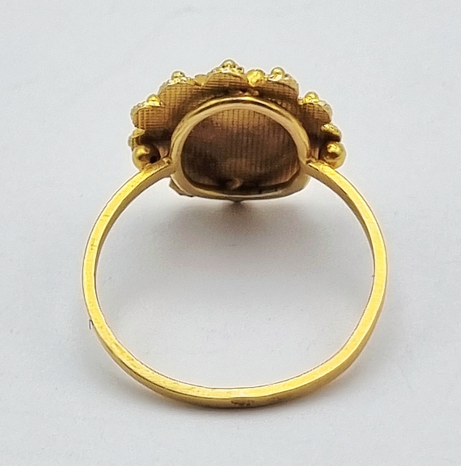 | Kavelnummer en naam | 1332. 14-karaats gouden ring met trapslijpsel granaat en filigraan, 20e eeuw | |