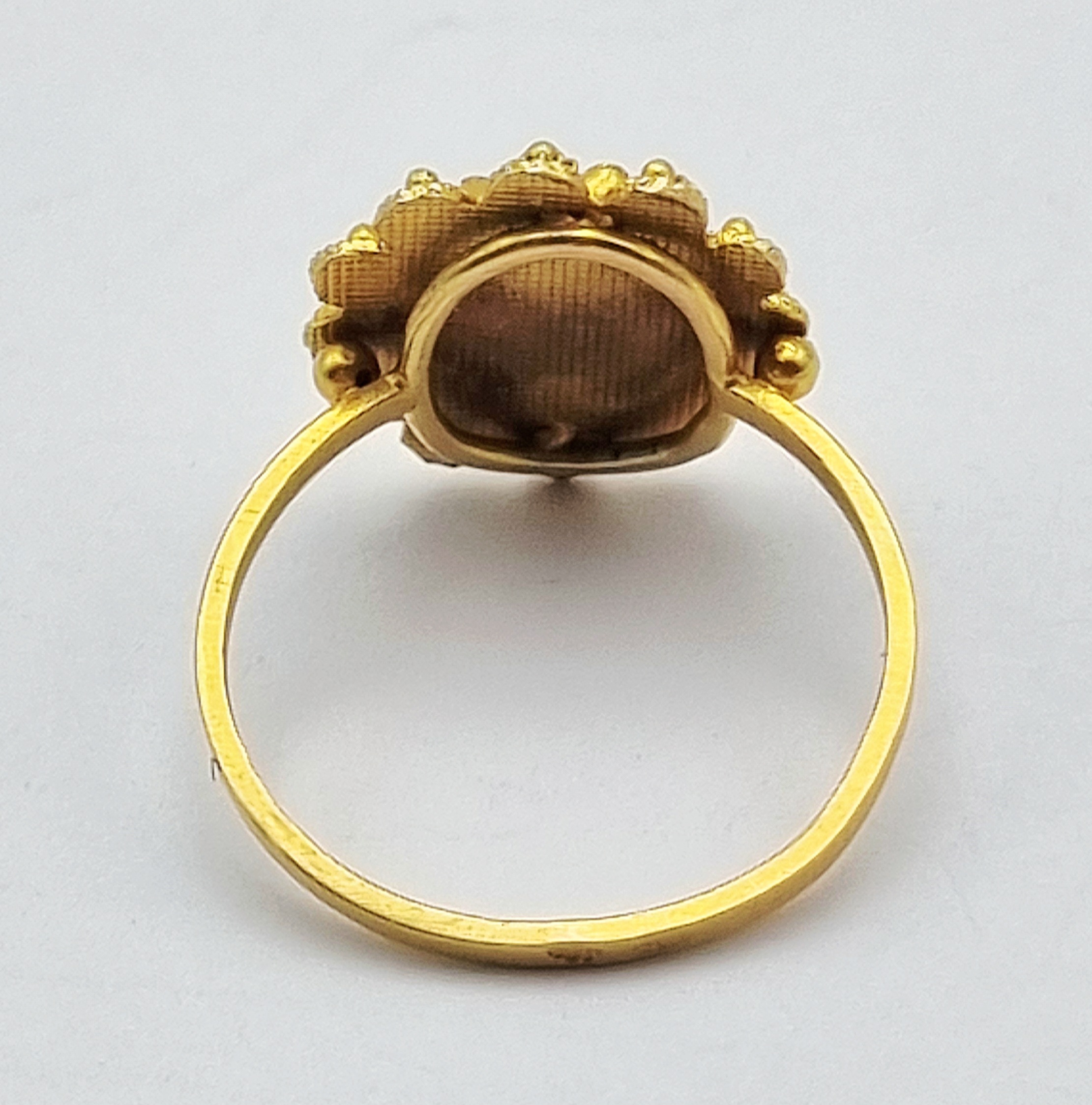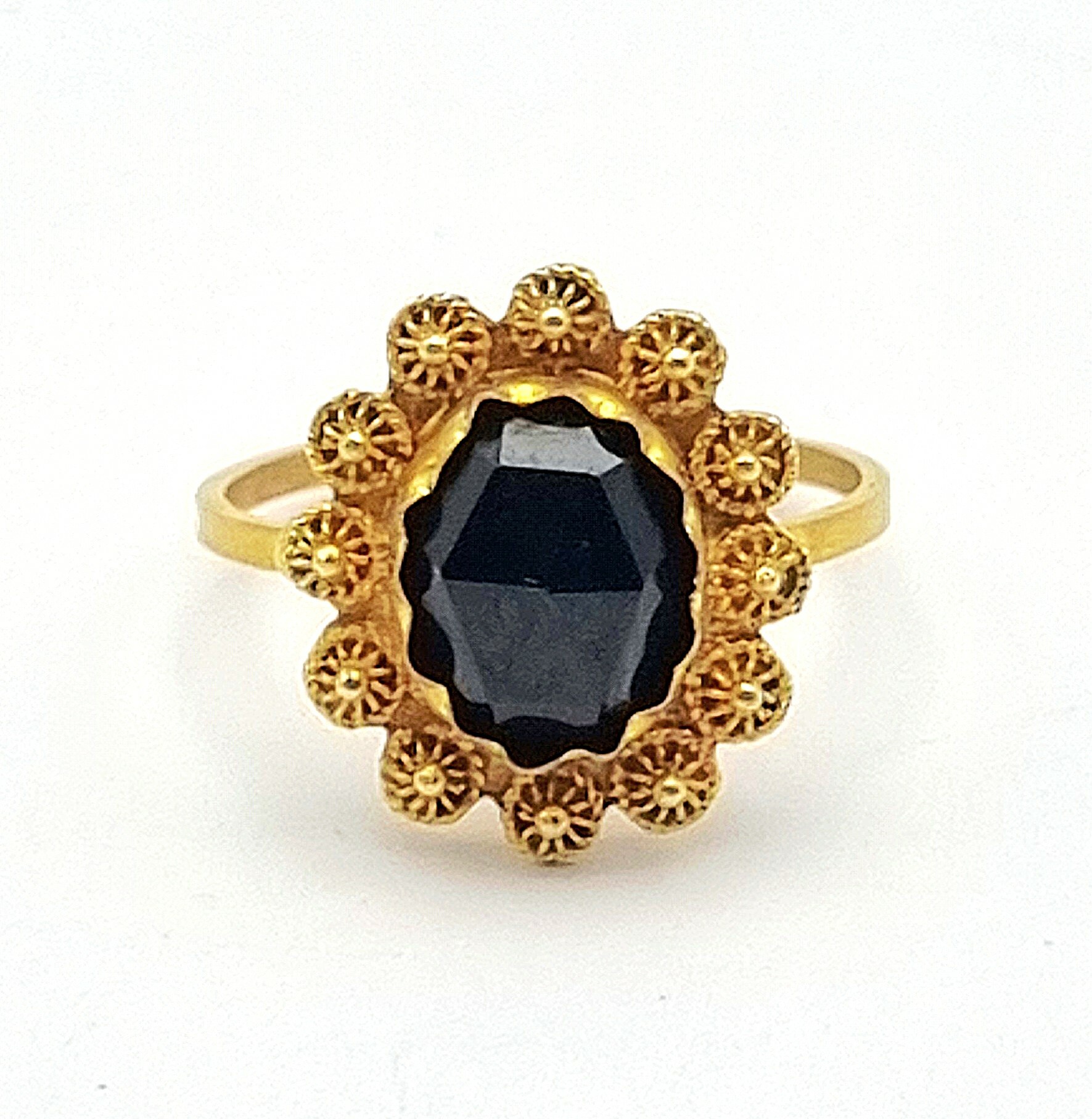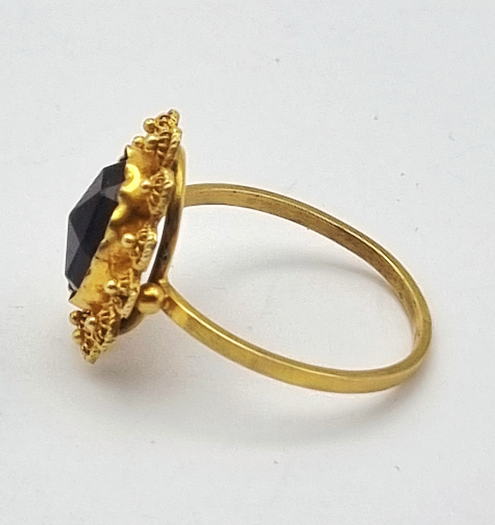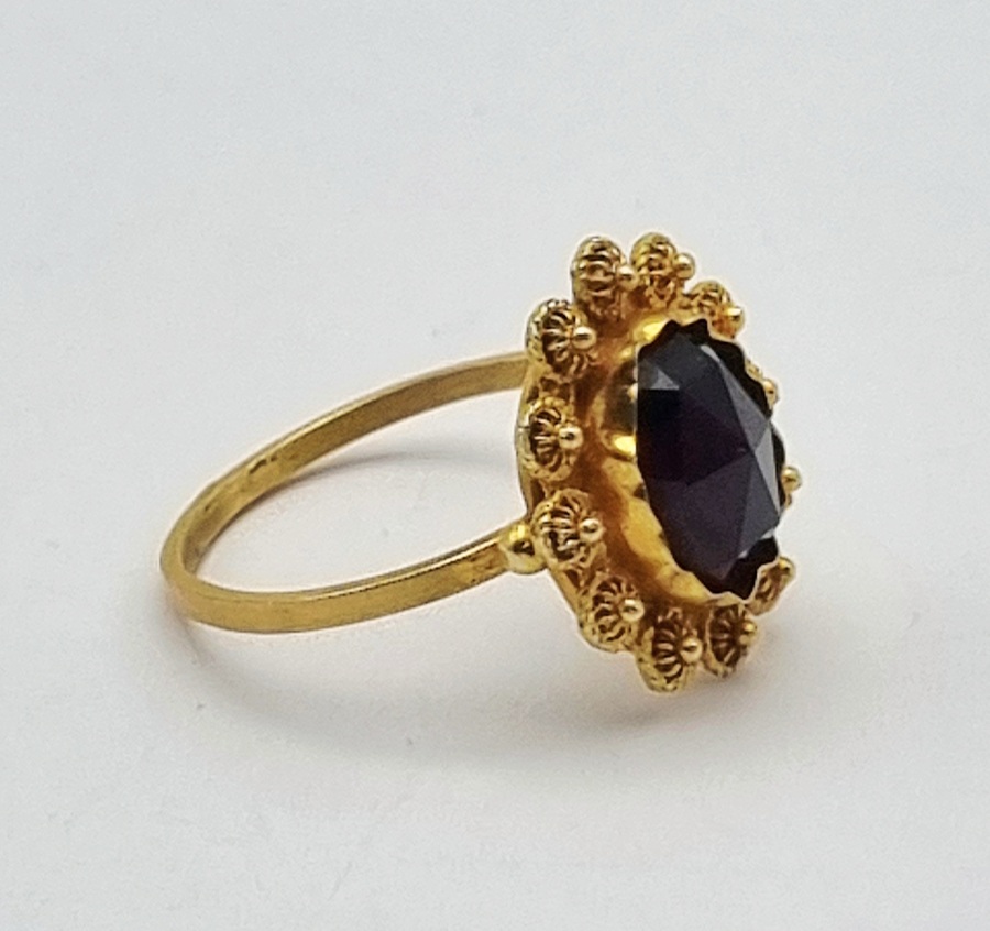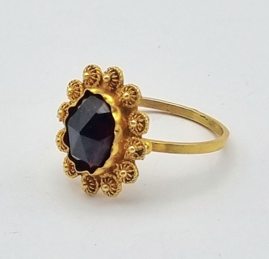 14-karaats gouden ring met trapslijpsel granaat en filigraan, 20e eeuw
