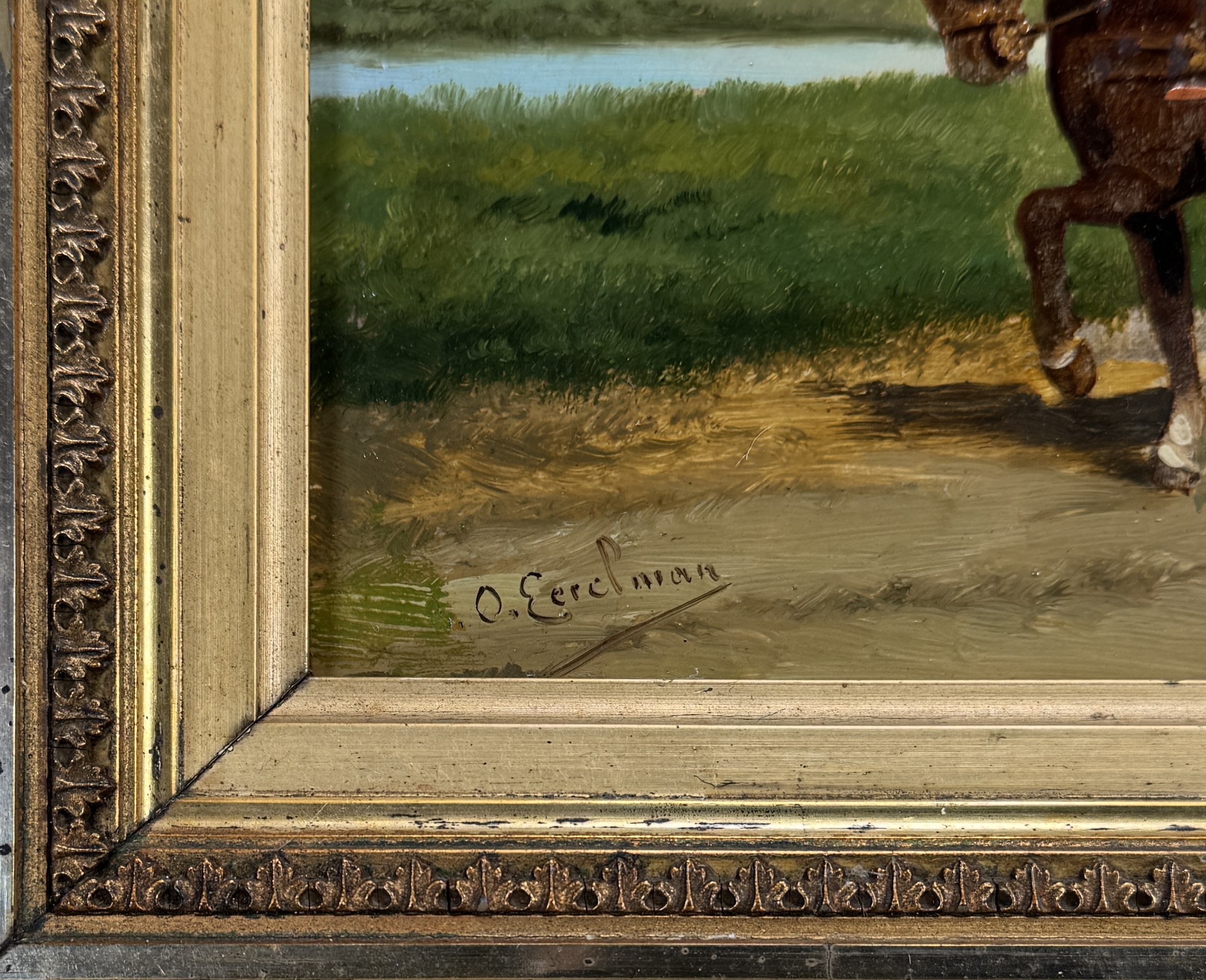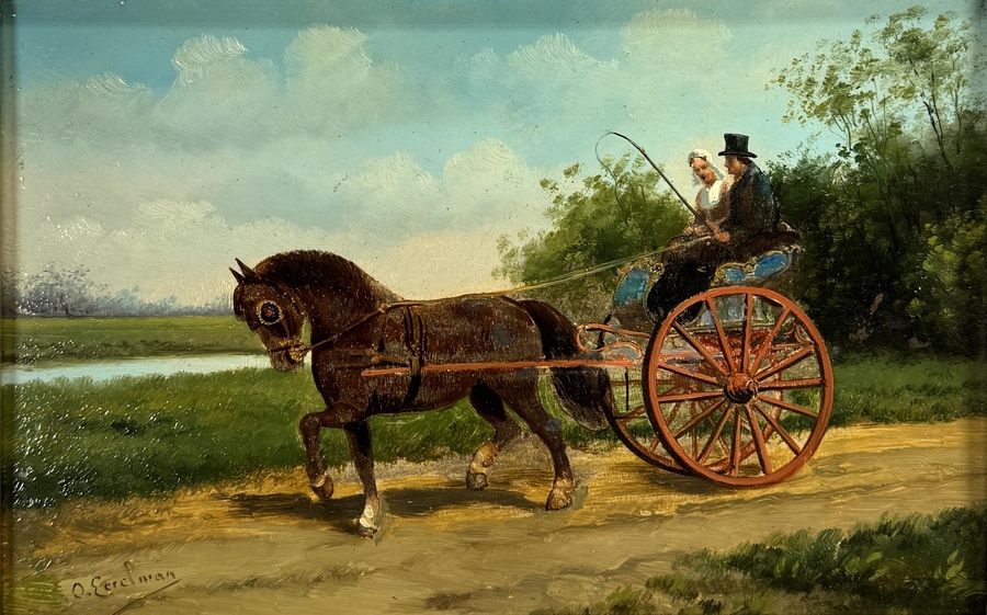 Schilderij naar Otto Eerelman, olieverf op paneel, toont een bruin tuigpaard met open rijtuig en twee figuren op een zandweg langs het water. Linksonder gesigneerd O. Eerelman, datering circa 1880–1900, Nederlandse School. Geïnteresseerd? Bezoek onze kijkdagen van 11:00 tot 17:00 uur! |