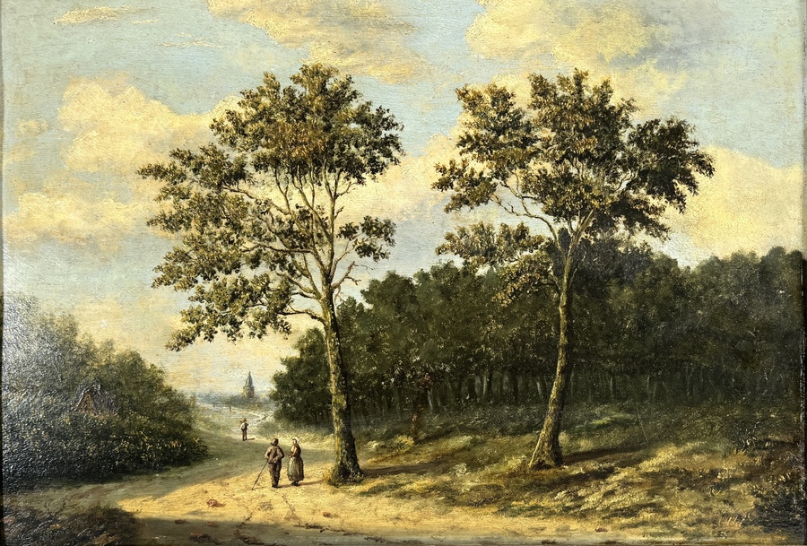 Schilderij in de stijl van B.C. Koekkoek (1803–1862), uitgevoerd in olieverf op hardboard, toont een romantisch boslandschap met wandelaars op een zandpad. Het schilderij dateert uit de 20e eeuw en heeft een Nederlandse herkomst. Ingelijst in een houten lijst. Geïnteresseerd? Bezoek onze kijkdagen op 10, 11 en 12 april van 11:00 tot 17:00 uur! |