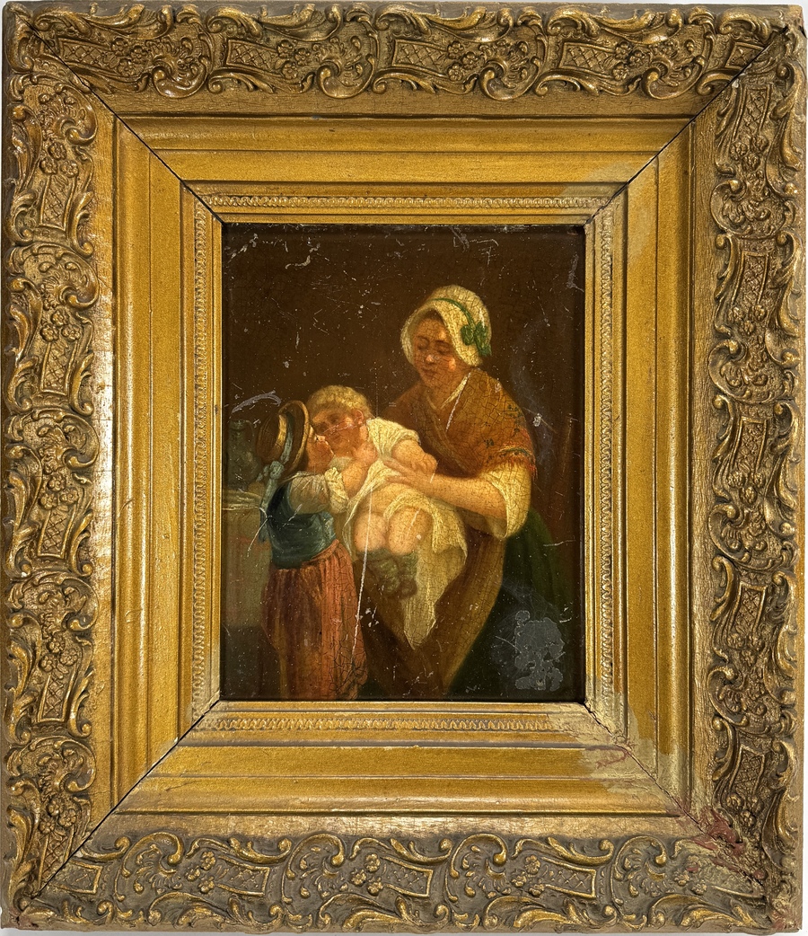 Schilderij uitgevoerd in olieverf op paneel, toont een genretafereel met een moeder en twee kinderen. De moeder houdt een zuigeling vast, terwijl een tweede kind met strohoed contact zoekt. Datering 19e eeuw en geplaatst in een rijk gedecoreerde goudkleurige lijst met florale decoratie. Geïnteresseerd? Bezoek onze kijkdagen op 10, 11 en 12 april van 11:00 tot 17:00 uur! |