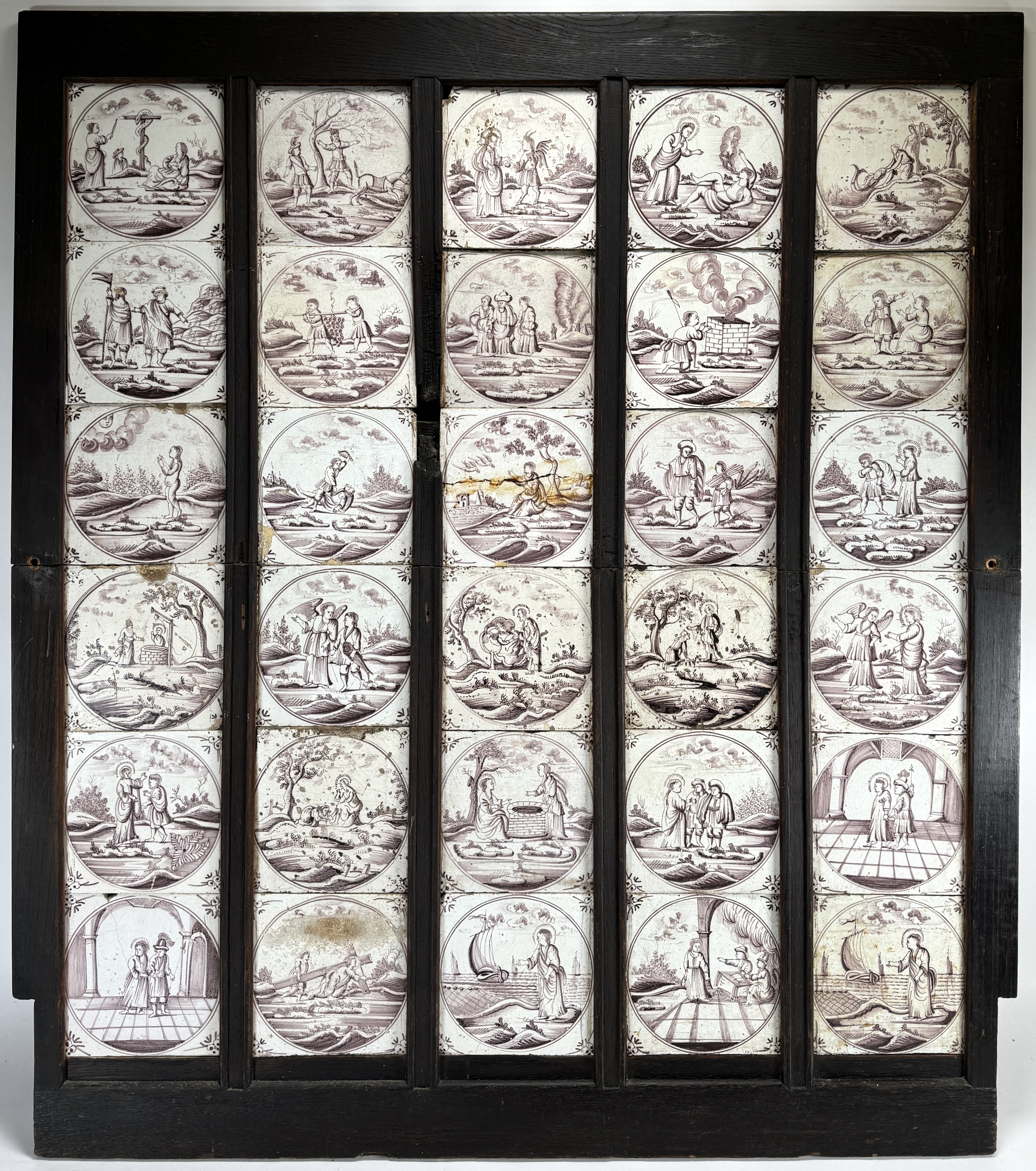 Tegeltableau uit de barokke periode, vervaardigd uit keramiek met handbeschilderde Bijbelse voorstellingen in mangaan. Het paneel bevat dertig tinglazuur tegels met diverse voorstellingen uit het Oude en Nieuwe Testament binnen cirkelvormige kaders en karakteristieke hoekmotieven. Het Delftse tableau dateert uit de 18e eeuw en heeft een Nederlandse herkomst, in een houten omlijsting. De tegels zelf beoordelen? Je bent welkom op onze kijkdagen op 10, 11 en 12 april! |