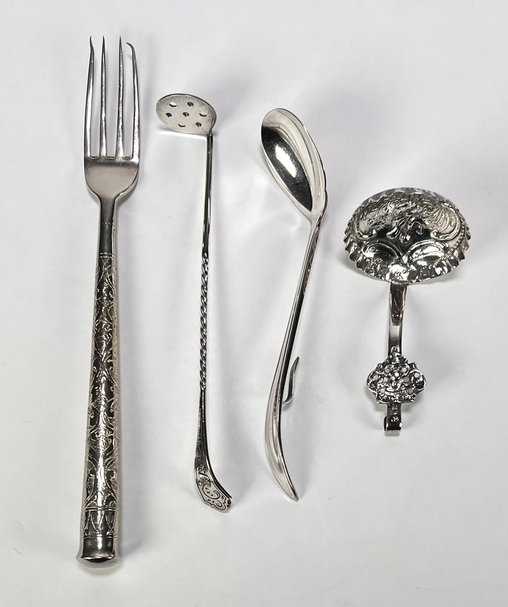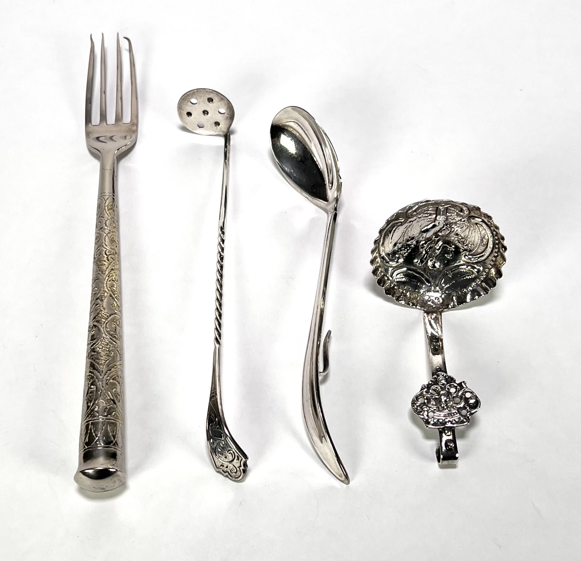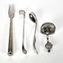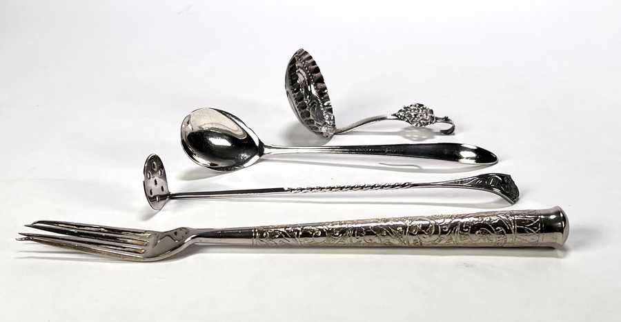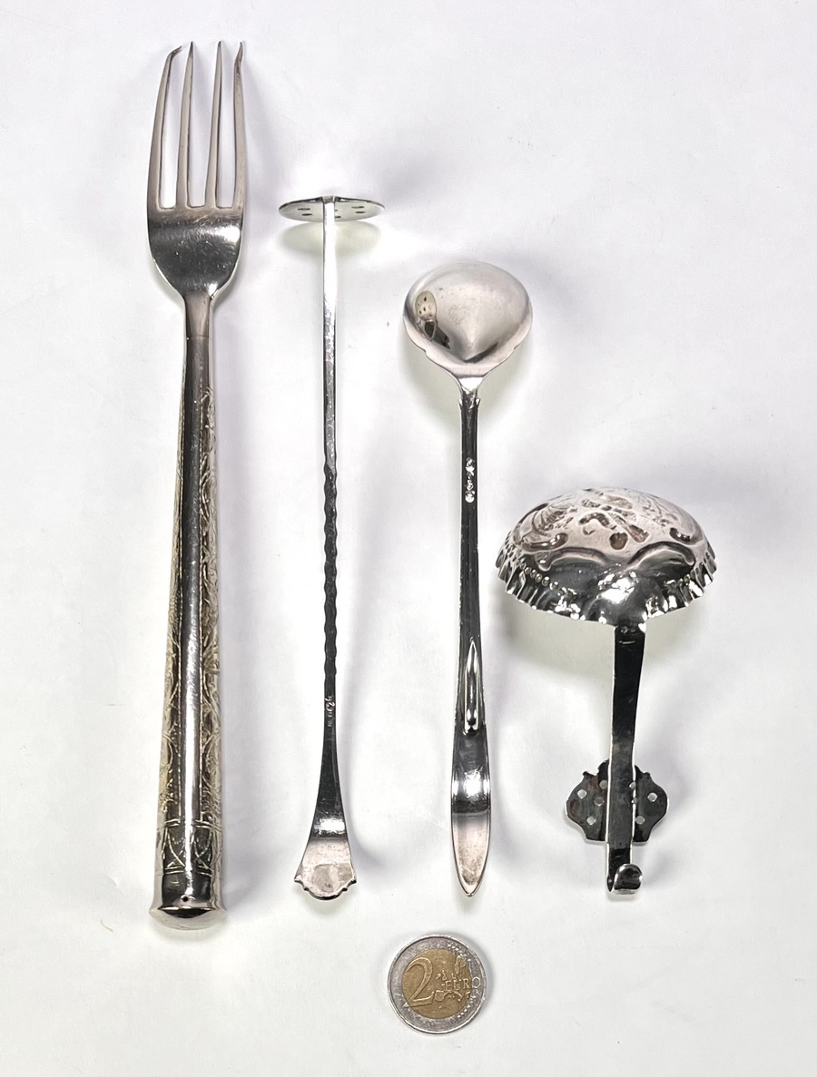 Zilveren en verzilverd tafelzilver; een zilveren roomlepel uit de Art Nouveau periode, vervaardigd uit 835/1000 zilver, gemerkt met lopende leeuw II, minervakop en jaarletter A (1910), een pleet vork met gedreven bloemdecor, een geperforeerde pleet lepel en een ovale pleet roomlepel. Gedateerd 1880–1920 Geïnteresseerd? Bezoek onze kijkdagen op 10, 11 en 12 april van 11:00 tot 17:00 uur! . |