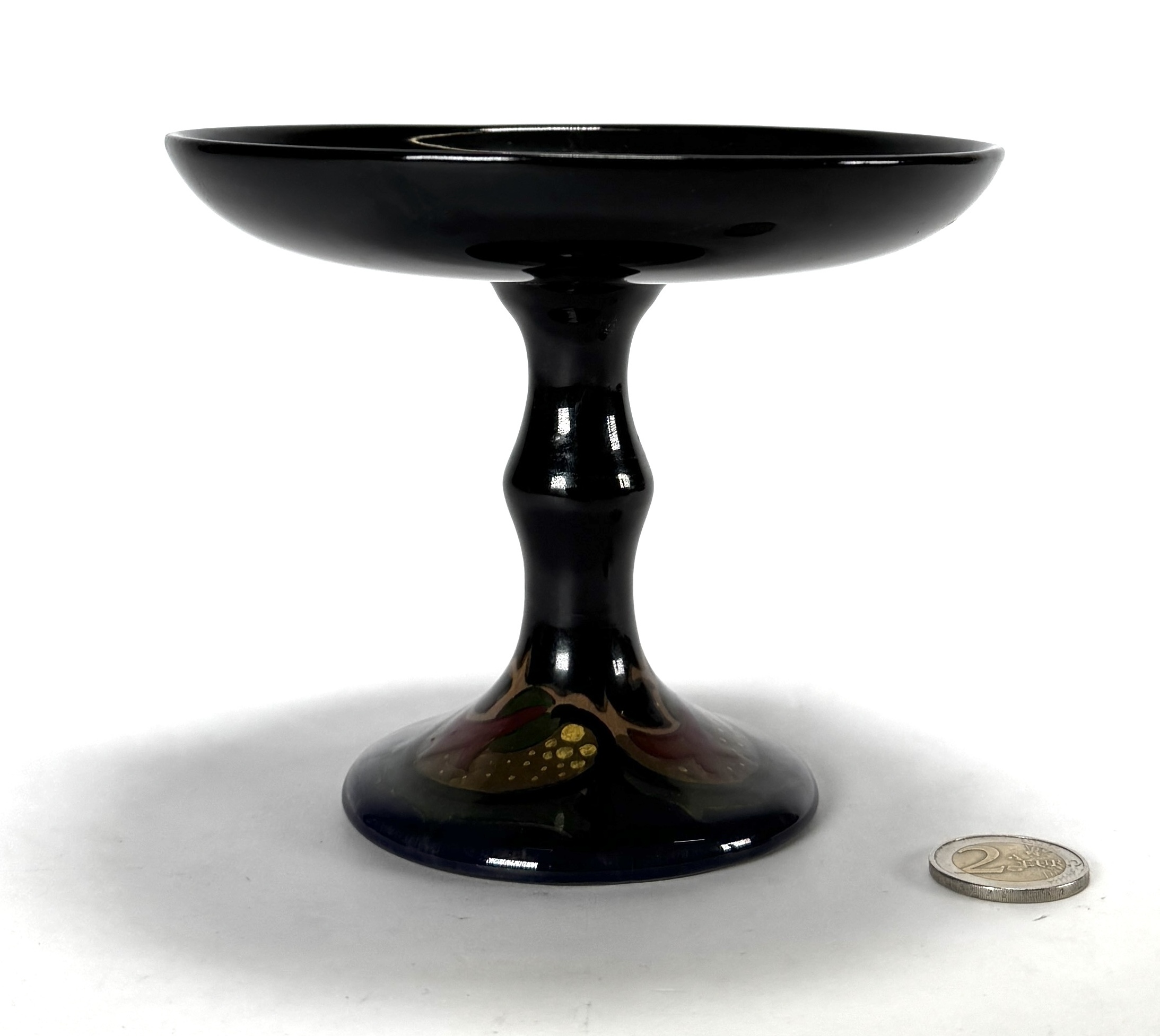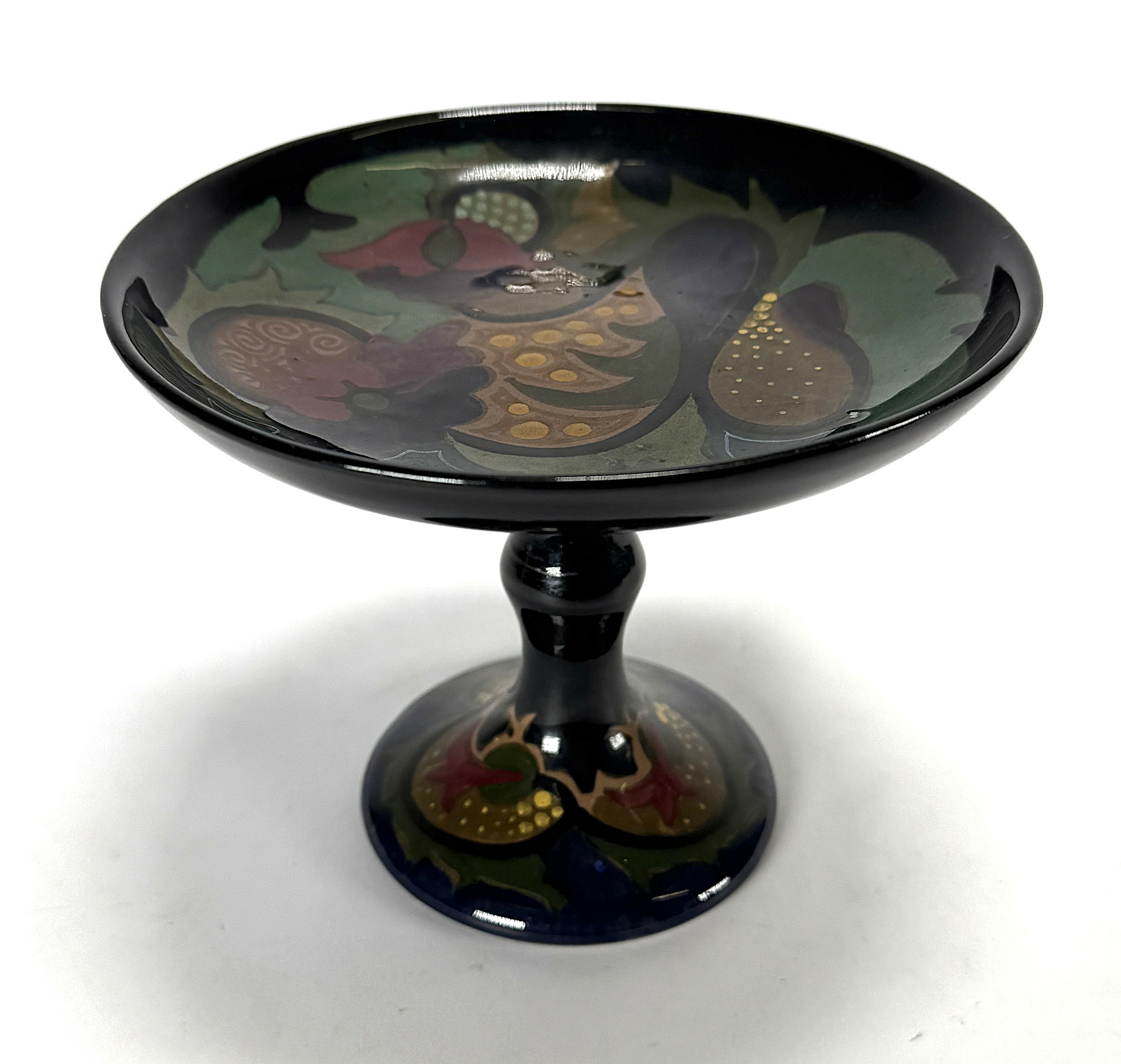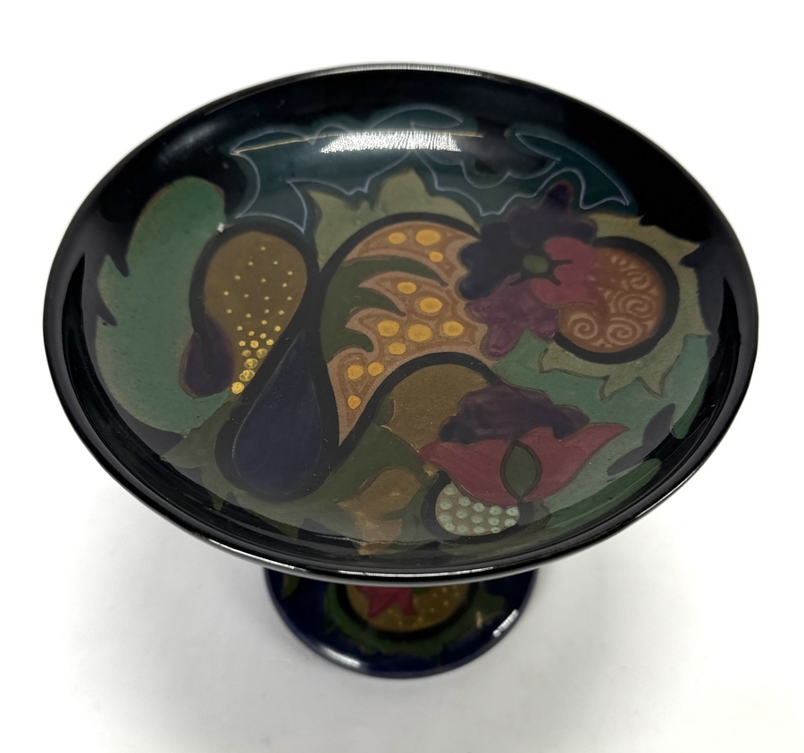 Plateel serveerschaal op voet van Plateelbakkerij Zuid-Holland uit de Art Deco periode, vervaardigd uit handbeschilderd aardewerk. De schaal op hoge balustervormige voet toont een polychroom vruchtendecor tegen een diepzwart hoogglans fond. De onderzijde is gemerkt met het fabriekslogo, modelnummer 754 en schildersinitialen. De serveerschaal dateert uit circa 1925 en heeft een Nederlandse herkomst. Geïnteresseerd? Bezoek onze kijkdagen op 10, 11 en 12 april van 11:00 tot 17:00 uur! |