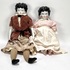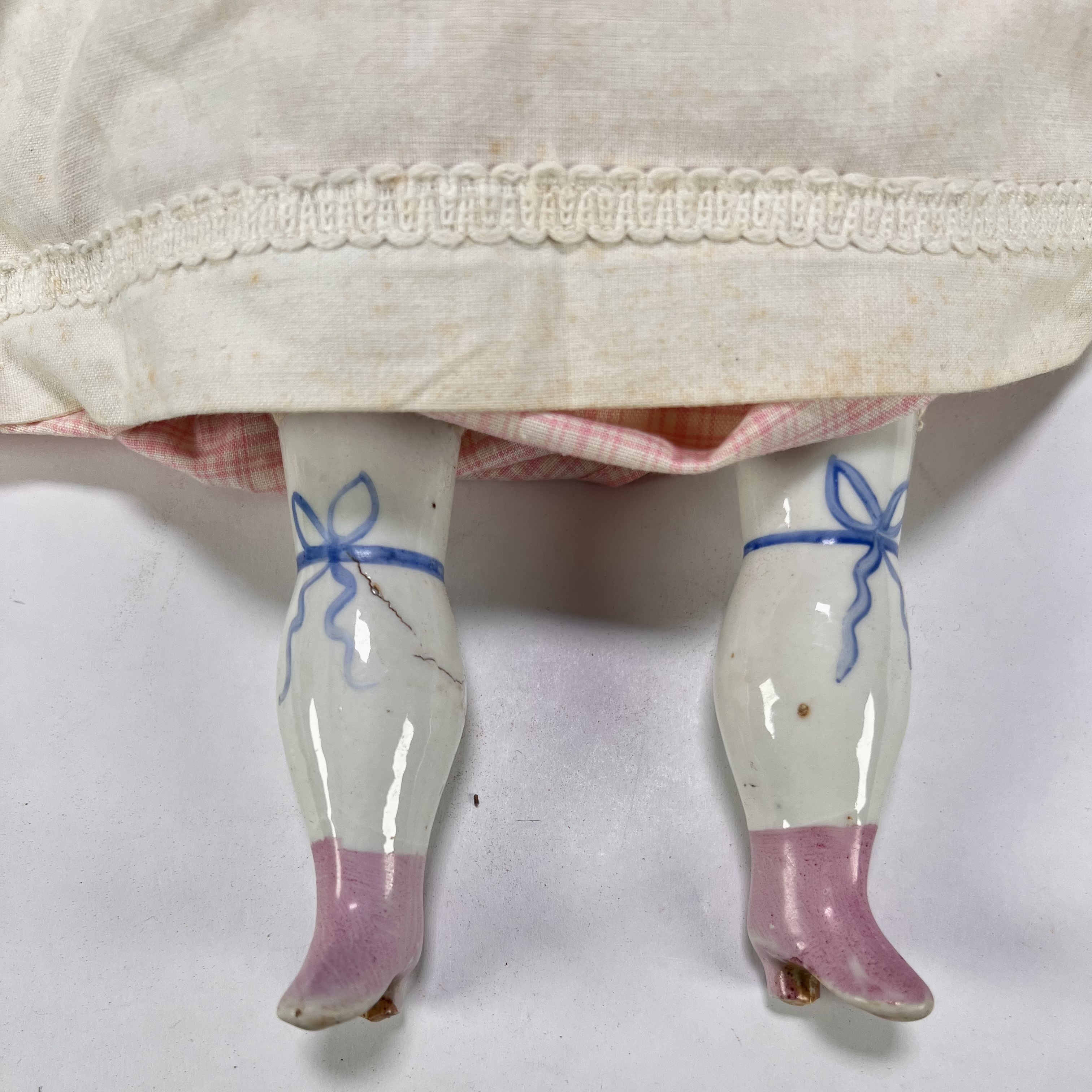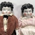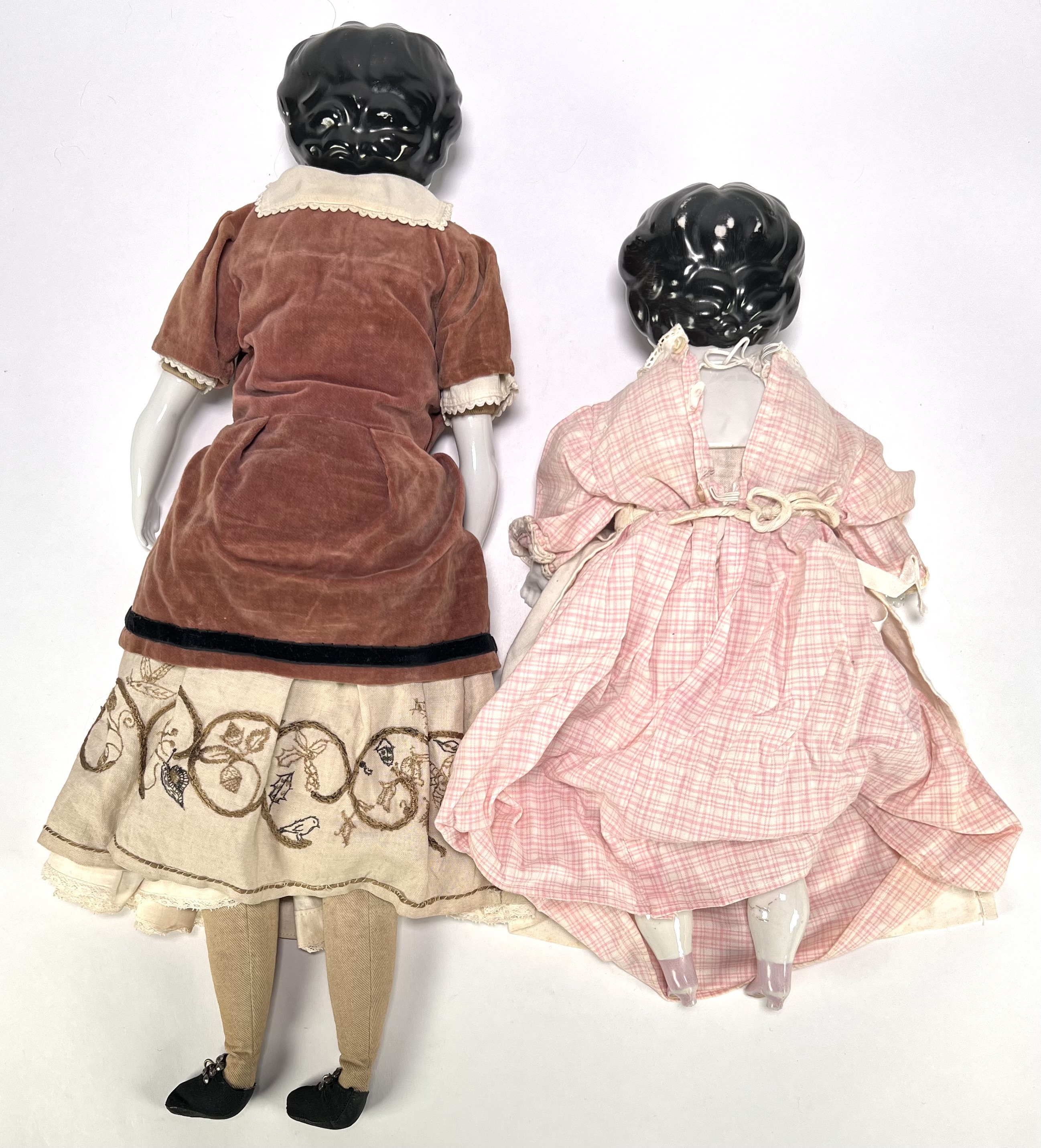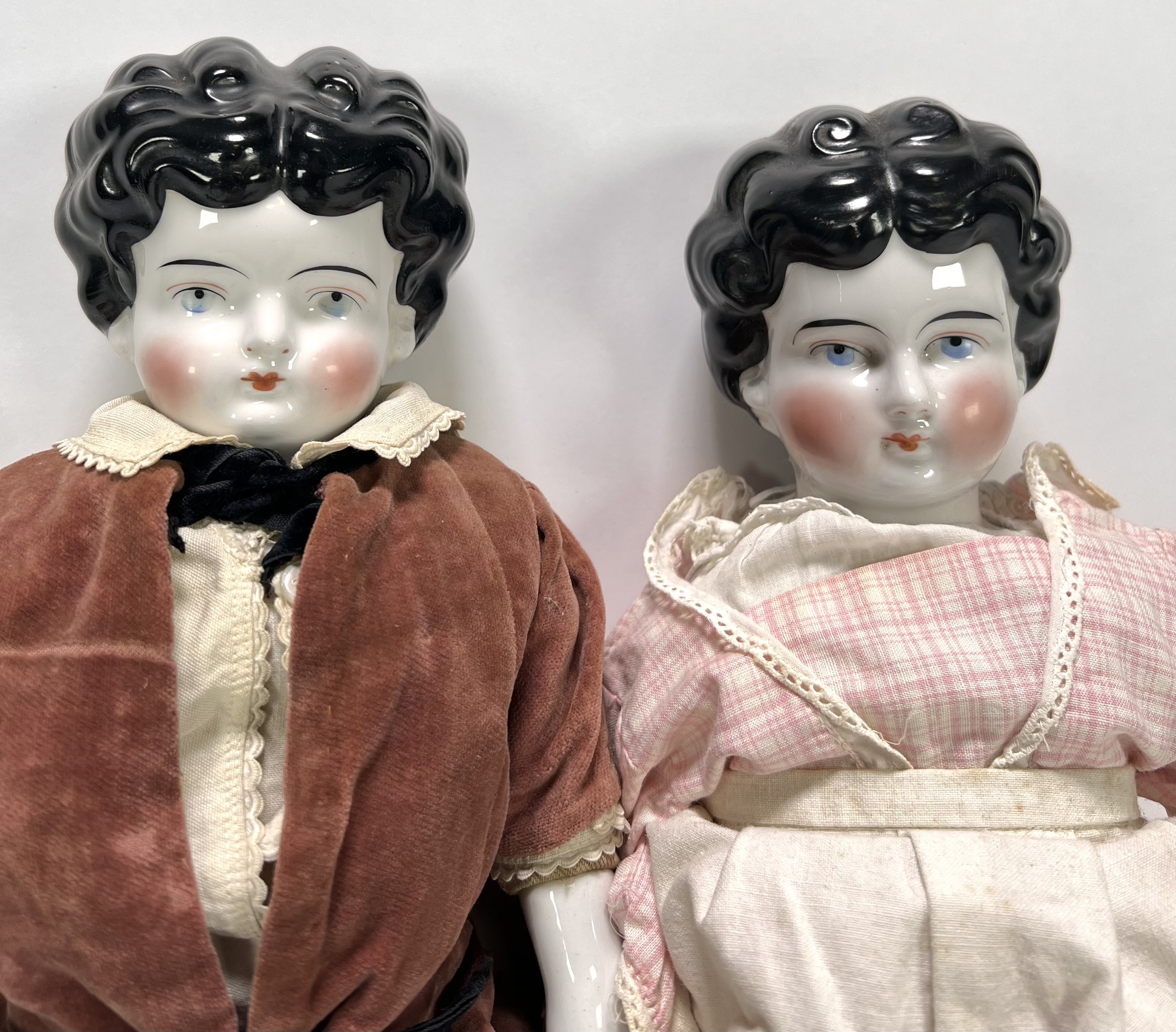 Poppen vervaardigd uit geglazuurd porselein en textiel. De porseleinen hoofden tonen karakteristieke zwart gemodelleerde krullen en handbeschilderde gelaatstrekken, de porseleinen onderbenen zijn gedecoreerd met blauwe strikken en roze laarsjes. Beide poppen zijn gekleed in historiserende kostuums van fluweel en katoen. De poppen dateren uit circa 1900. Kom langs tijdens de kijkdagen (10 t/m 12 april) en ontdek de poppen zelf! |