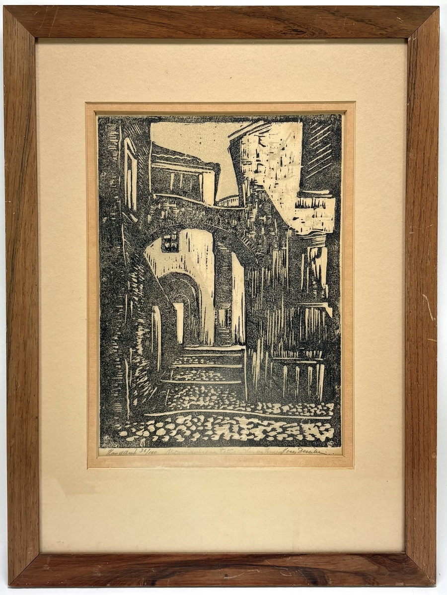 Houtsnede uitgevoerd op papier door Jan Frederik van Deventer (1822-1886), toont een straatgezicht in expressionistische stijl. Onder de voorstelling rechtsonder gesigneerd in potlood en midden onder onduidelijk getiteld, met oplagenummer 36/100 linksonder. De ets dateert van ca. 1860 en heeft een Nederlandse herkomst. Eerst deze houtsnede zien voordat je biedt? Bezoek onze kijkdagen op 10, 11 en 12 april! |