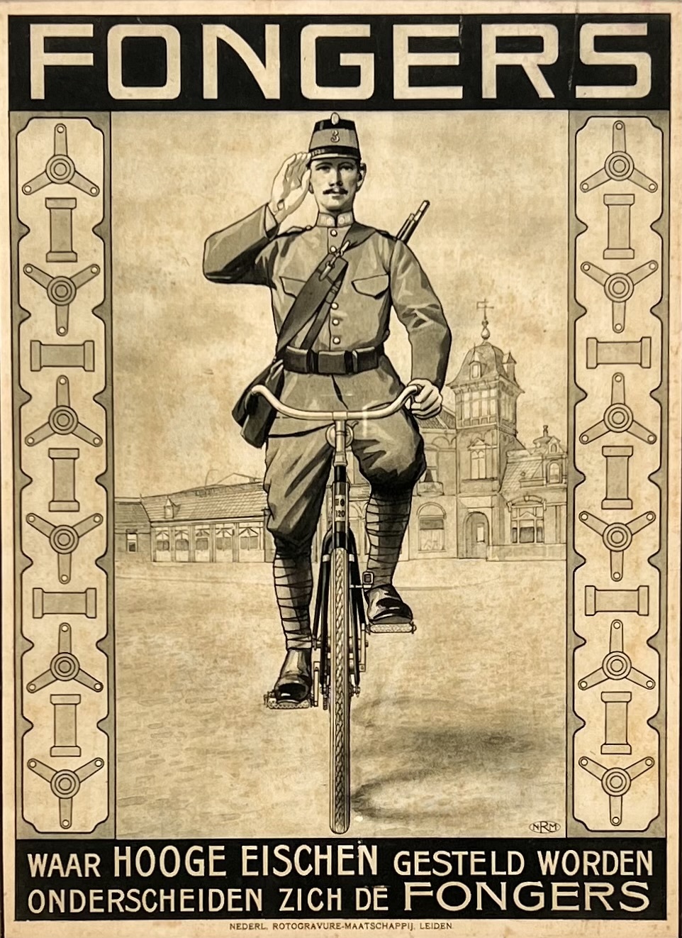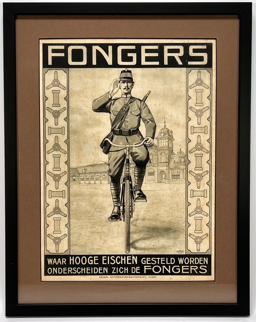 Affiche van Fongers, uit de vroeg-modernistische periode, vervaardigd uit papier met druktechniek in zwart-beige tinten. Te zien zijn een saluerende militair op een rijwiel, fabrieksbebouwing op de achtergrond en repeterende zijpanelen met gestileerde fietsonderdelen, met de tekst "waar hooge eischen gesteld worden, onderscheiden zich de Fongers". Onderaan gedrukt Nederl. Rotogravure-Maatschappij, Leiden, met NRM-monogram rechtsonder. De affiche dateert uit ca. 1920 en heeft een Nederlandse herkomst. Geïnteresseerd? Bezoek onze kijkdagen op 10, 11 en 12 april van 11:00 tot 17:00 uur! |