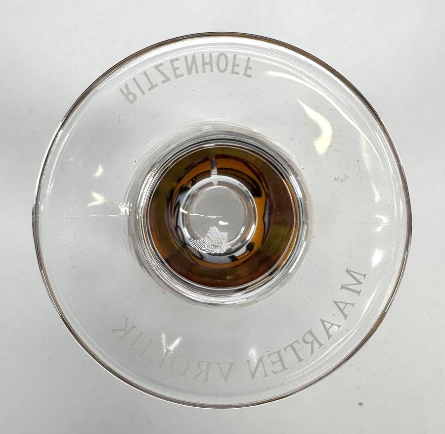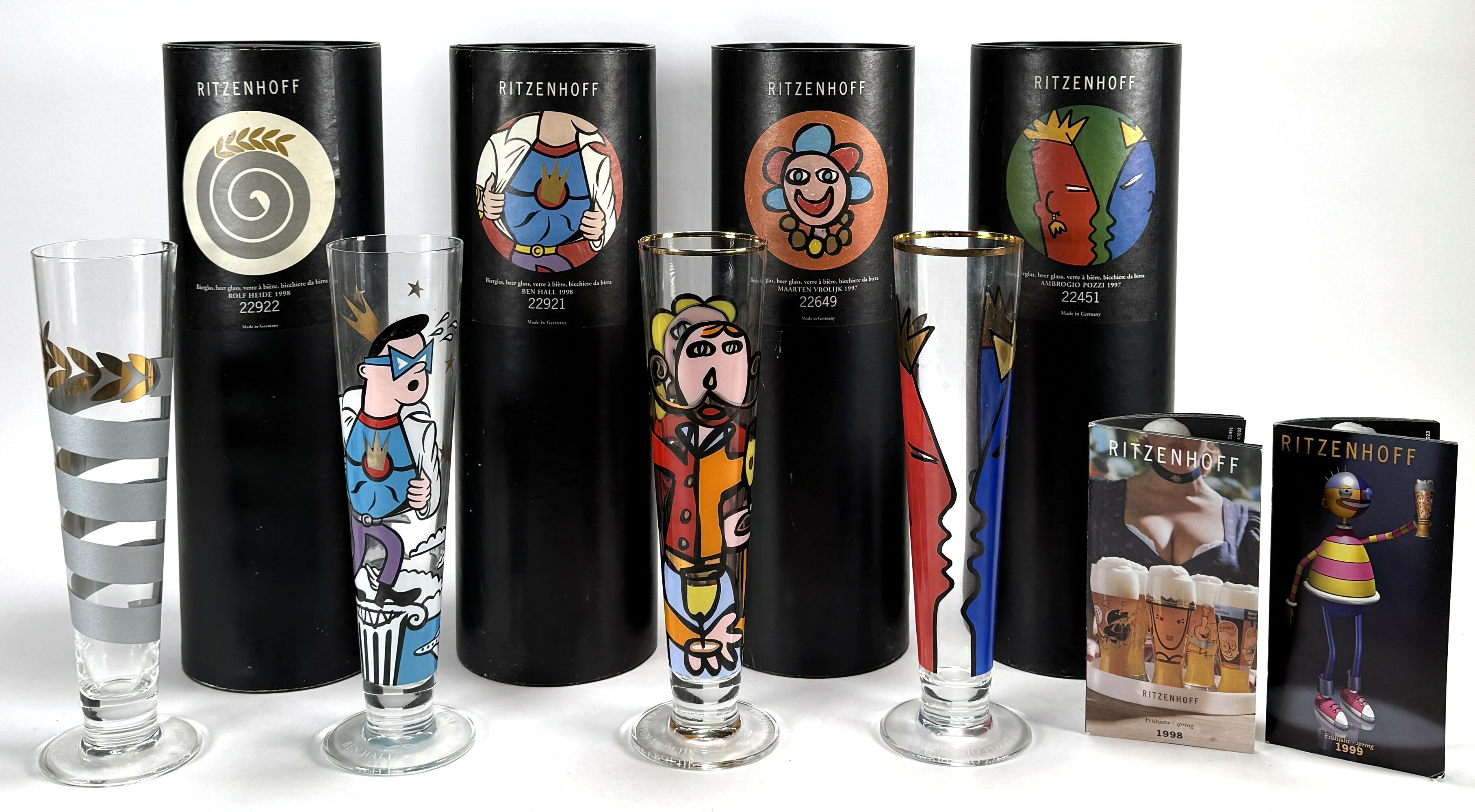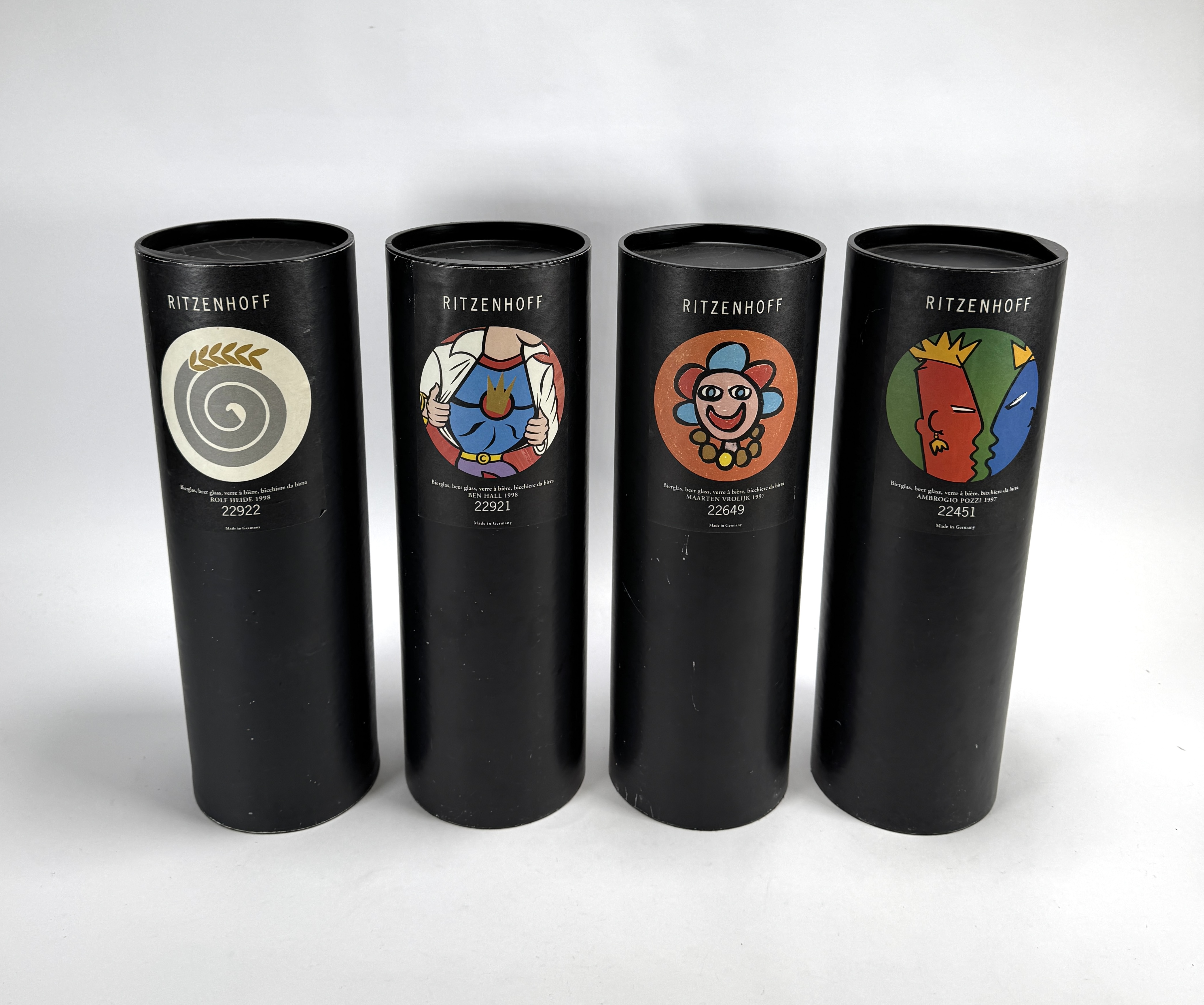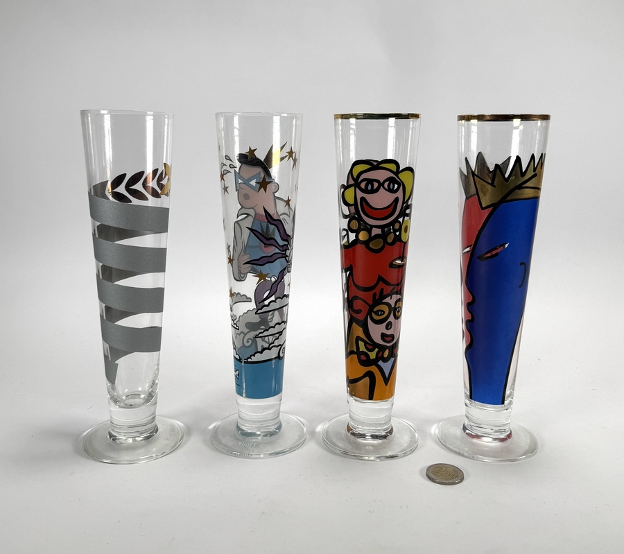 Kristallen bierglazen van Ritzenhoff tonen een variëteit aan artistieke stijlen naar ontwerpen van Rolf Heide, Maarten Vrolijk, Ben Hall en Ambrogio Pozzi. De decors variëren van Pop Art figuren tot grafische profielen met goudkleurige accenten. De glazen dateren uit 1997–1998 en hebben een Duitse herkomst, gemerkt op voet. Inclusief bijbehorende kokers en boekjes van de betreffende edities. De glazen zelf beoordelen? Je bent welkom op onze kijkdagen op 10, 11 en 12 april! |