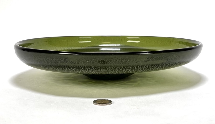 Schaal door A.D. Copier (1901-1991) vervaardigd uit glas met tincraquelé techniek, uitvoering Glasfabriek Leerdam. De lage vorm in mosgroene tint toont een fijnmazig netwerk van craquelé glazuur over het gehele oppervlak. Onderzijde gemerkt met geëtst monogram Copier, De schaal dateert uit circa 1930 en heeft een Nederlandse herkomst. Zeker zijn van deelname? Plaats vanaf 3 april een schriftelijk bod online! |