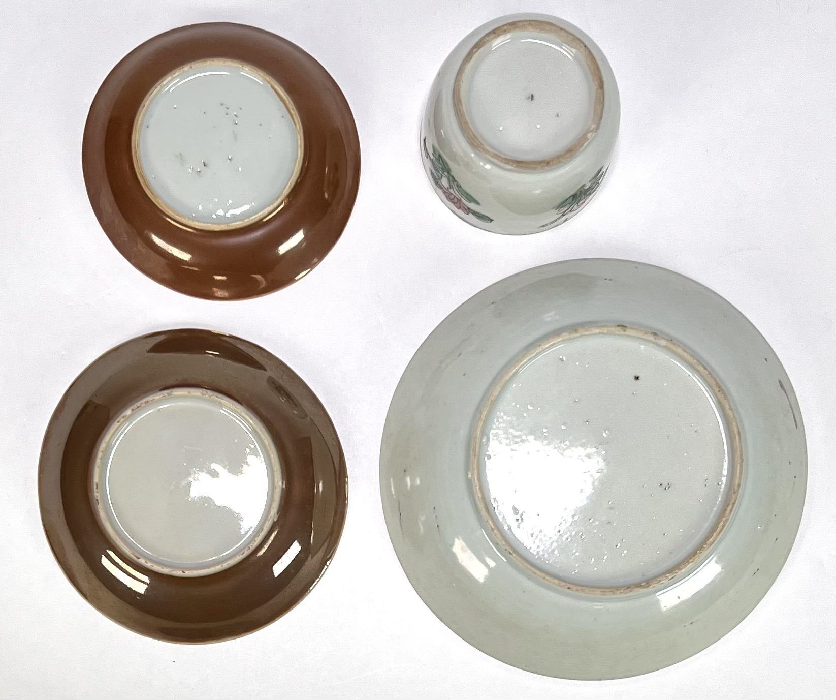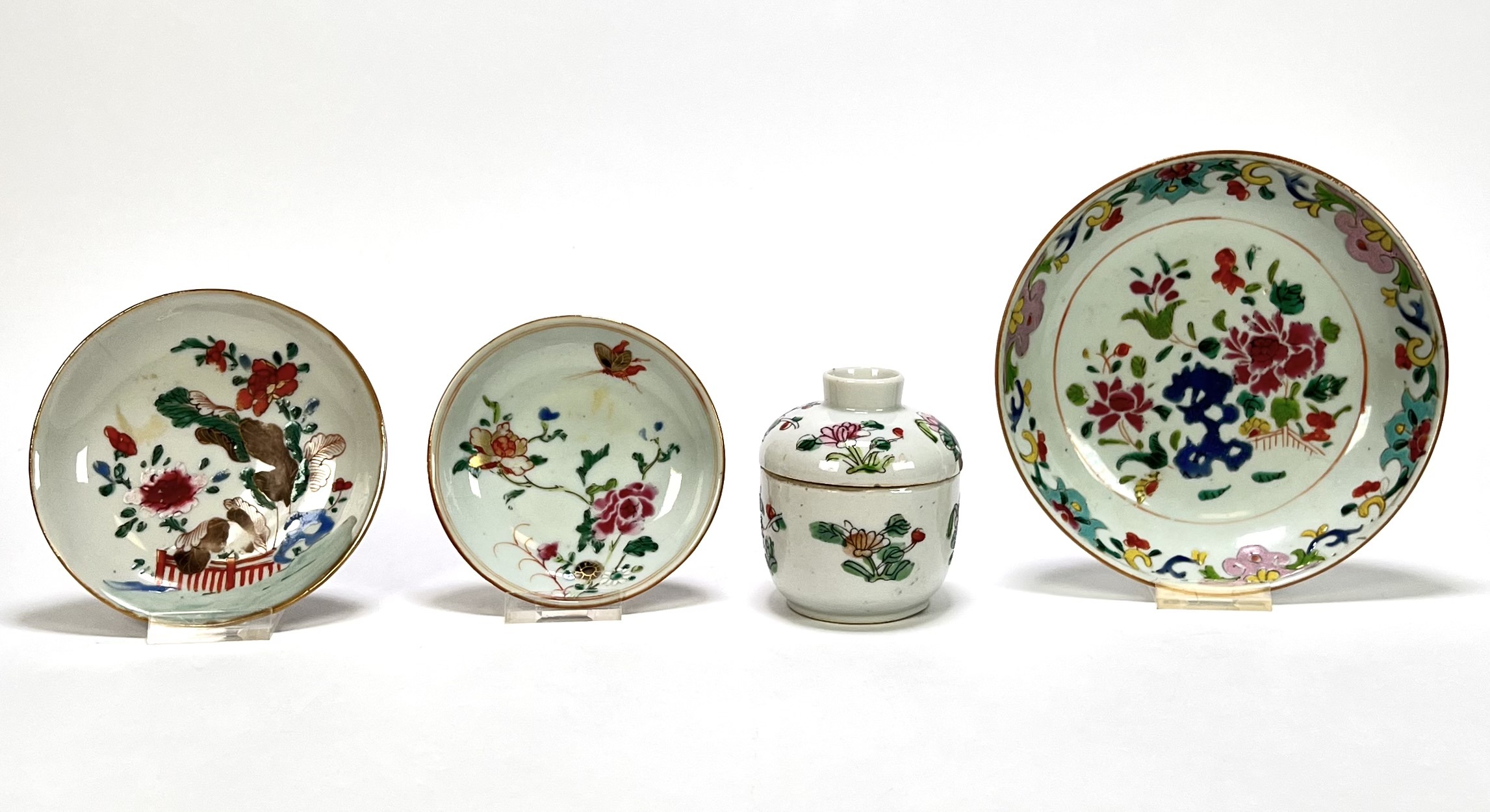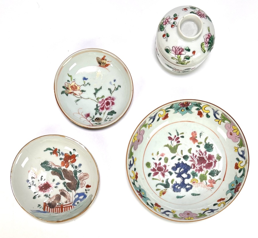 Convoluut van Chinees porselein uit de Qing dynastie, 18e eeuw, Jingdezhen productie. Bestaand uit twee schotels, een bord en een dekselpotje met polychrome famille rose decoratie van pioenrozen, vogelmotieven en een blauwe rotspartij. De schotel zijn uitgevoerd met een café-au-lait glazuur aan de buitenzijde. Bezoek onze kijkdagen op 10, 11 en 12 april van 11:00 tot 17:00 uur! |