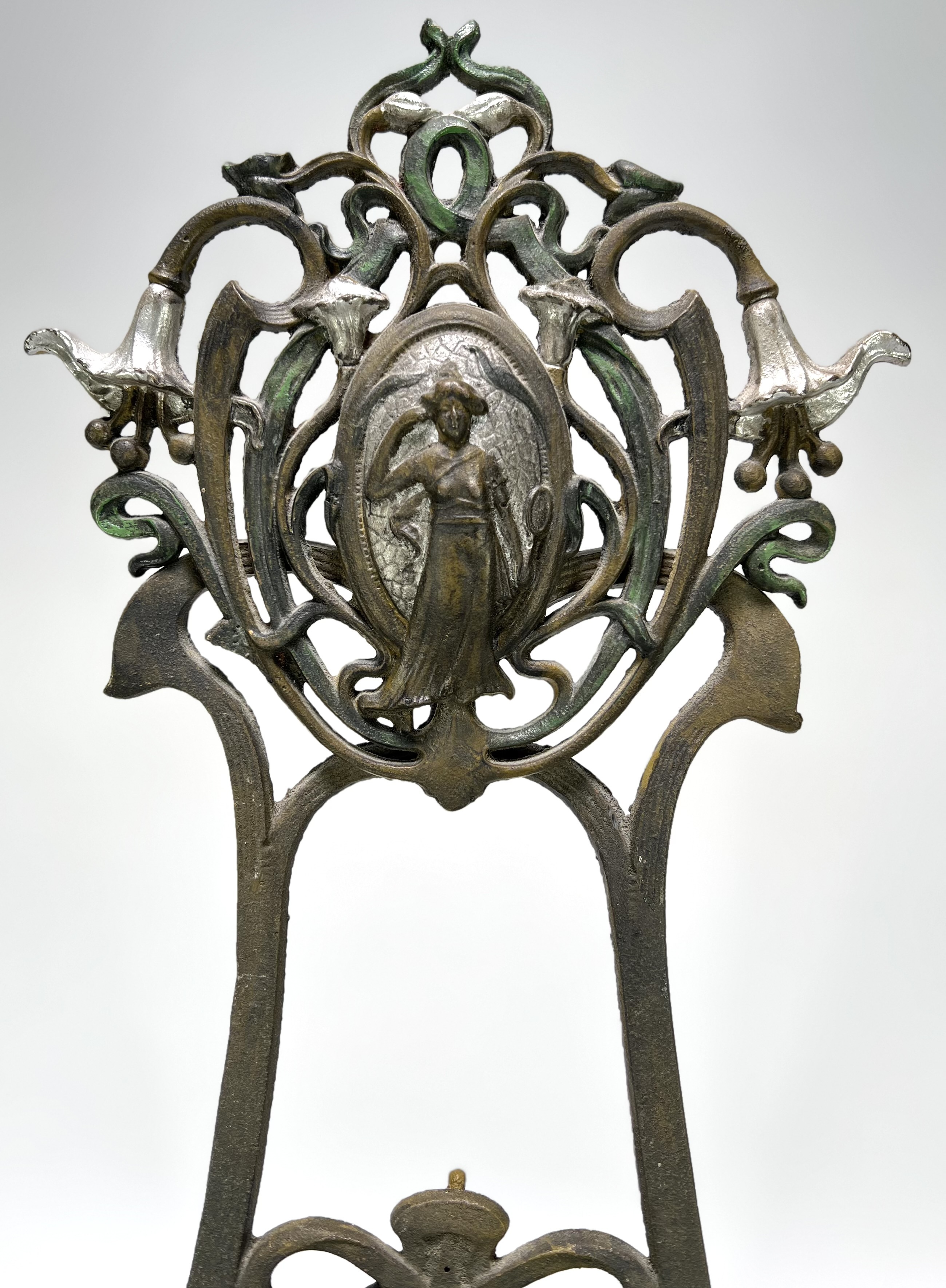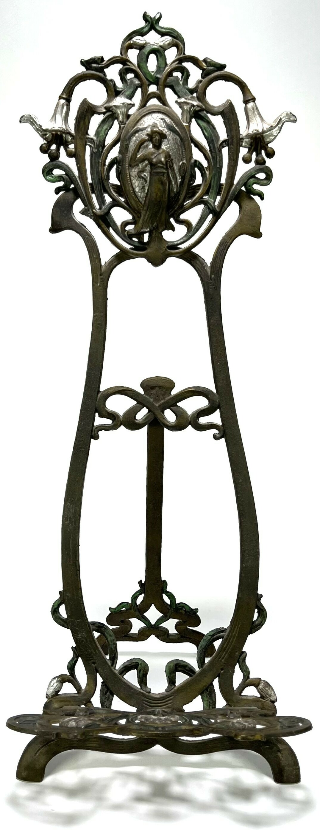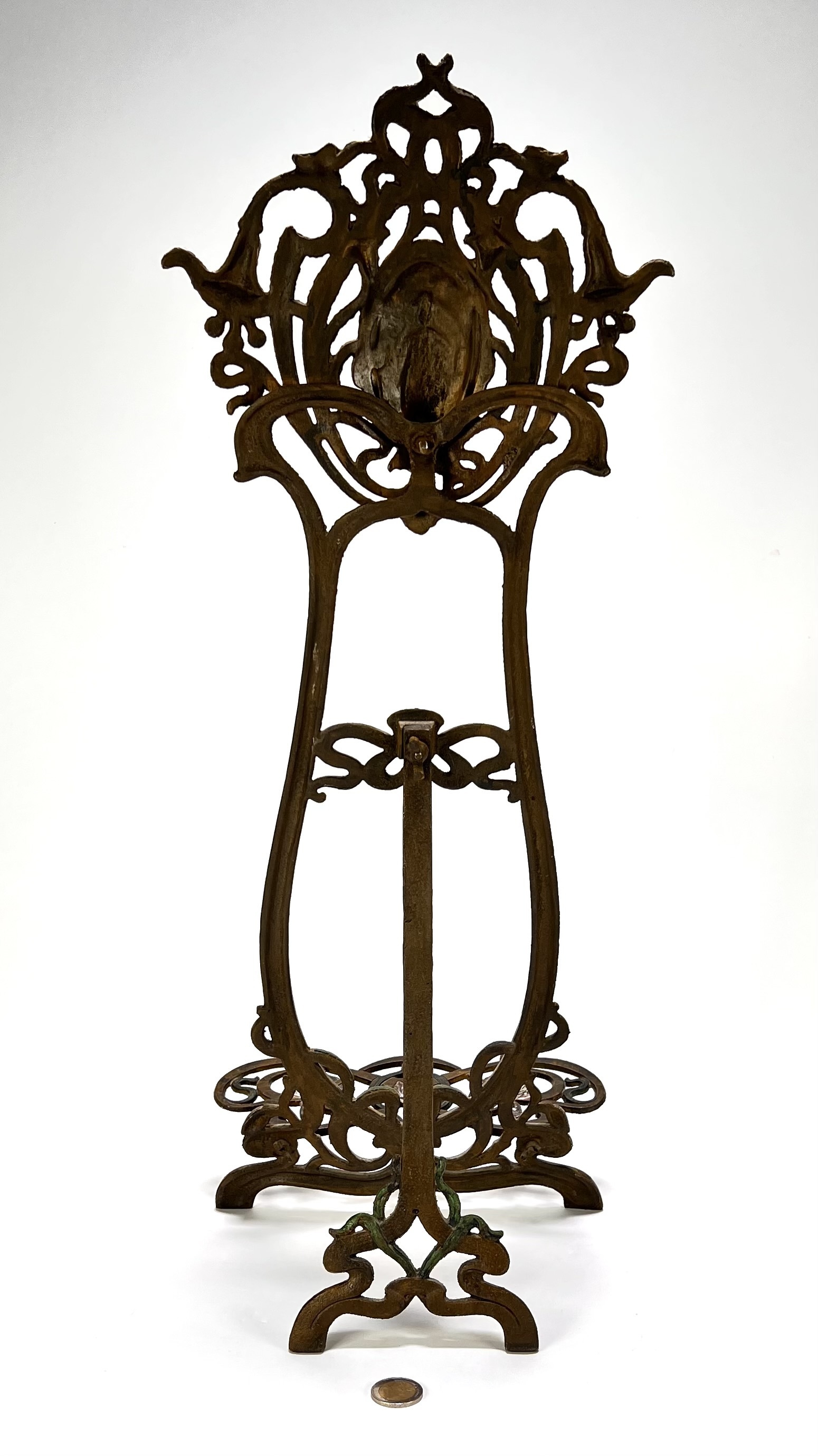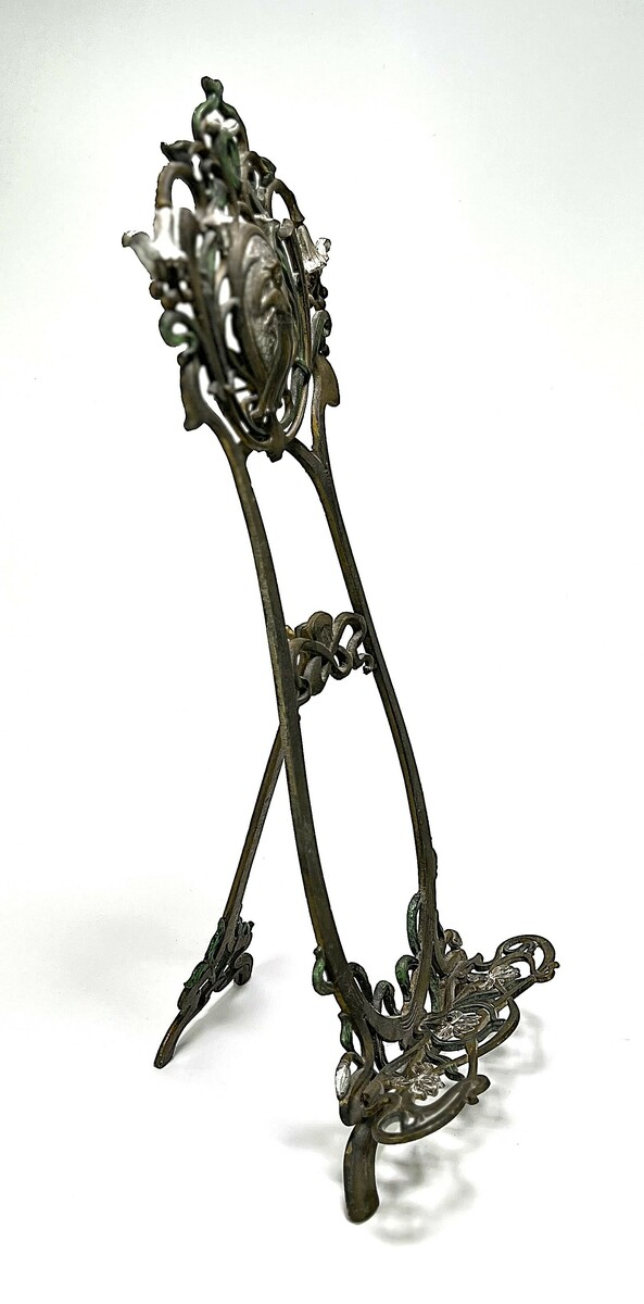 Art Nouveau schildersezel vervaardigd uit gietijzer met ajour gegoten ornamentiek. Het frame toont florale krullen en kelkvormige bloemen rond een ovaal reliëfmedaillon met vrouwelijke figuur. De schildersezel dateert uit circa 1900 en heeft een herkomst in West-Europa. Zeker zijn van deelname? Plaats vanaf 3 april een schriftelijk bod online! |